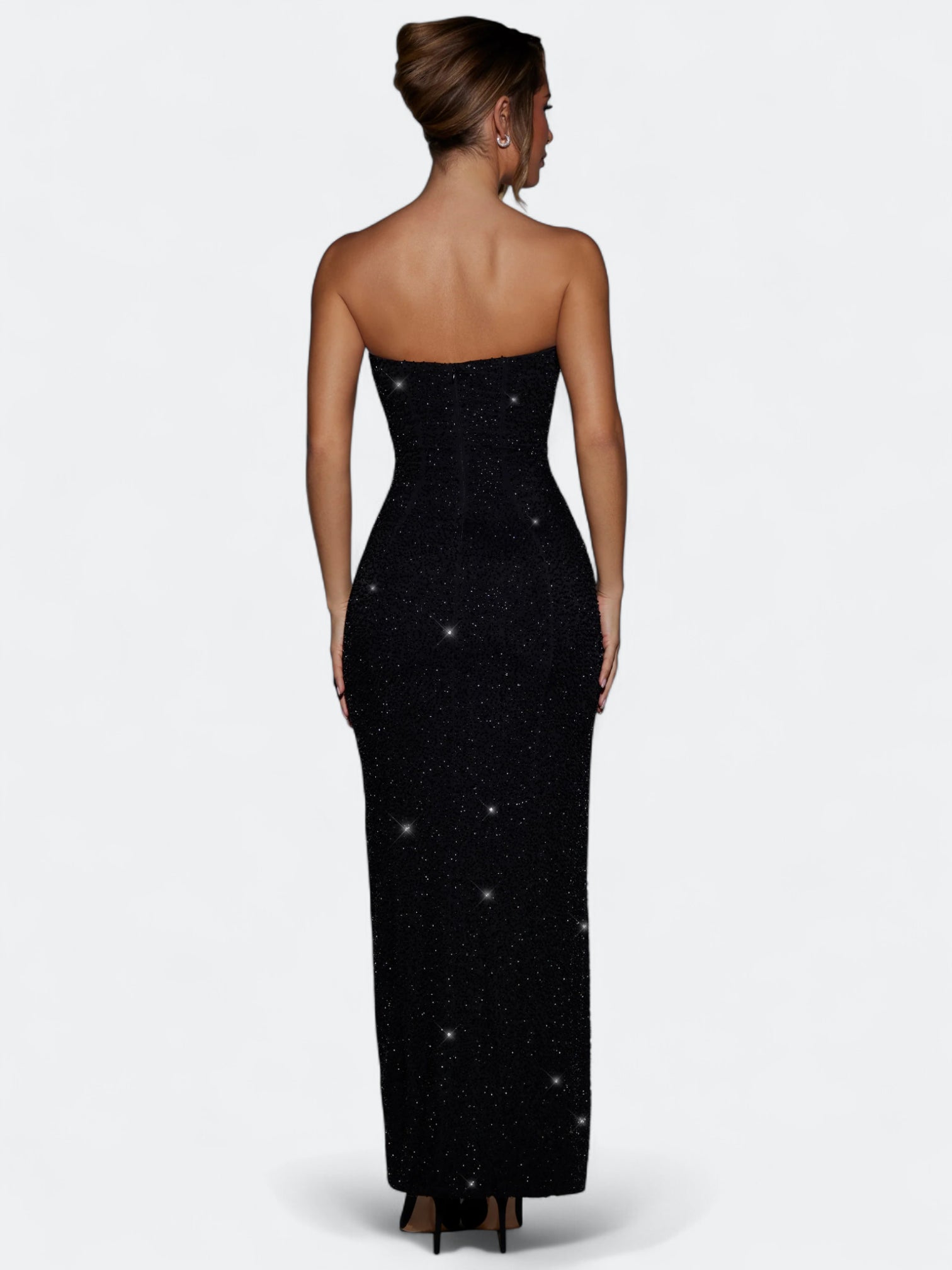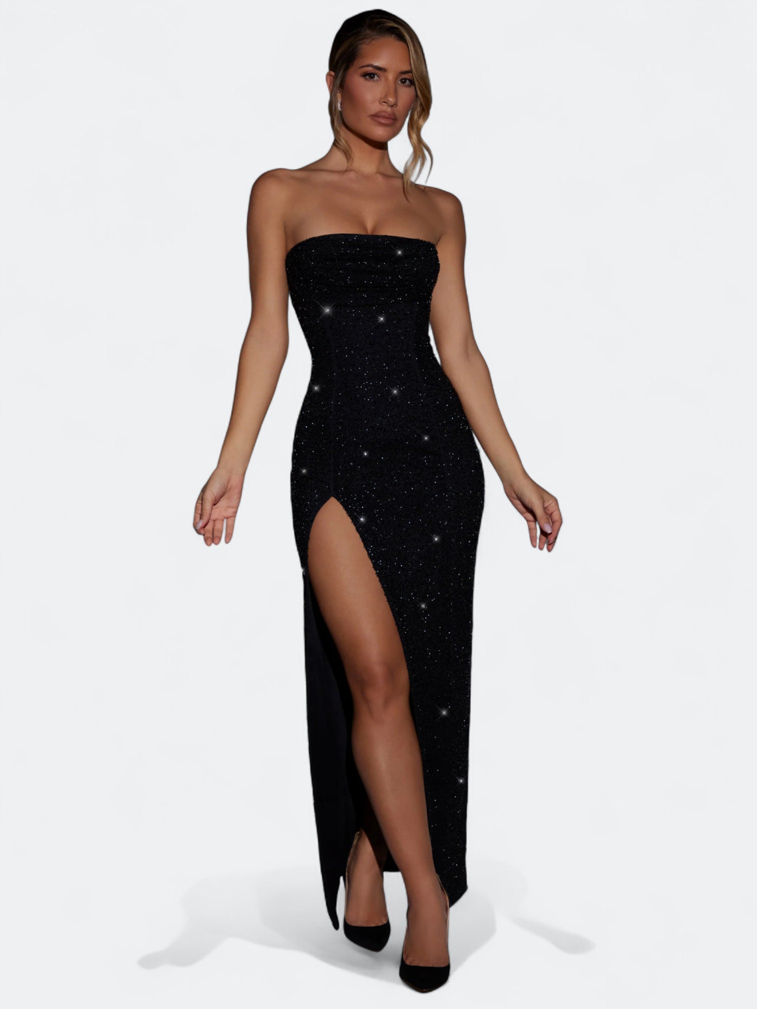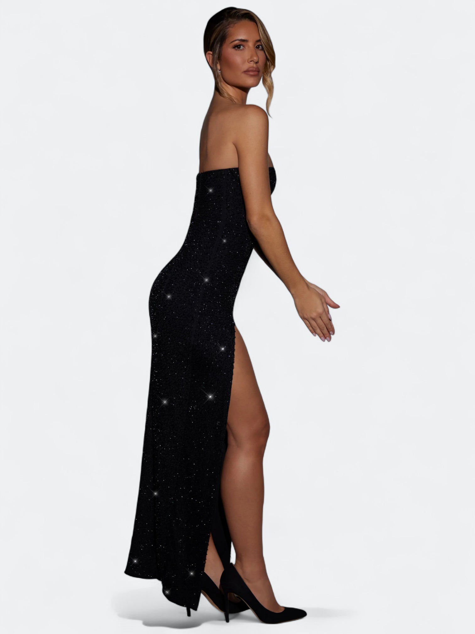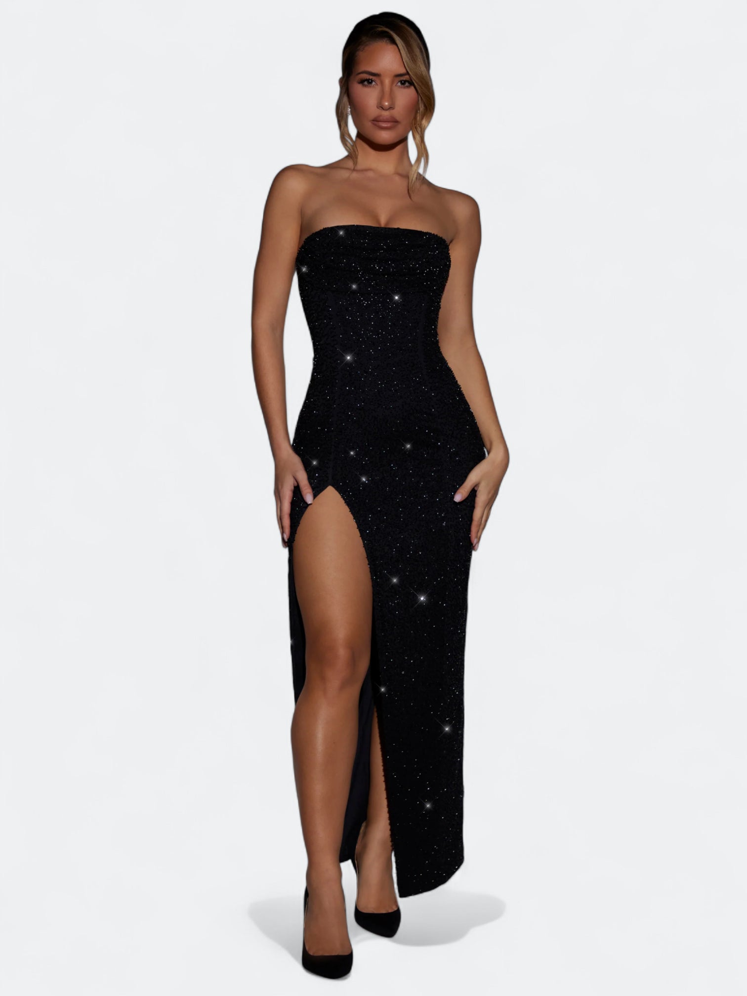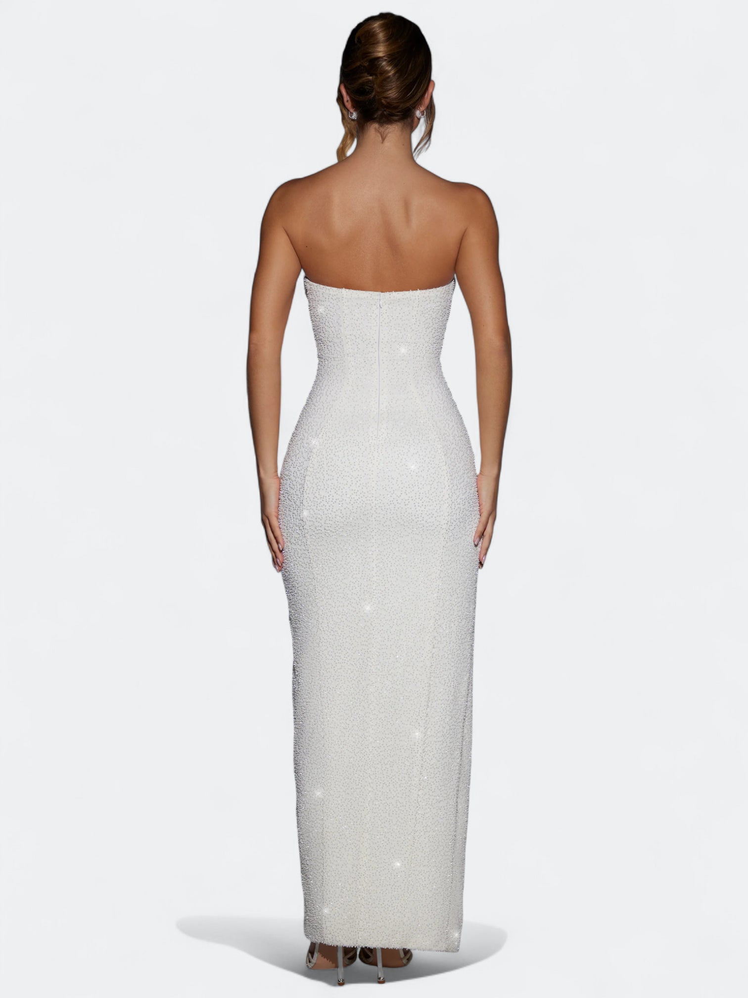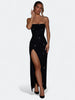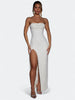Rochette to suknia, która łączy filmowy błysk z czystą, dopasowaną linią. Gorset typu bandeau z delikatnym drapowaniem cowl miękko układa się na sylwetce, odsłania ramiona i podkreśla obojczyki. Smukła kolumnowa spódnica kończy się zmysłowym rozcięciem do uda, a drobne aplikacje perełkowo koralikowe subtelnie migoczą przy ruchu. Elegancja red carpet bez ciężkości, idealna na wieczór, przyjęcia i ważne wyjścia.