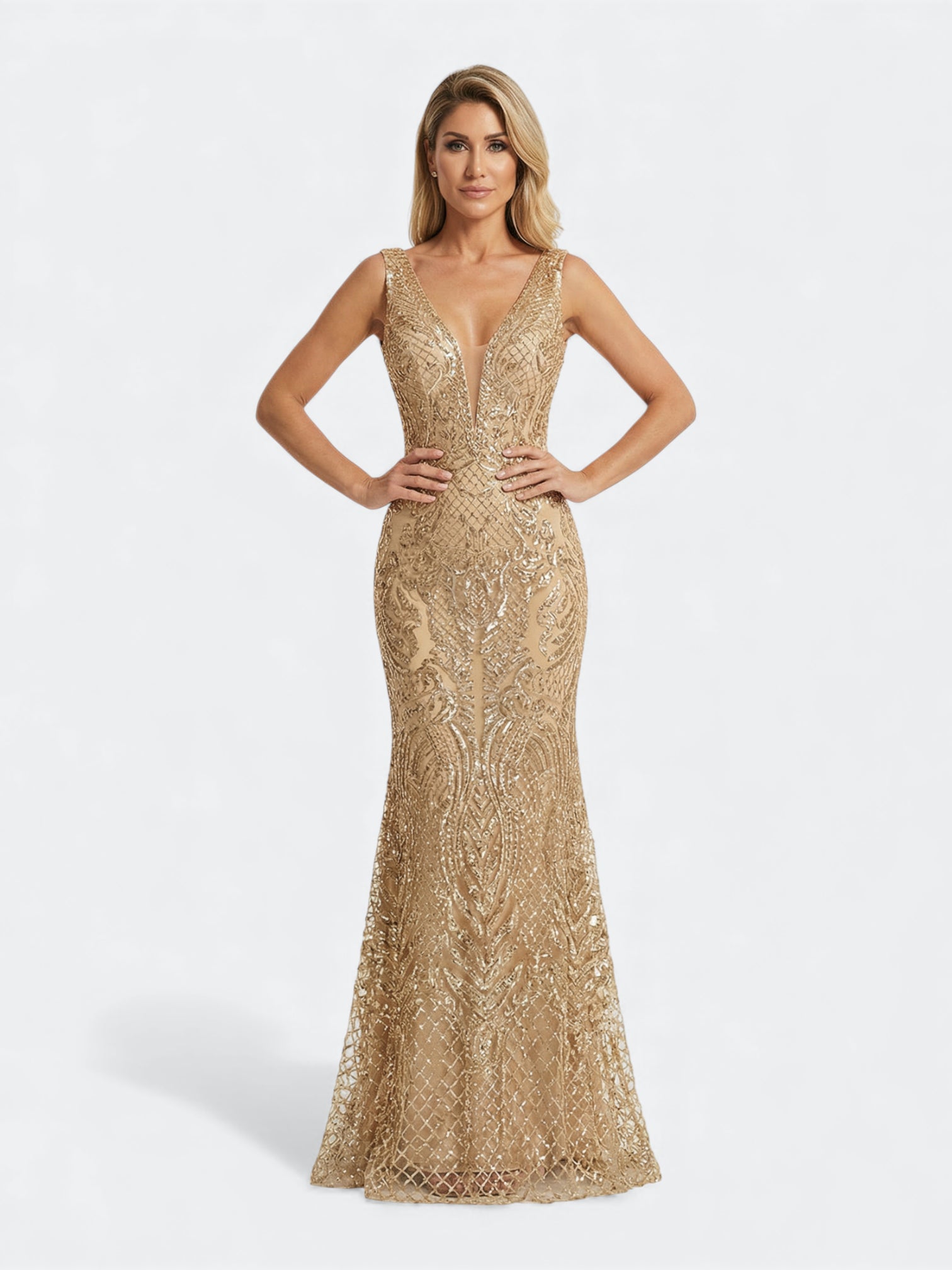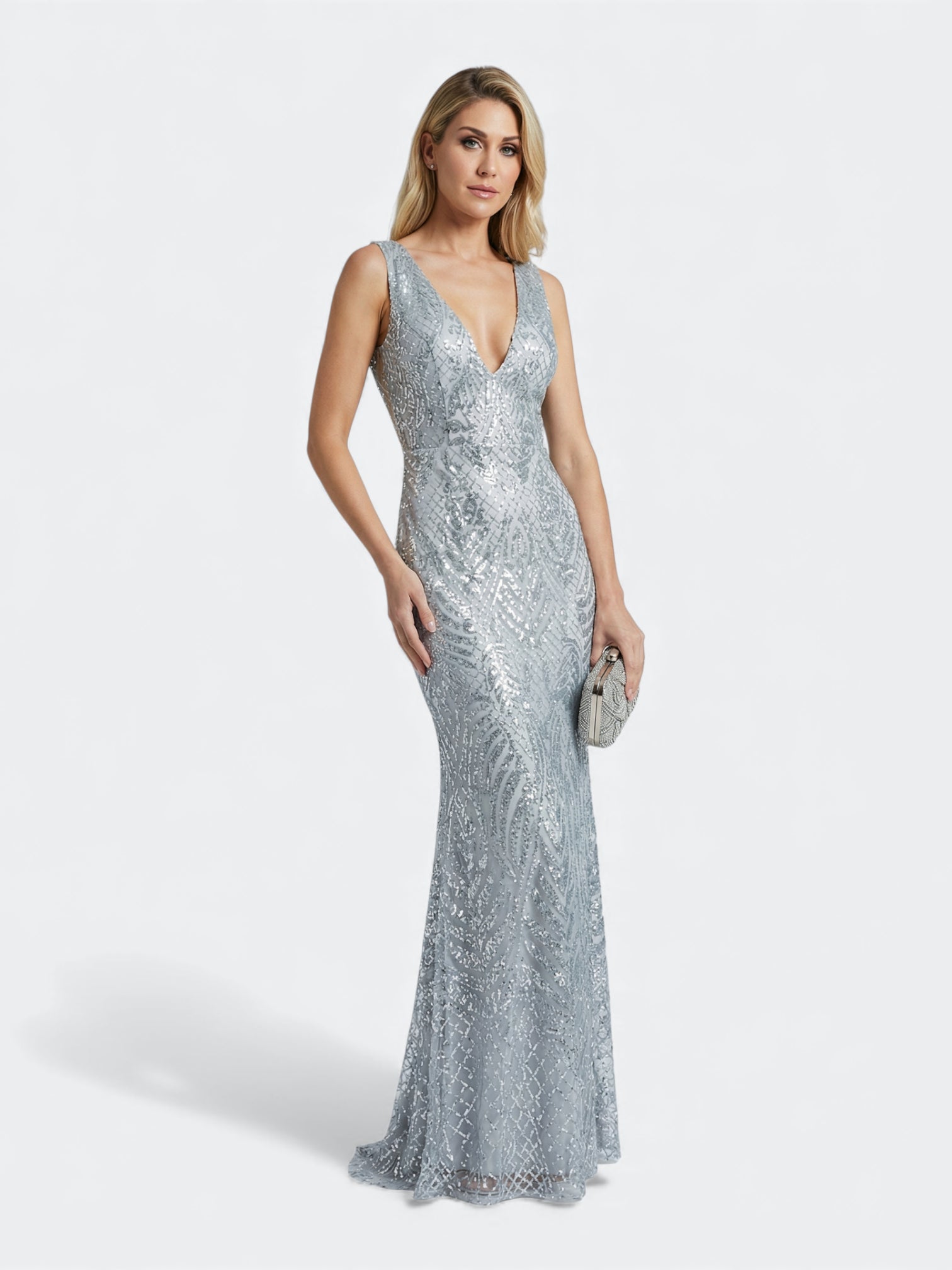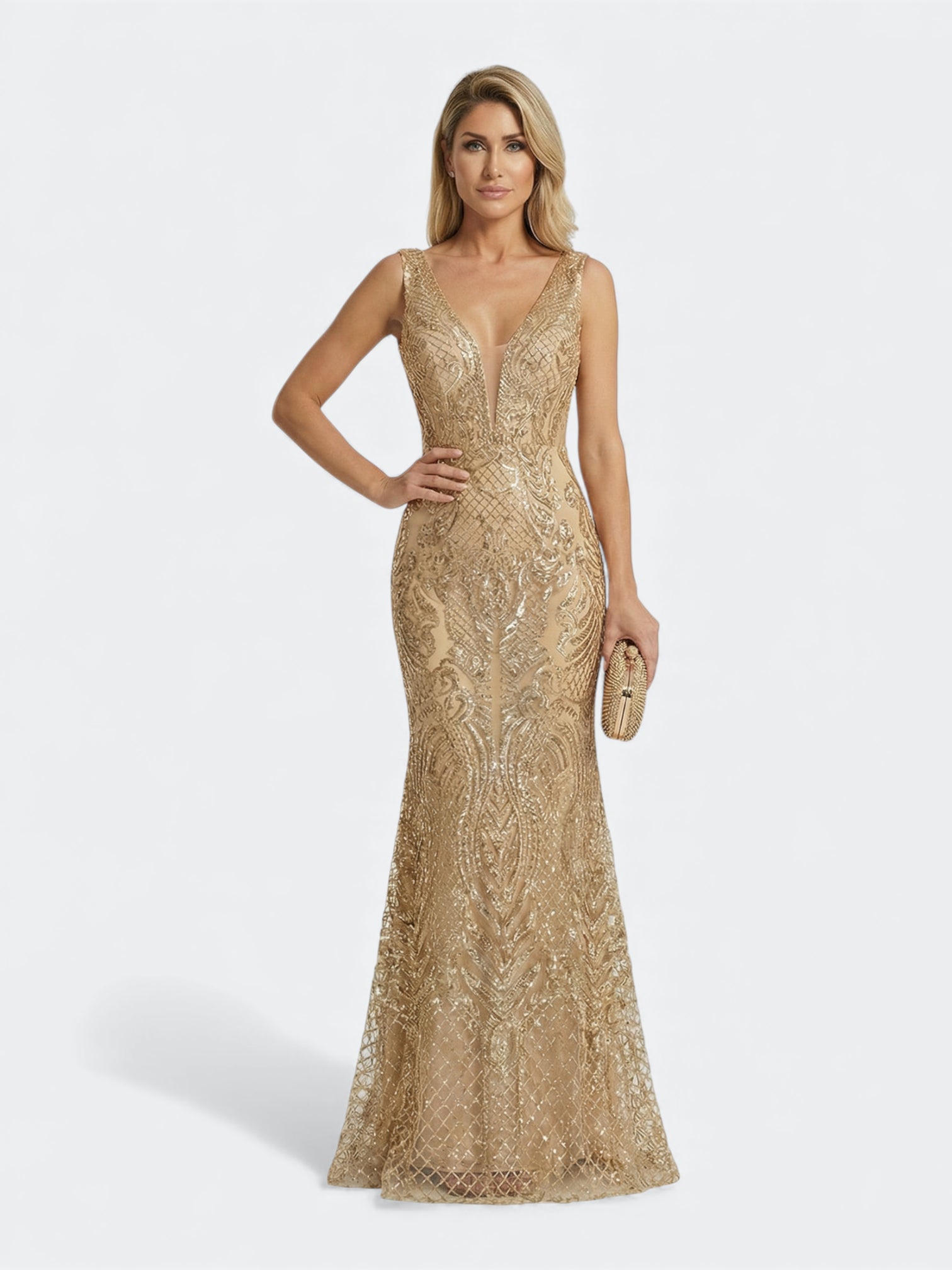 To suknia, która od pierwszej chwili daje efekt luksusu i czerwonego dywanu. Głęboki dekolt w kształcie litery V subtelnie wysmukla linię szyi, a bogaty, geometryczny haft z cekinów tworzy na sylwetce efekt rzeźbienia i optycznego wydłużenia. Dopasowany krój syreny lekko rozszerza się przy dole i pracuje z każdym krokiem, tworząc elegancki, płynny ruch. To idealny wybór na gale, uroczyste kolacje i wyjątkowe okazje, kiedy liczy się pełny blask i kobieca pewność siebie.