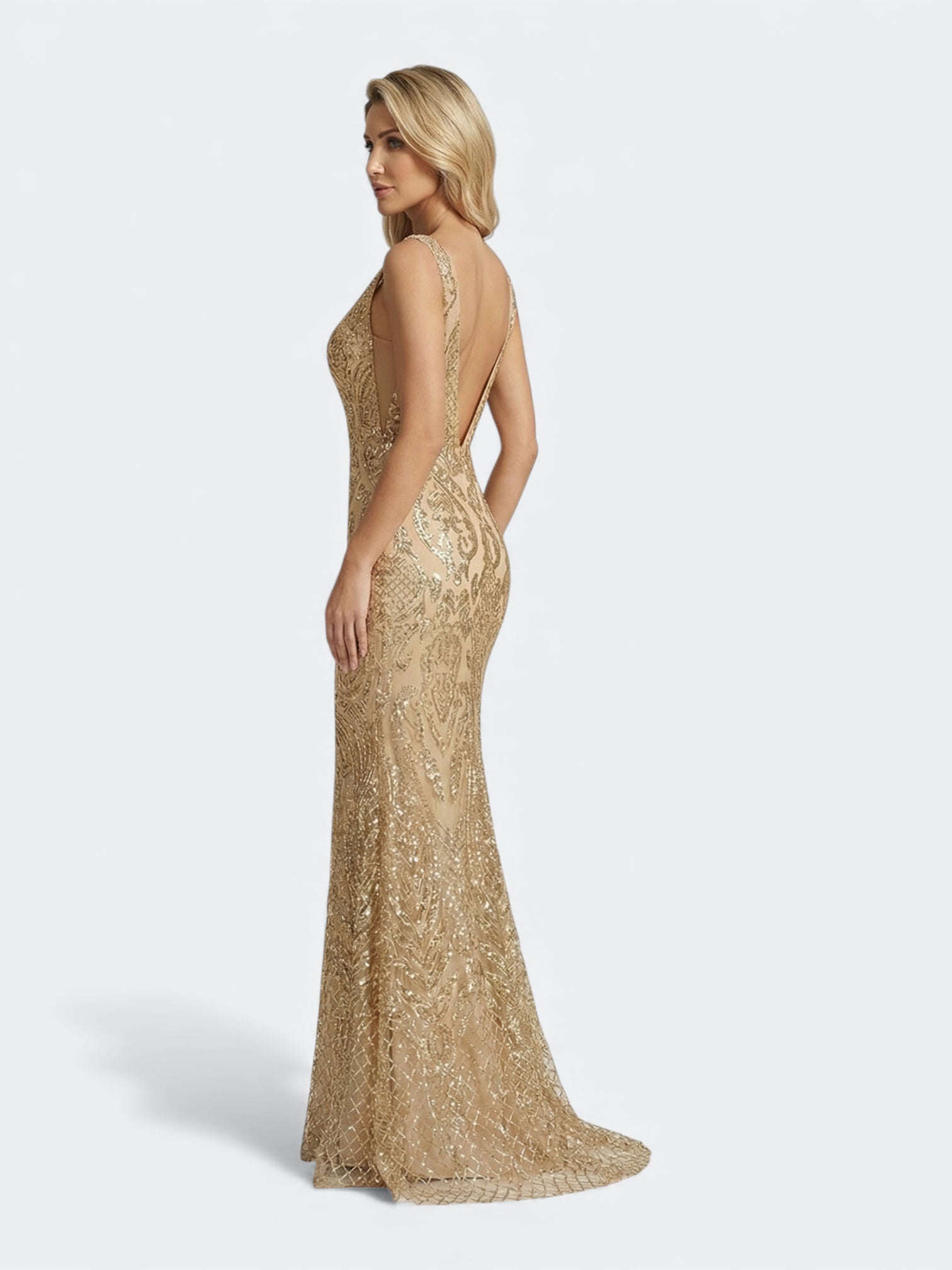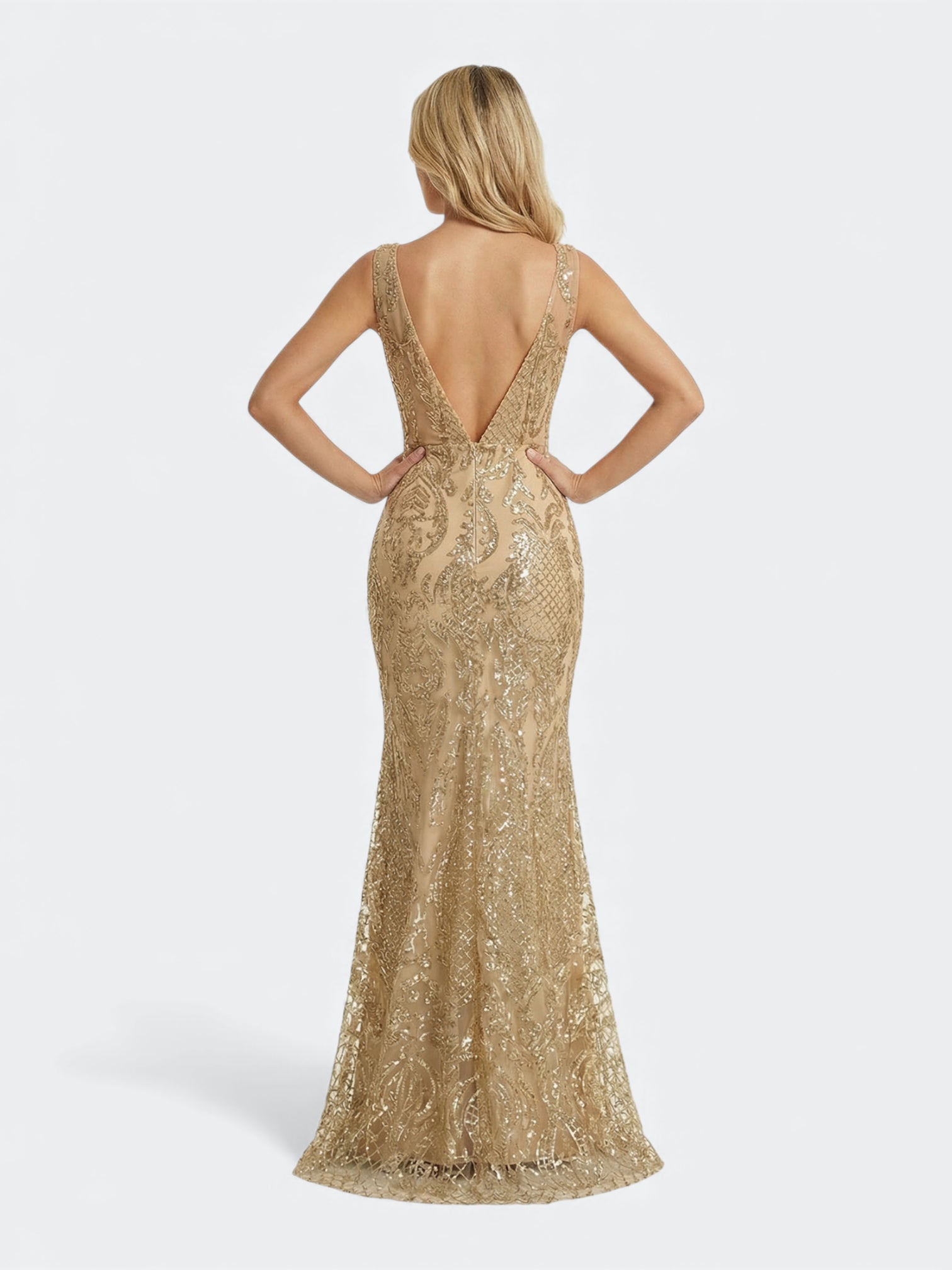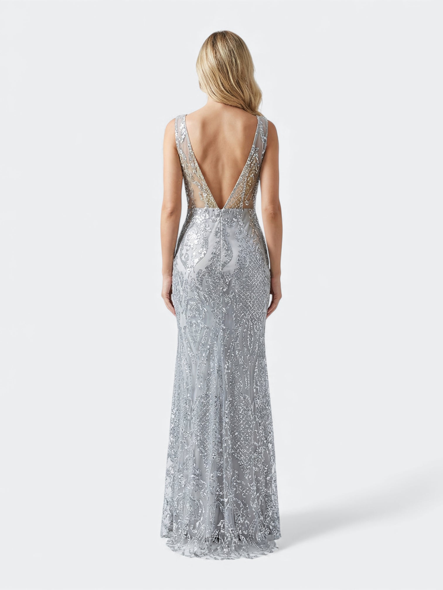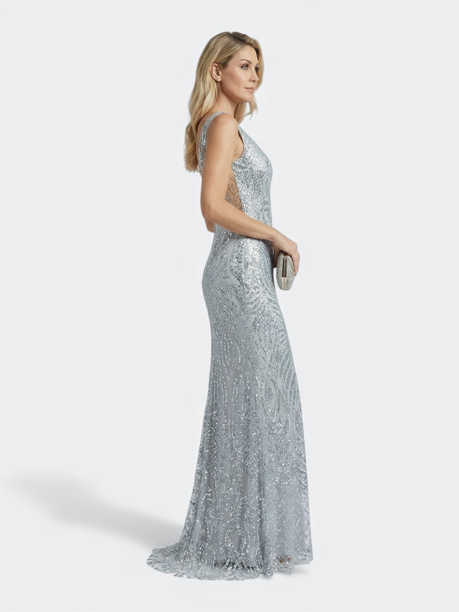 To suknia, która od pierwszej chwili daje efekt luksusu i czerwonego dywanu. Głęboki dekolt w kształcie litery V subtelnie wysmukla linię szyi, a bogaty, geometryczny haft z cekinów tworzy na sylwetce efekt rzeźbienia i optycznego wydłużenia. Dopasowany krój syreny lekko rozszerza się przy dole i pracuje z każdym krokiem, tworząc elegancki, płynny ruch. To idealny wybór na gale, uroczyste kolacje i wyjątkowe okazje, kiedy liczy się pełny blask i kobieca pewność siebie.