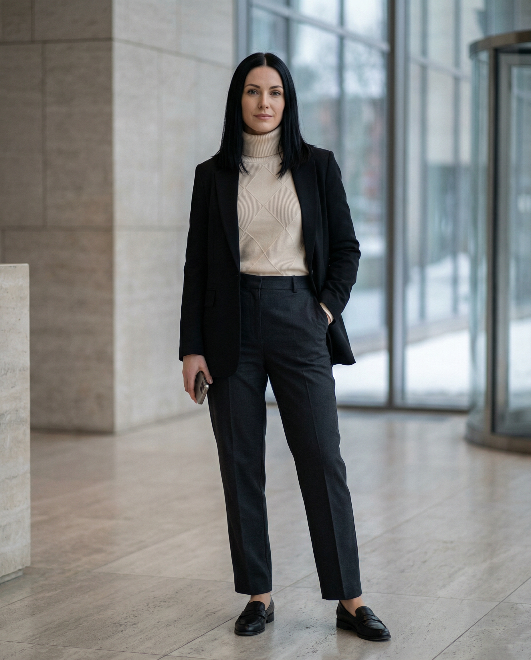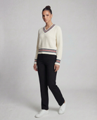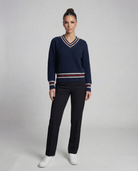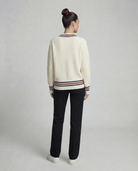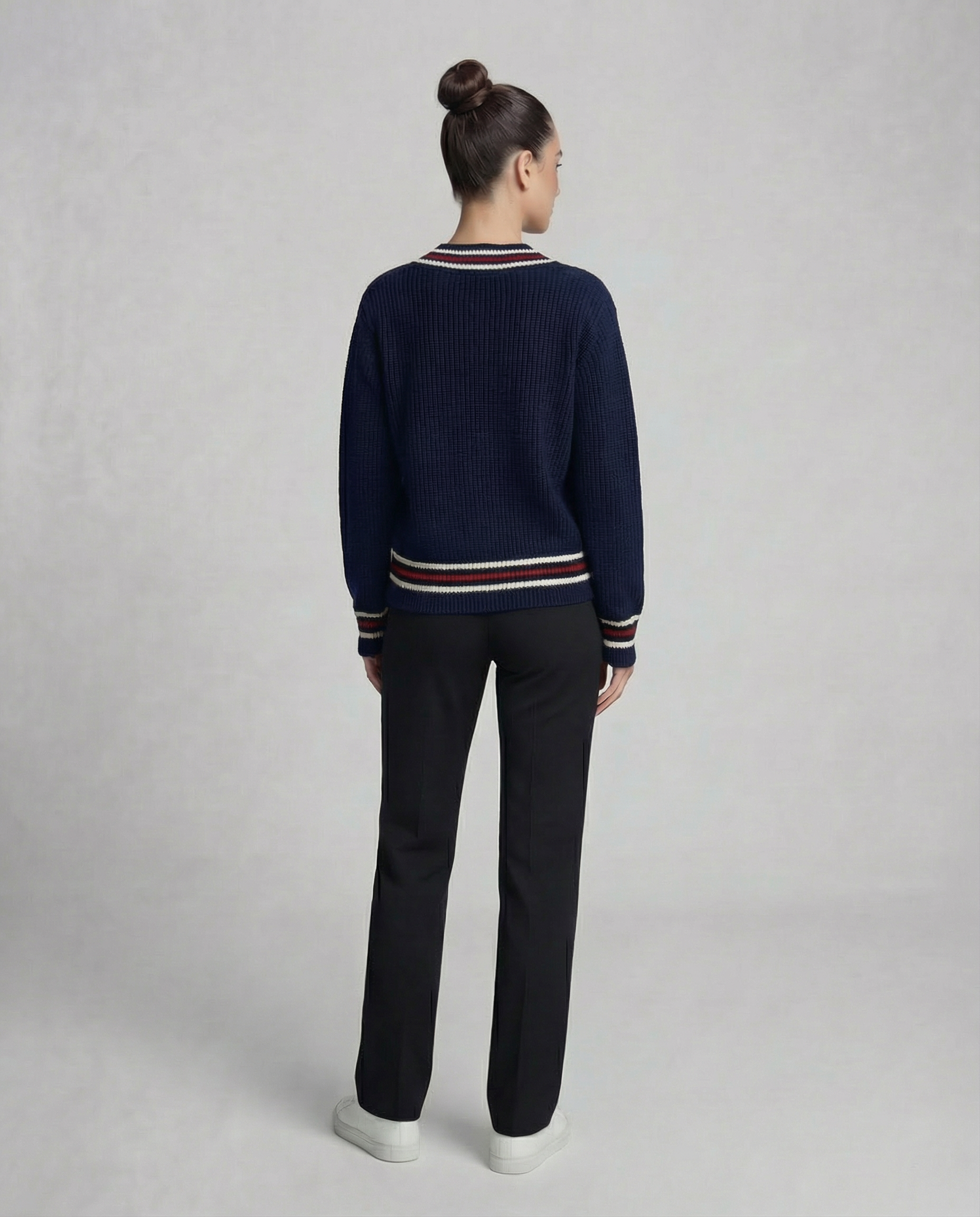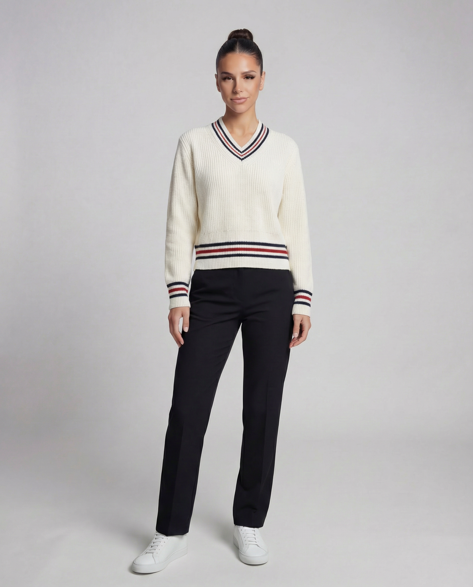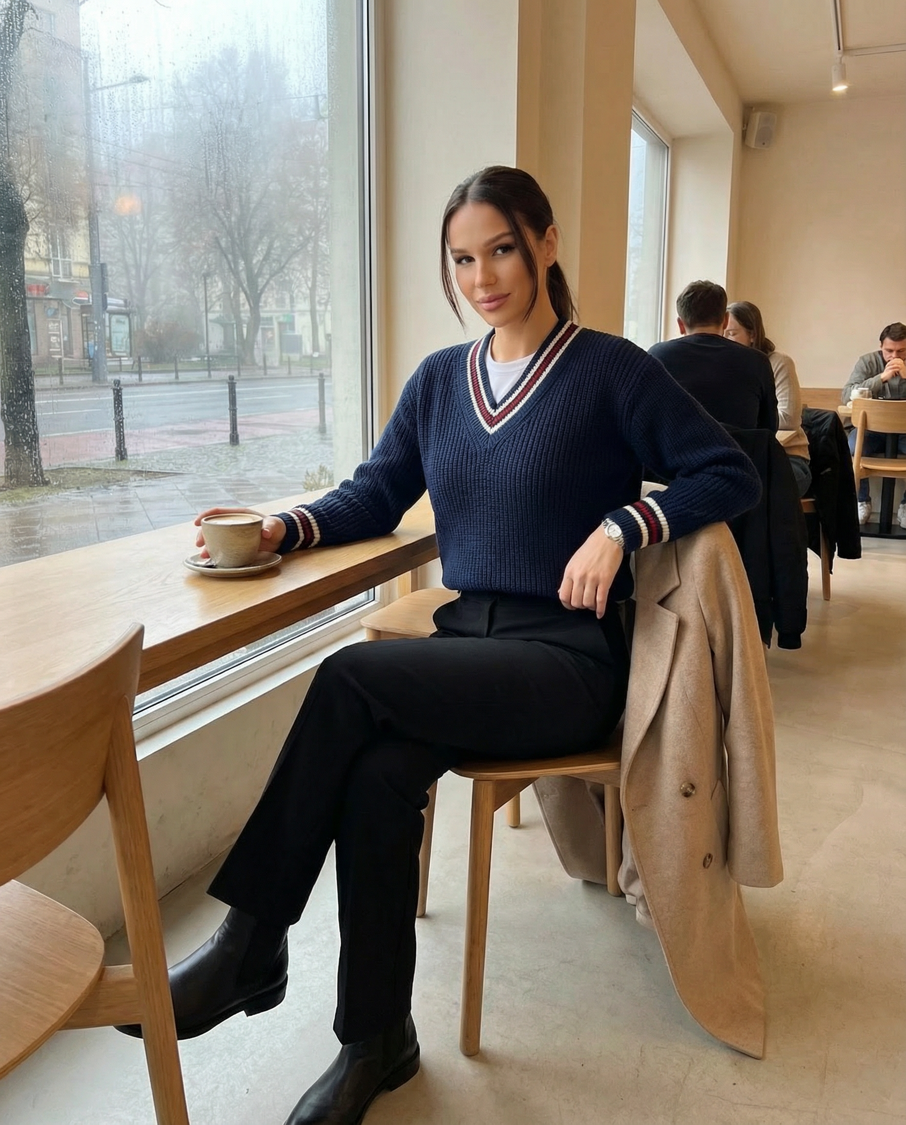 Sweter o luźniejszej formie z dekoltem w serek i wyraźnymi kontrastowymi wykończeniami. Grubsza dzianina daje wyrazistą strukturę i spokojnie układa się na sylwetce. To model na chłodniejsze dni, gdy liczy się warstwa, która od razu buduje styl.