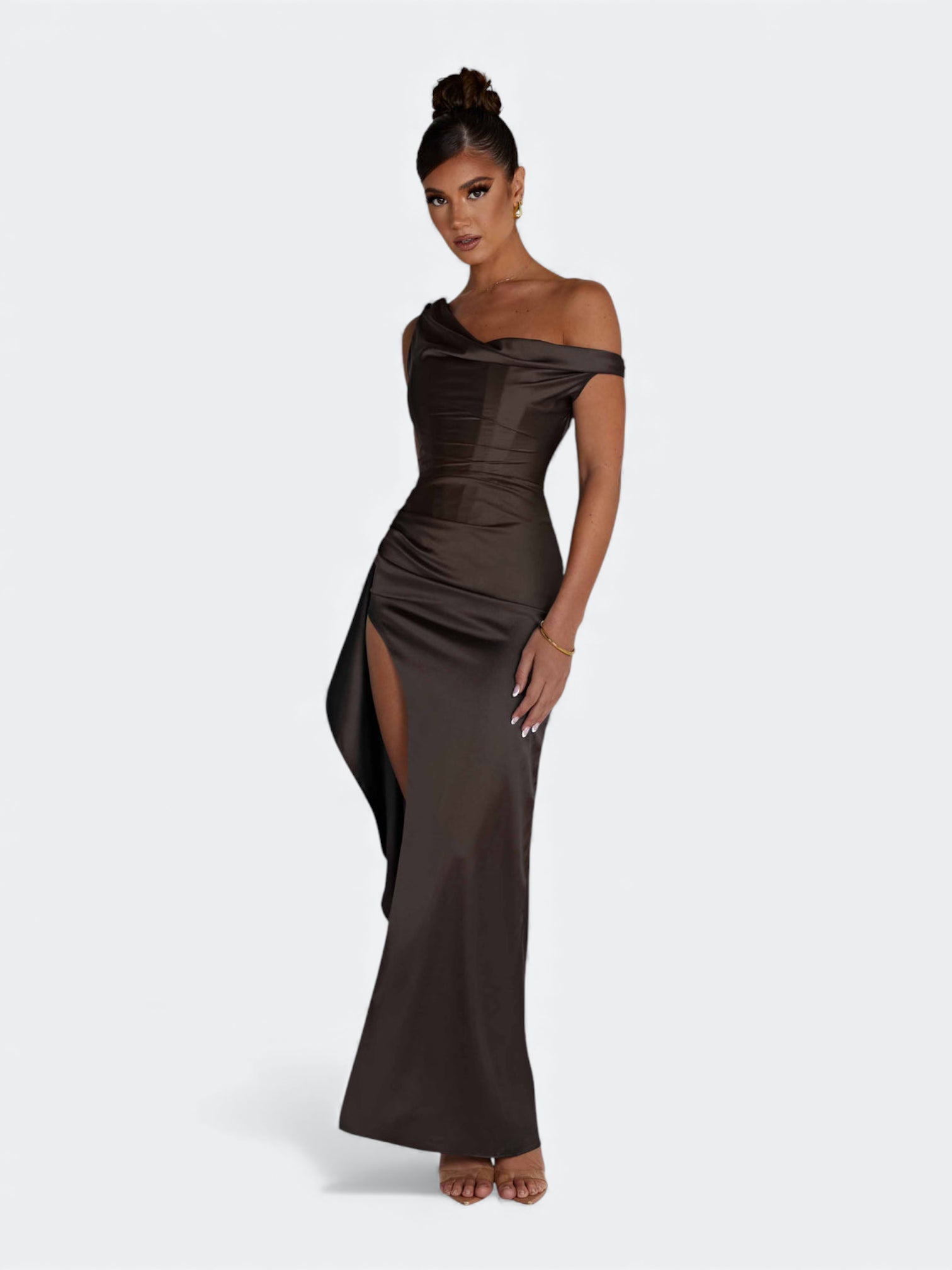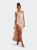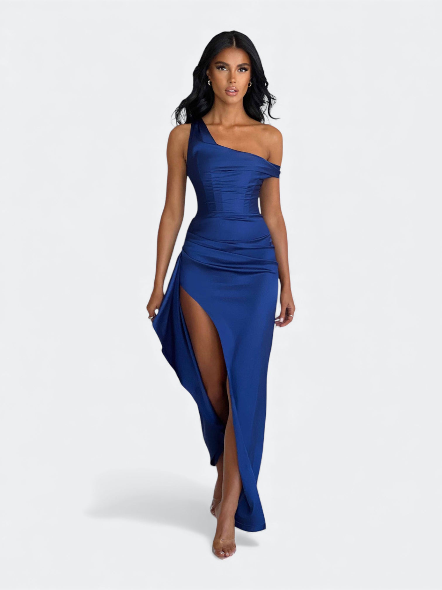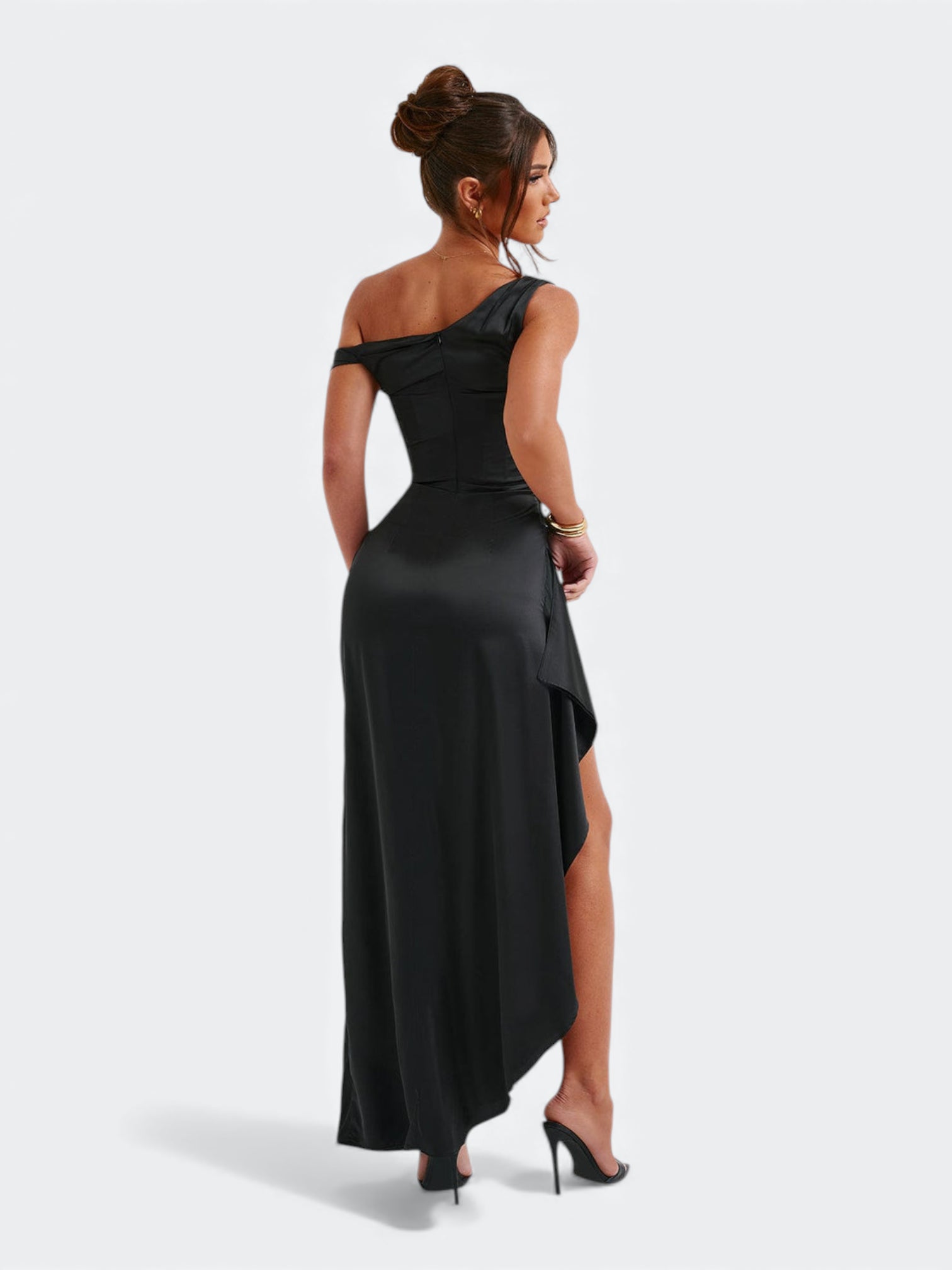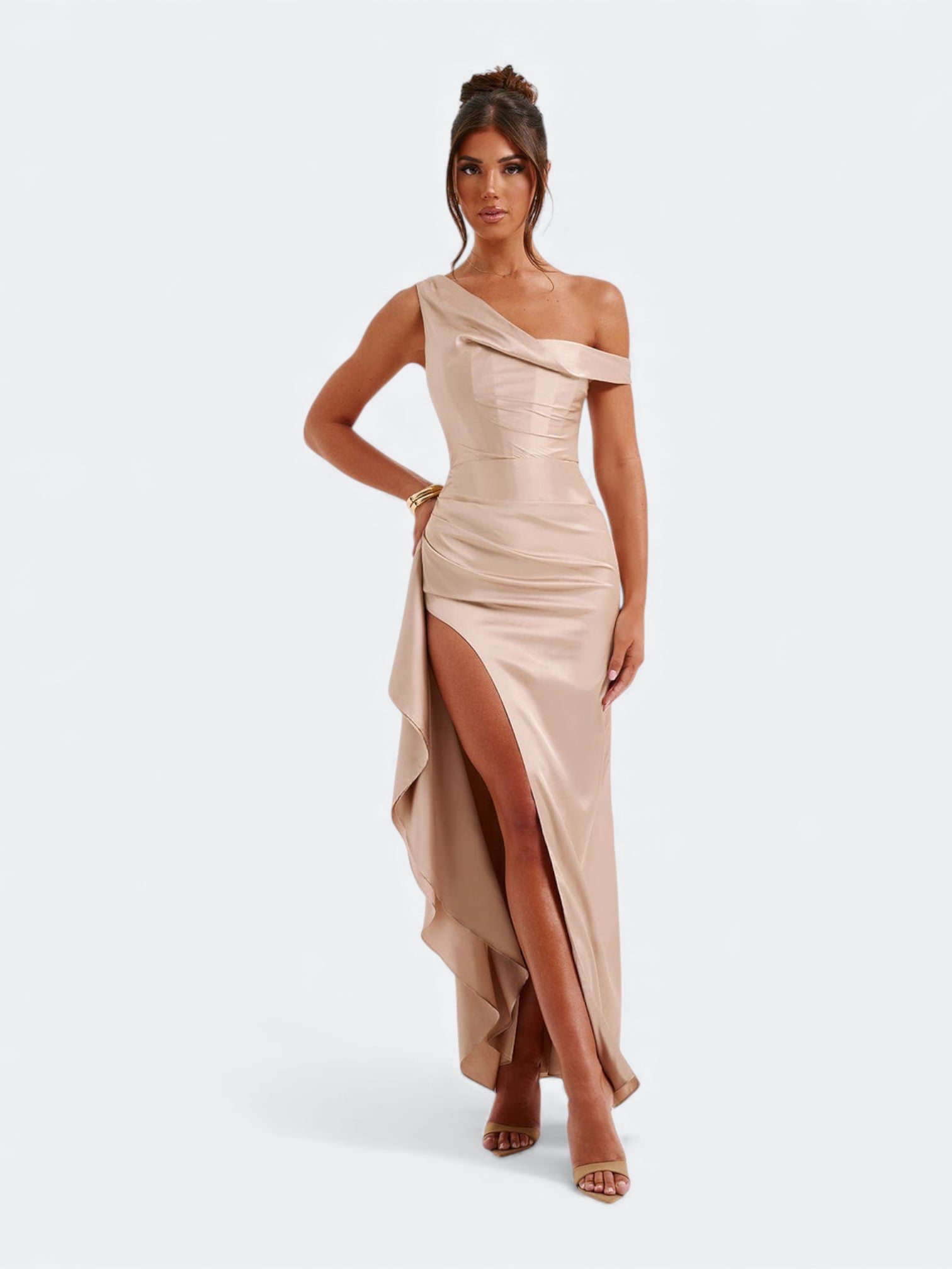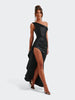 Spektakularna sukienka o rzeźbiącym kroju, która tworzy efekt idealnie wymodelowanej sylwetki od pierwszego założenia. Asymetryczny, miękko udrapowany dekolt subtelnie układa się na linii ramion i nadaje całości elegancki, płynący charakter. Wewnętrzny gorset z fiszbinami stabilizuje korpus i pięknie go unosi, a dramatyczne rozcięcie dodaje lekkości przy każdym ruchu. To fason stworzony na wieczorne gale, eleganckie przyjęcia i wyjątkowe okazje, gdy liczy się efekt zapamiętany na długo.