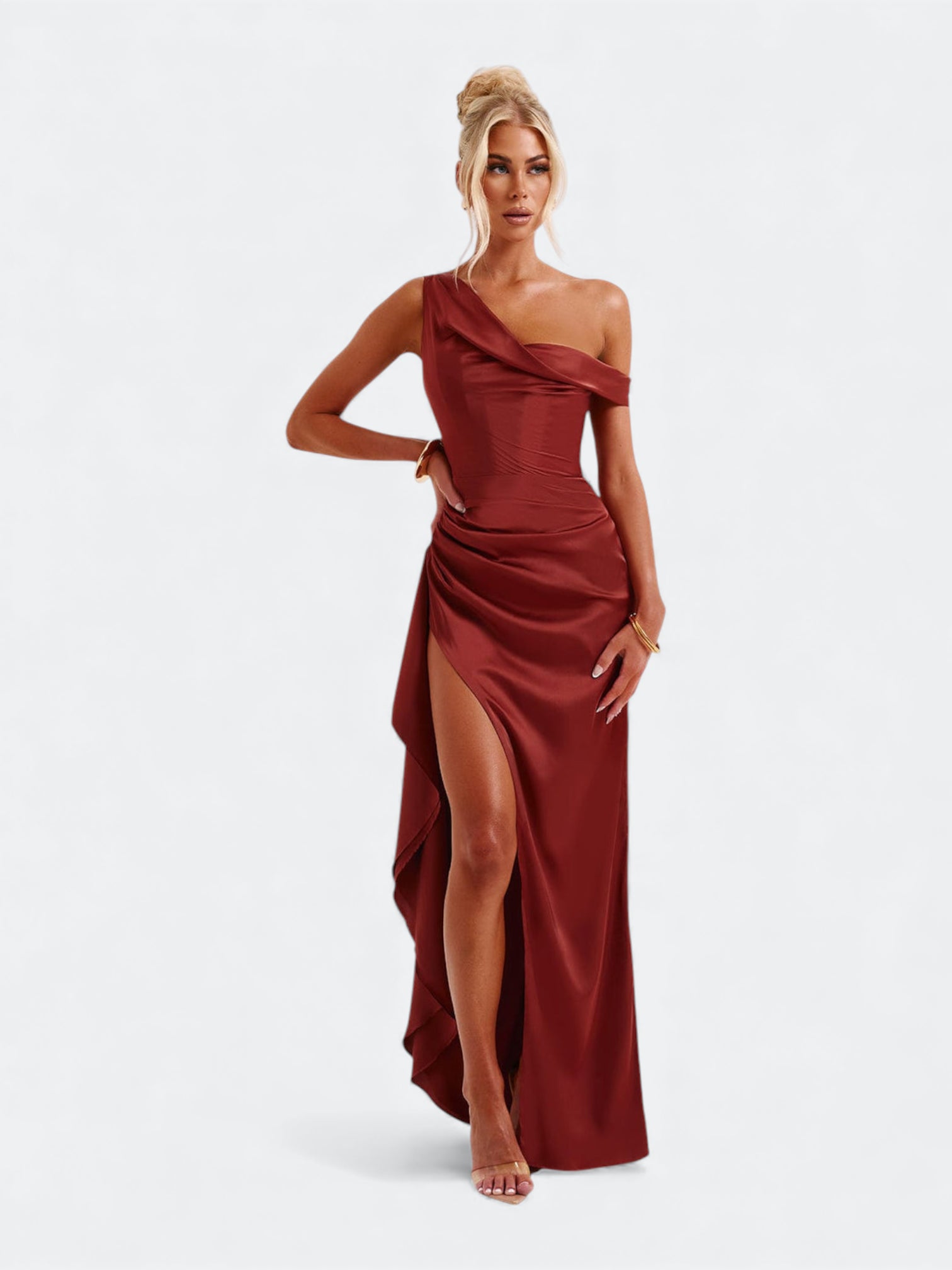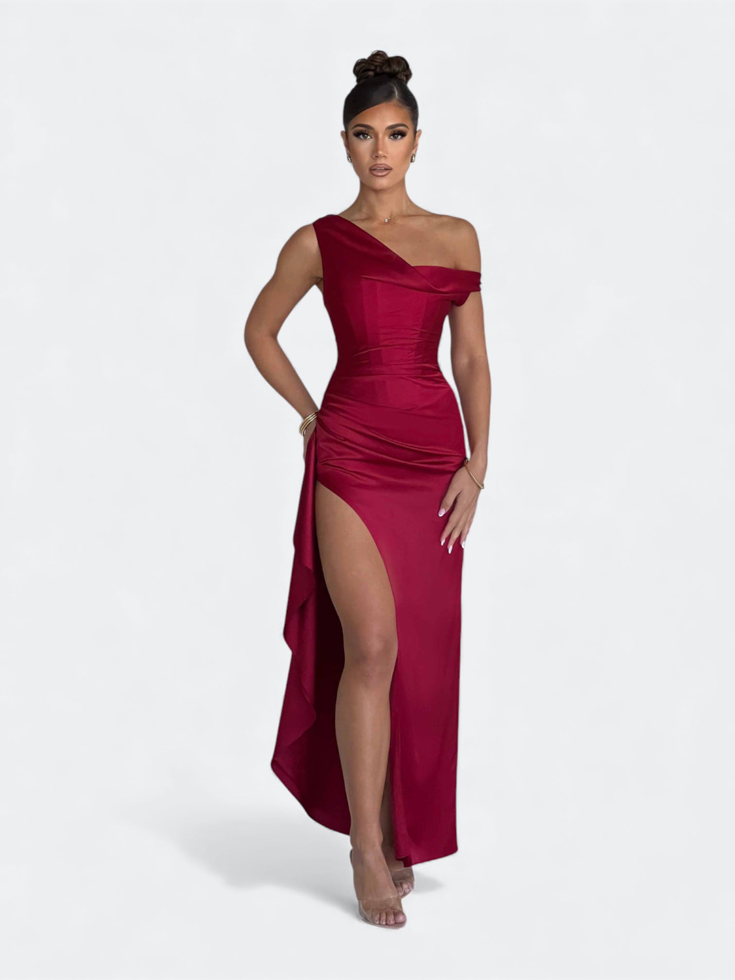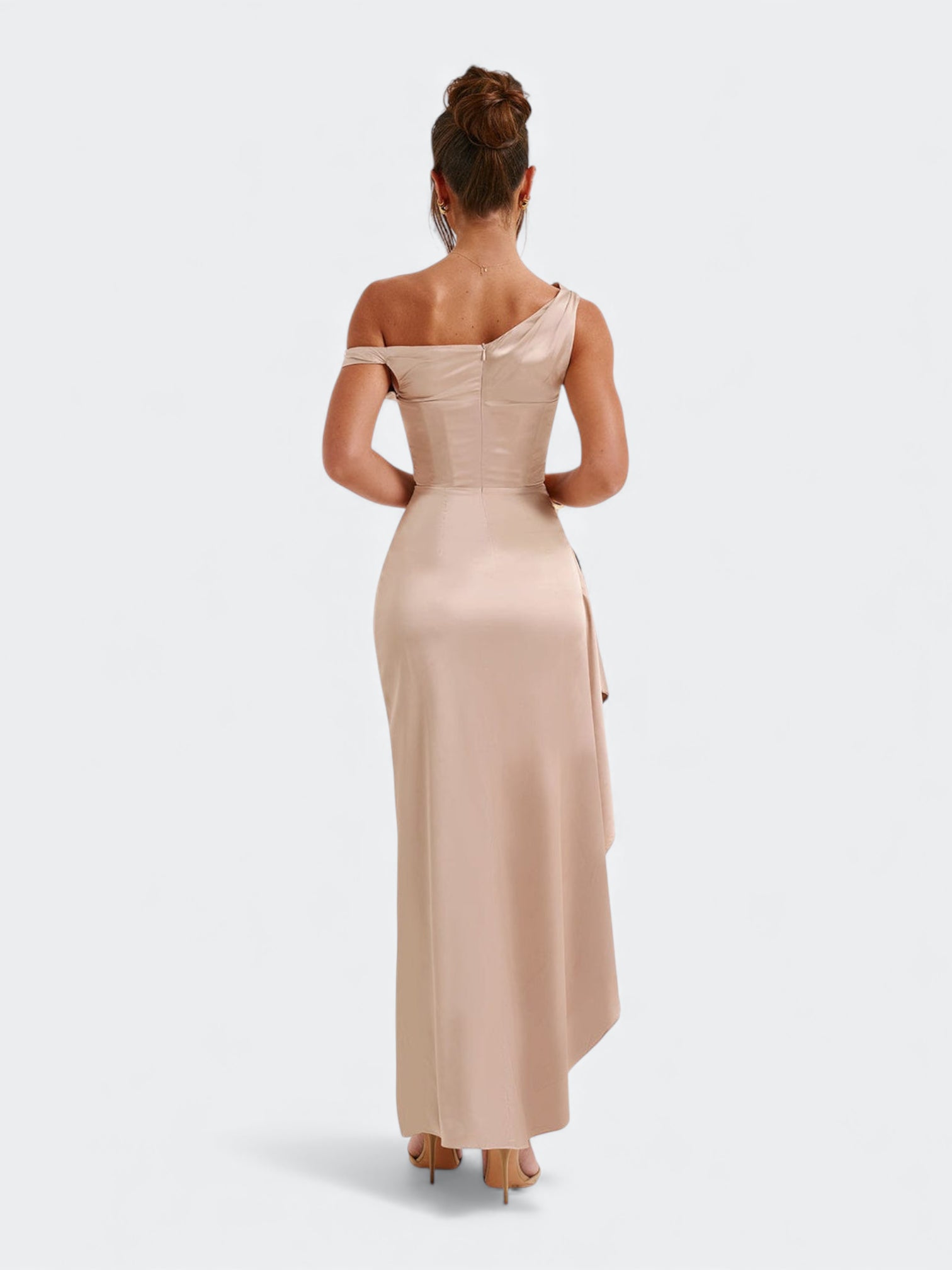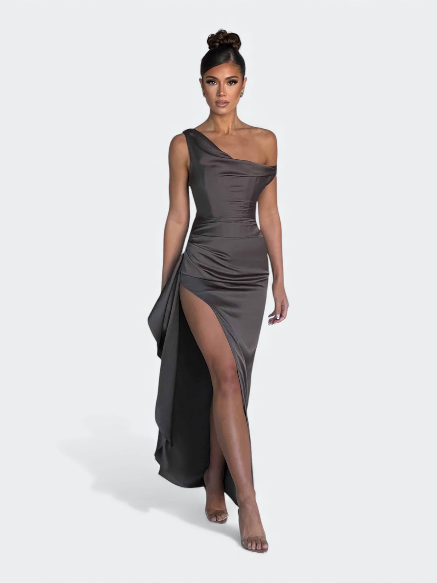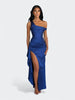 Spektakularna sukienka o rzeźbiącym kroju, która tworzy efekt idealnie wymodelowanej sylwetki od pierwszego założenia. Asymetryczny, miękko udrapowany dekolt subtelnie układa się na linii ramion i nadaje całości elegancki, płynący charakter. Wewnętrzny gorset z fiszbinami stabilizuje korpus i pięknie go unosi, a dramatyczne rozcięcie dodaje lekkości przy każdym ruchu. To fason stworzony na wieczorne gale, eleganckie przyjęcia i wyjątkowe okazje, gdy liczy się efekt zapamiętany na długo.