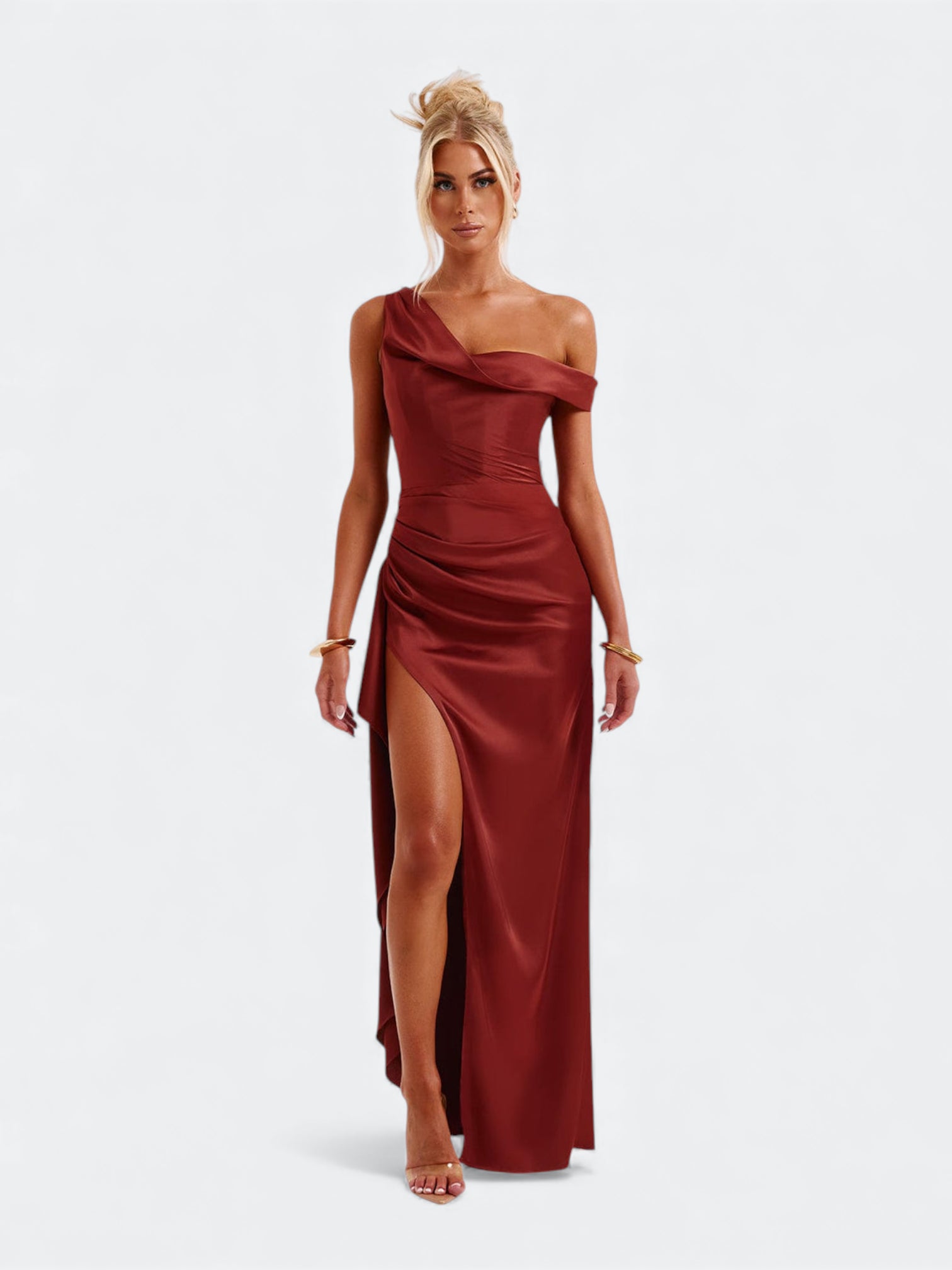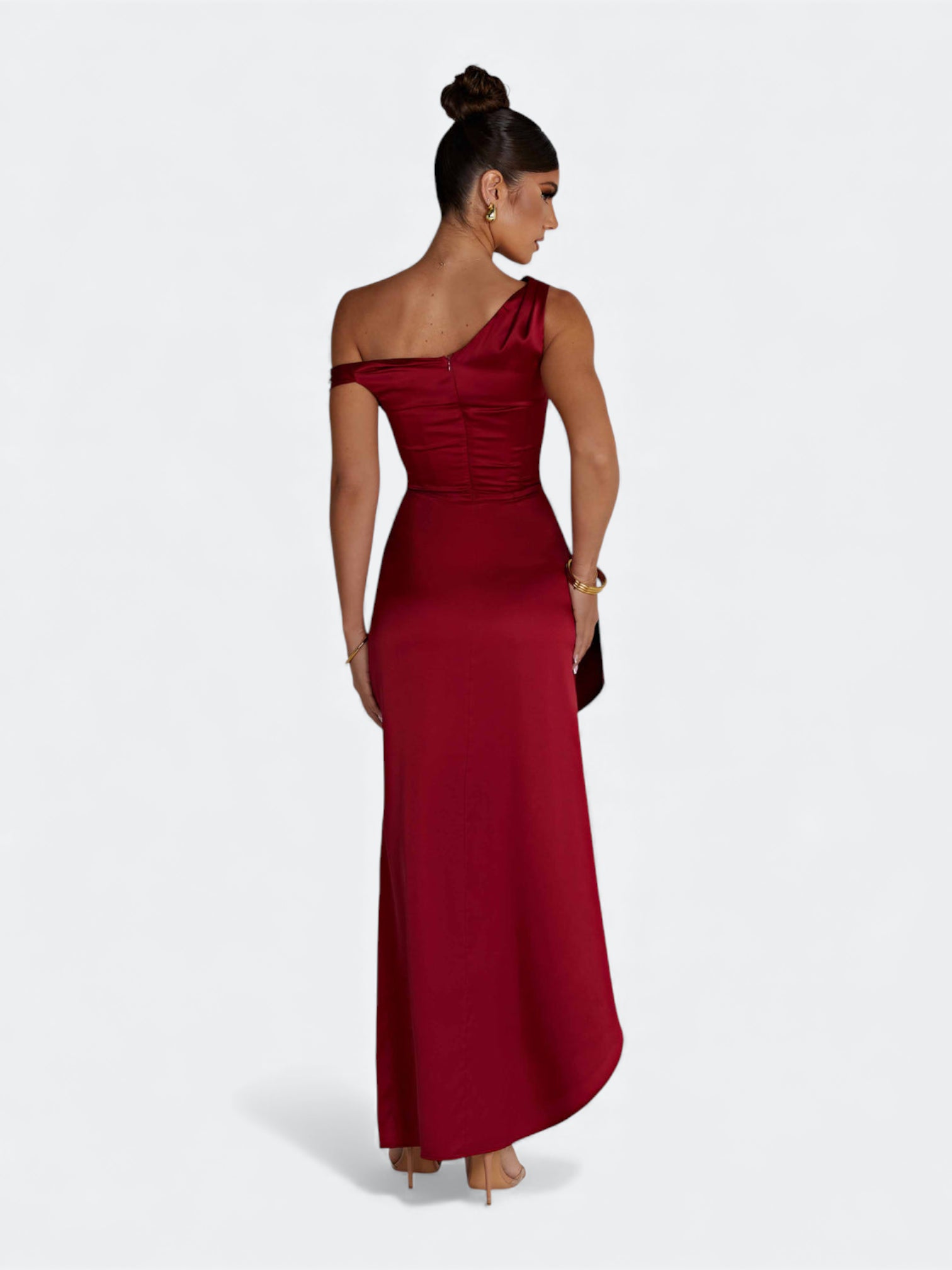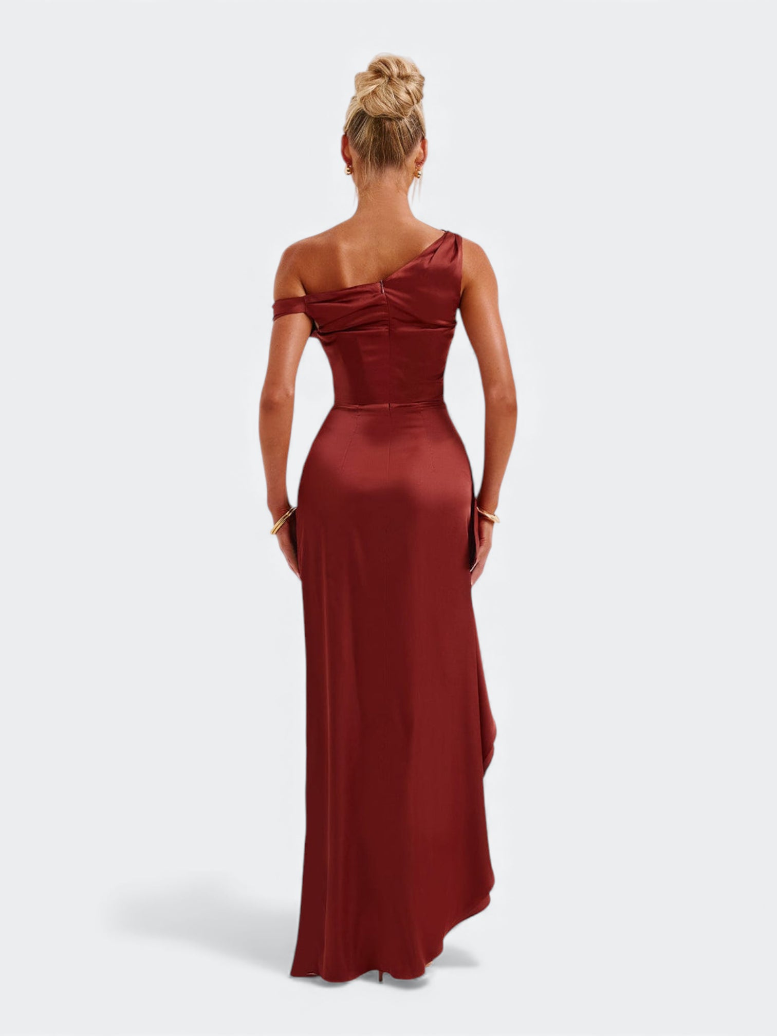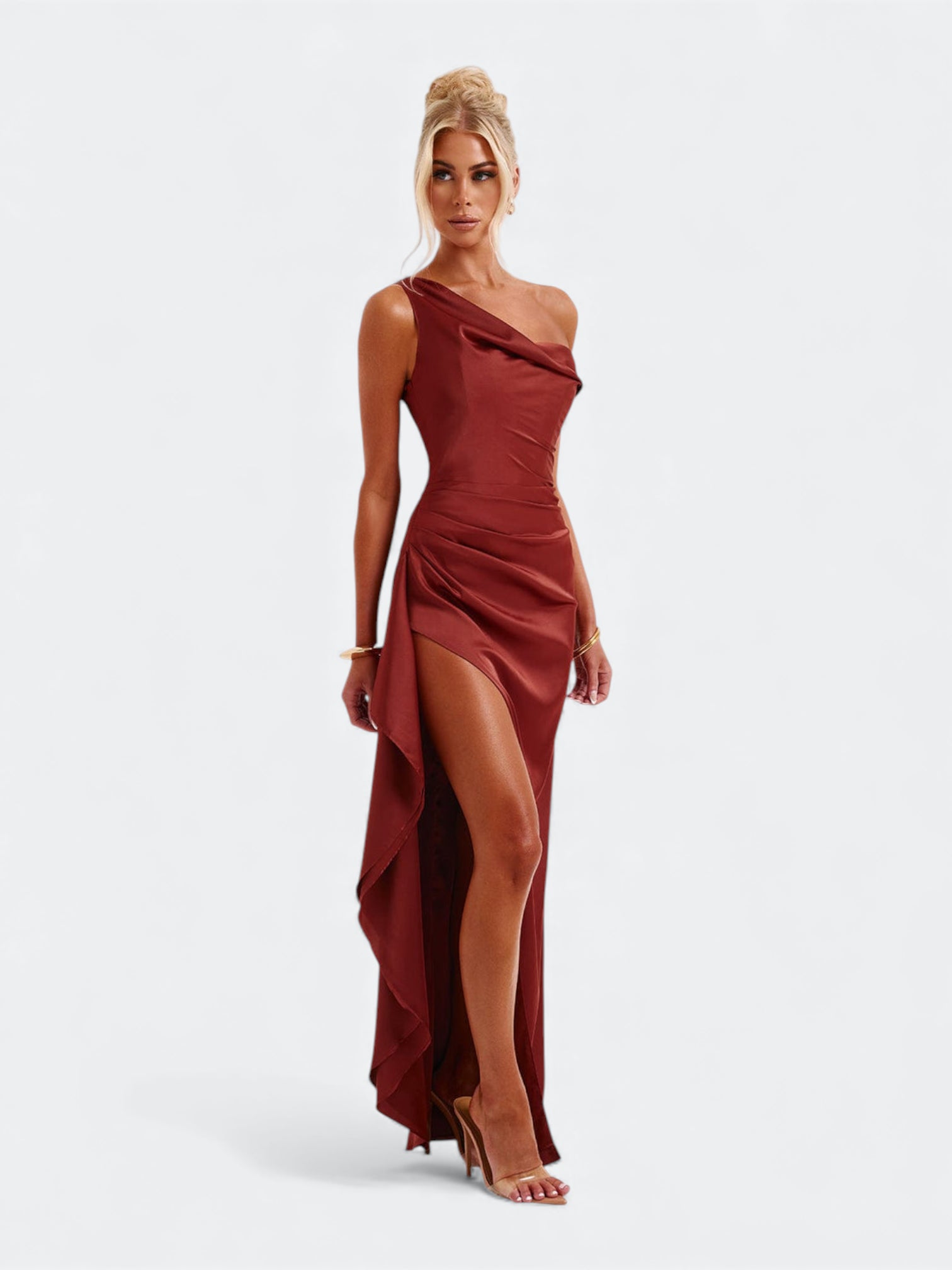 Spektakularna sukienka o rzeźbiącym kroju, która tworzy efekt idealnie wymodelowanej sylwetki od pierwszego założenia. Asymetryczny, miękko udrapowany dekolt subtelnie układa się na linii ramion i nadaje całości elegancki, płynący charakter. Wewnętrzny gorset z fiszbinami stabilizuje korpus i pięknie go unosi, a dramatyczne rozcięcie dodaje lekkości przy każdym ruchu. To fason stworzony na wieczorne gale, eleganckie przyjęcia i wyjątkowe okazje, gdy liczy się efekt zapamiętany na długo.
