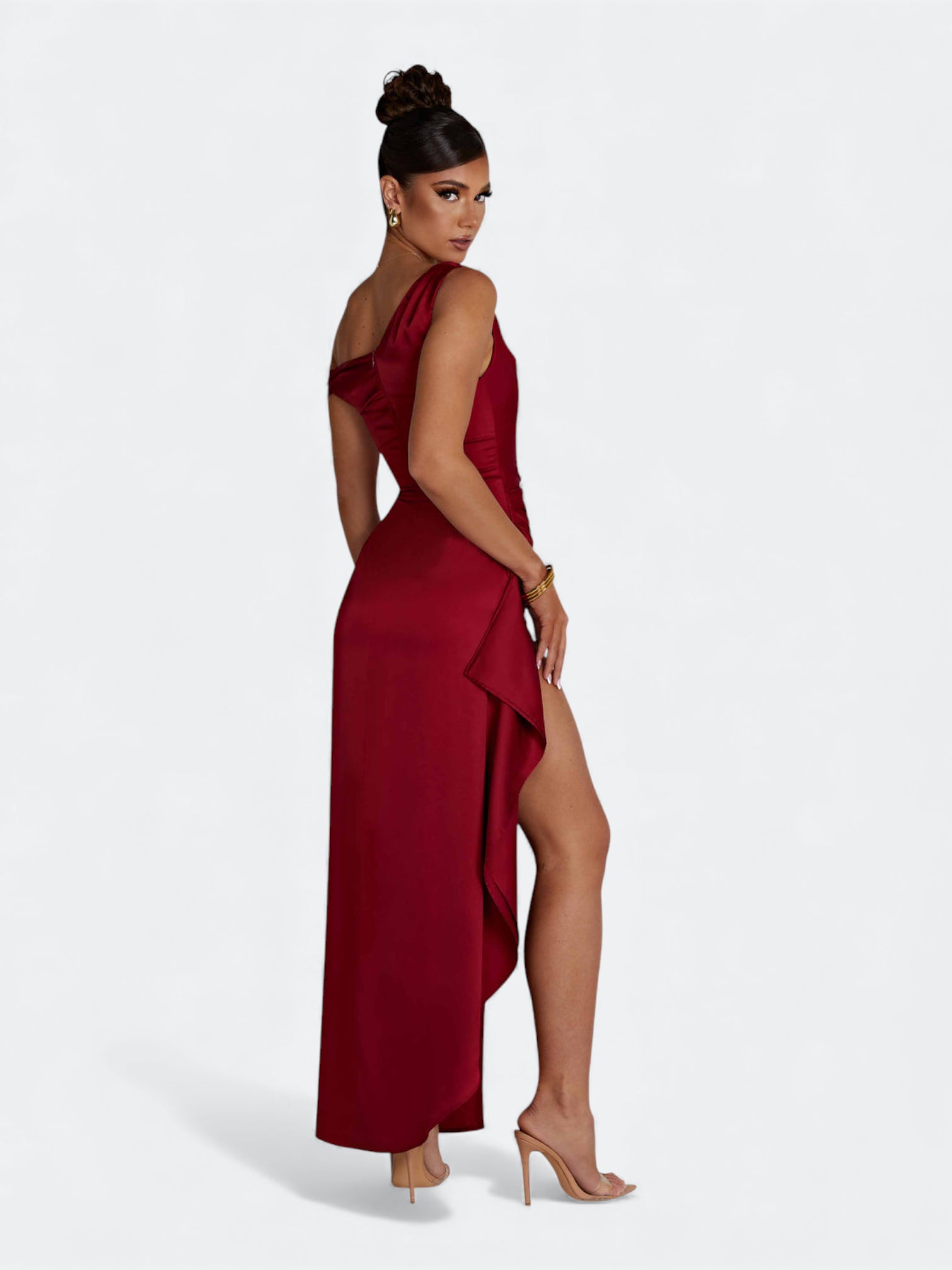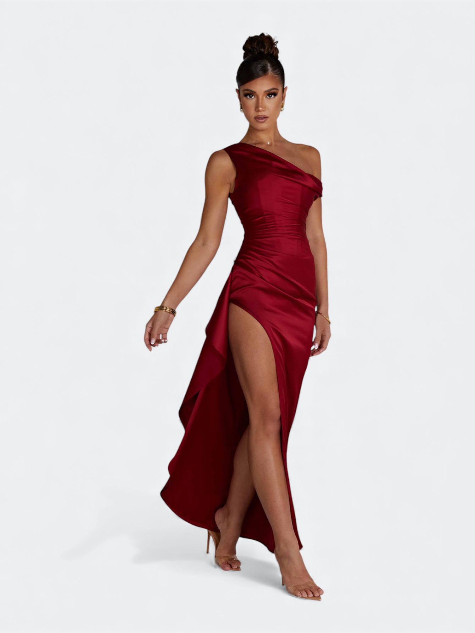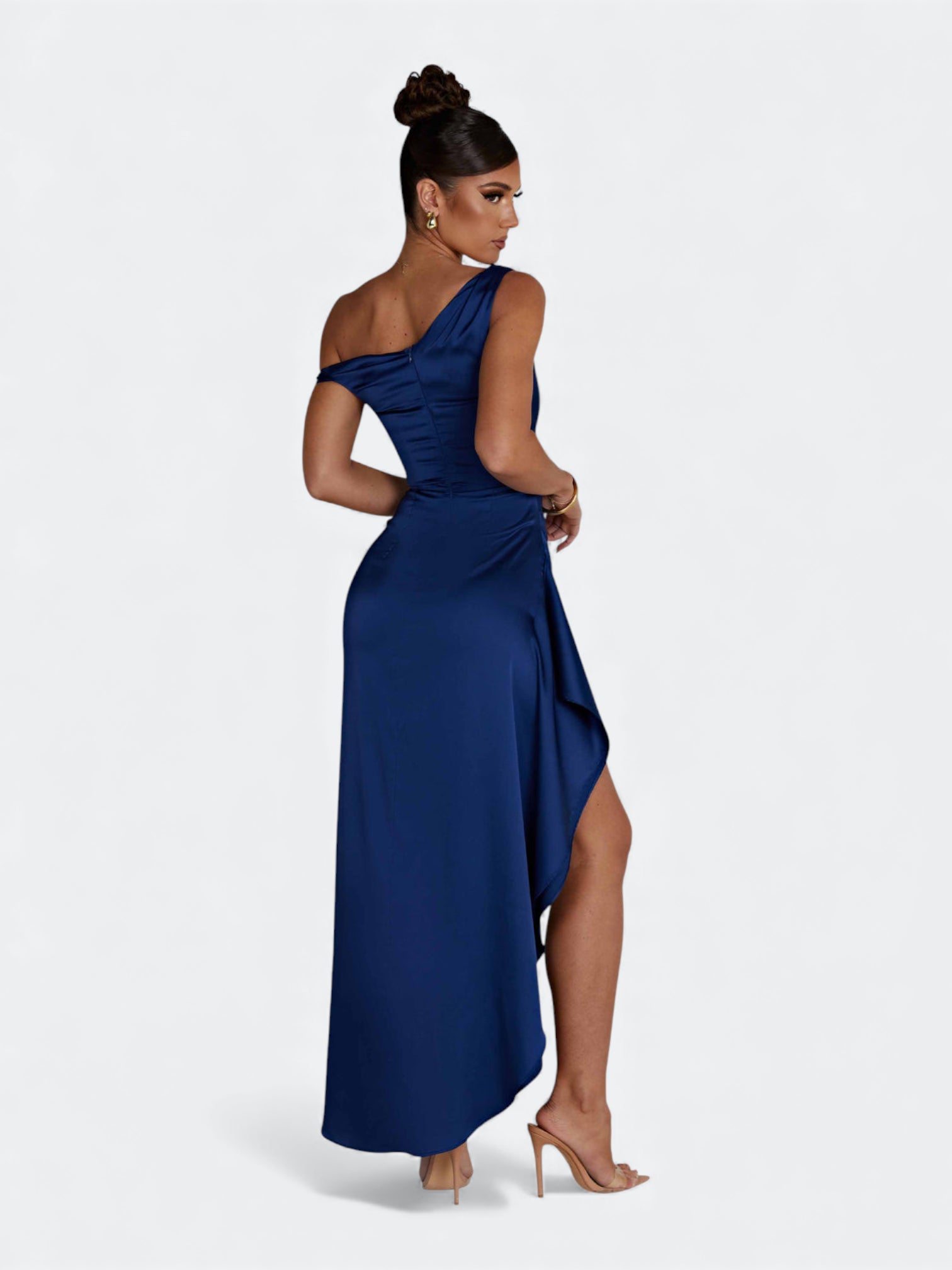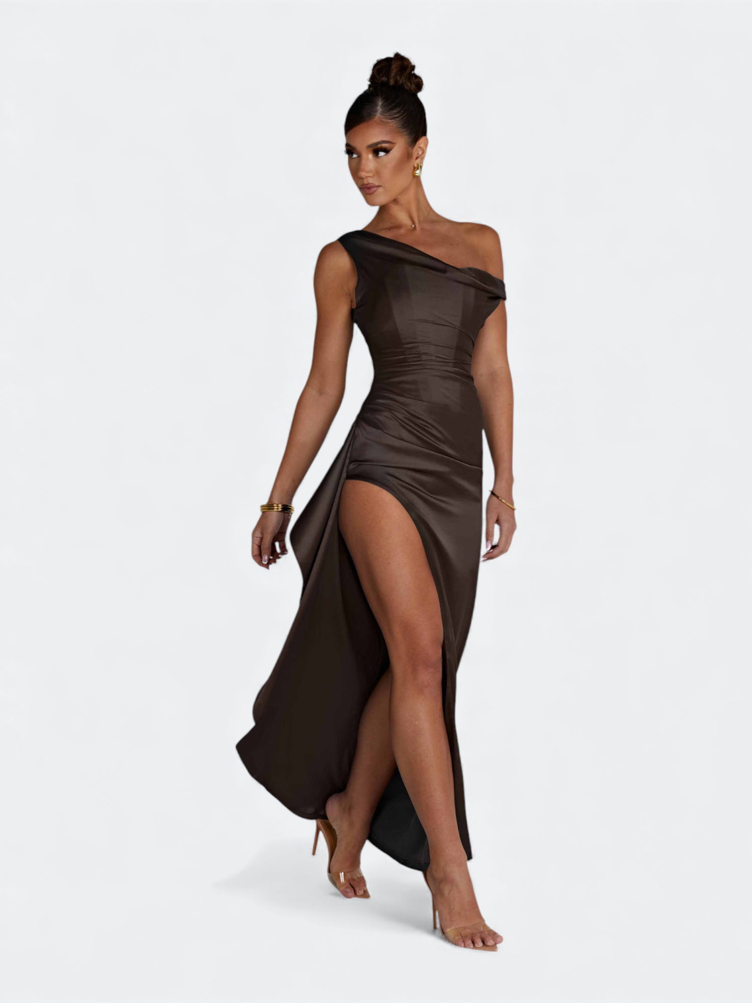 Spektakularna sukienka o rzeźbiącym kroju, która tworzy efekt idealnie wymodelowanej sylwetki od pierwszego założenia. Asymetryczny, miękko udrapowany dekolt subtelnie układa się na linii ramion i nadaje całości elegancki, płynący charakter. Wewnętrzny gorset z fiszbinami stabilizuje korpus i pięknie go unosi, a dramatyczne rozcięcie dodaje lekkości przy każdym ruchu. To fason stworzony na wieczorne gale, eleganckie przyjęcia i wyjątkowe okazje, gdy liczy się efekt zapamiętany na długo.