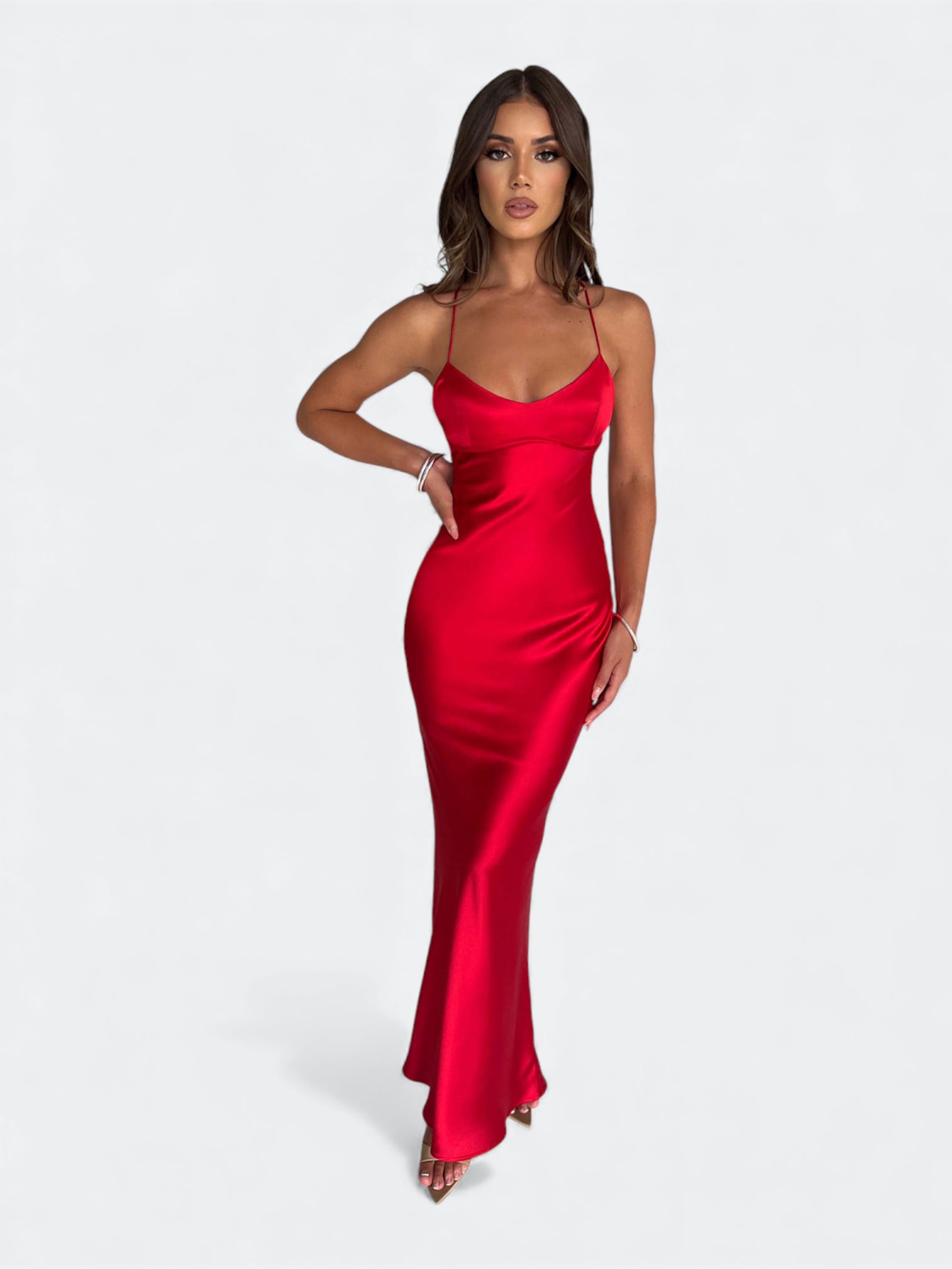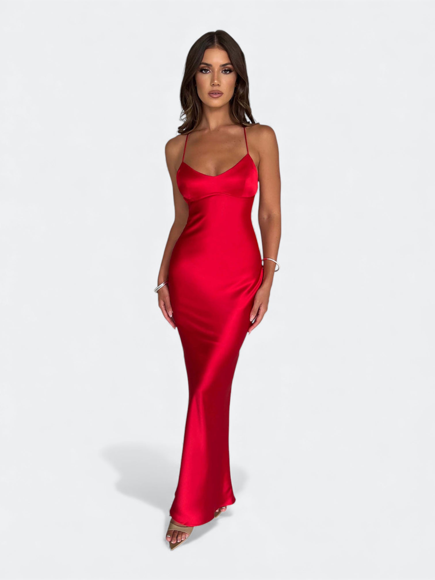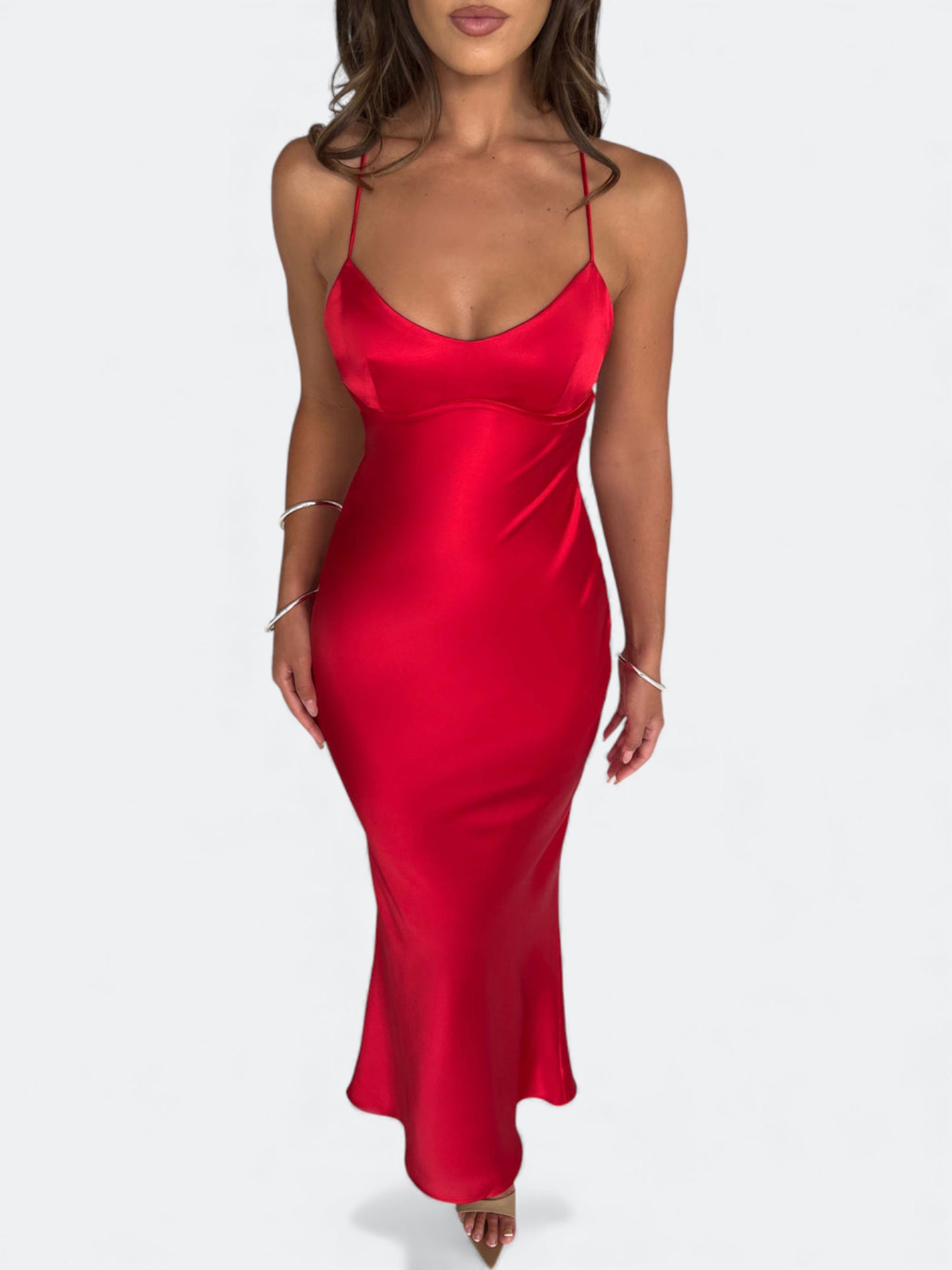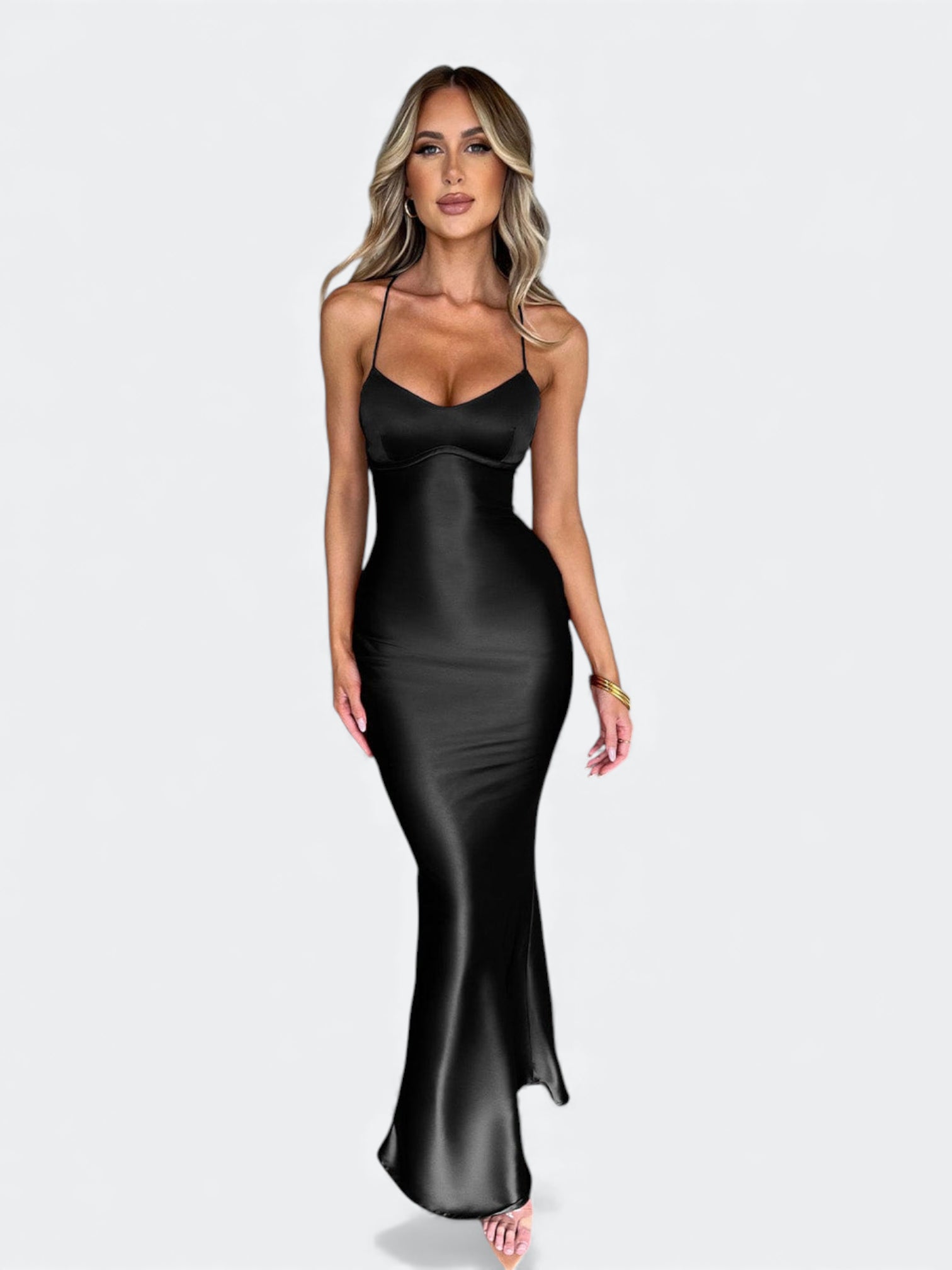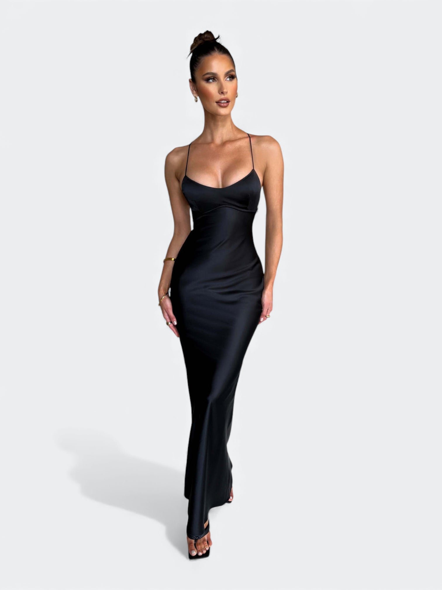Zmysłowa, elegancka i stworzona na wieczory, w które ciało ma płynąć razem z ruchem tkaniny. Ten dopasowany fason z cienkimi ramiączkami podkreśla linię talii i bioder, a satynowa powierzchnia układa się gładko i miękko przy każdym kroku. Obniżony tył z krzyżującymi się paskami dodaje lekkości i tworzy efekt subtelnego odsłonięcia. To sukienka idealna na taneczne noce, eleganckie kolacje i wyjątkowe momenty, które wymagają minimalistycznej, ale mocno działającej formy.