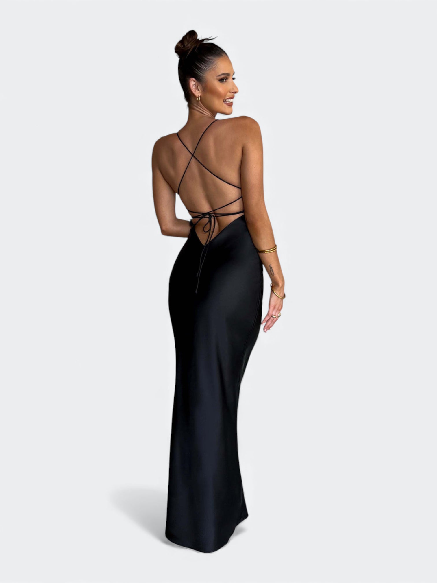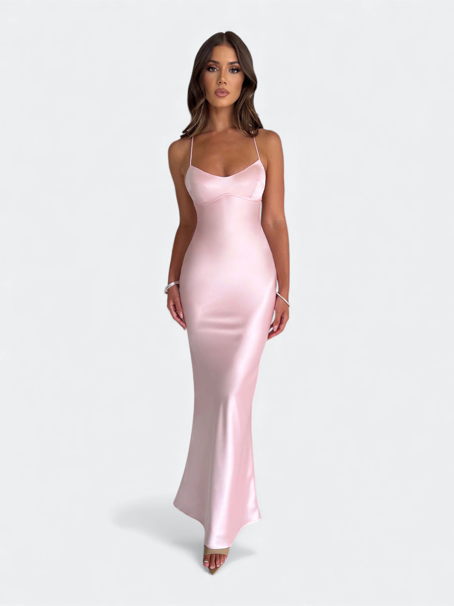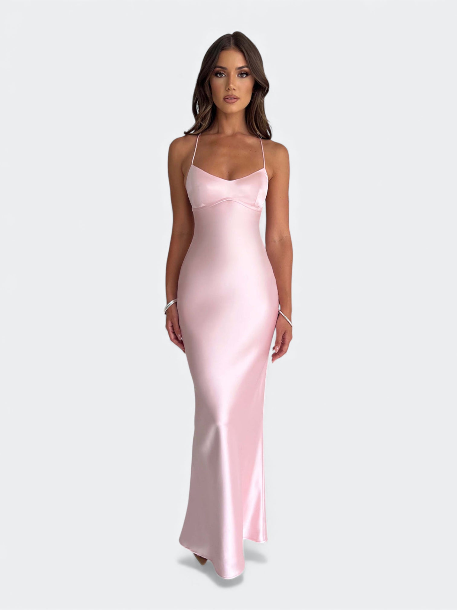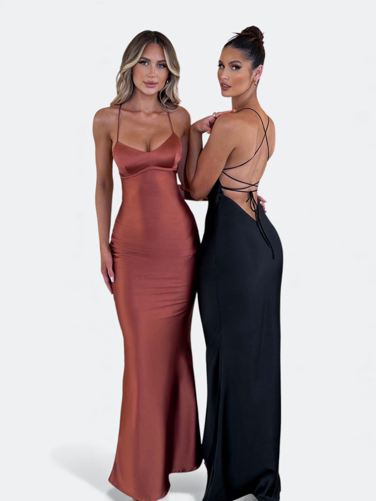 Zmysłowa, elegancka i stworzona na wieczory, w które ciało ma płynąć razem z ruchem tkaniny. Ten dopasowany fason z cienkimi ramiączkami podkreśla linię talii i bioder, a satynowa powierzchnia układa się gładko i miękko przy każdym kroku. Obniżony tył z krzyżującymi się paskami dodaje lekkości i tworzy efekt subtelnego odsłonięcia. To sukienka idealna na taneczne noce, eleganckie kolacje i wyjątkowe momenty, które wymagają minimalistycznej, ale mocno działającej formy.