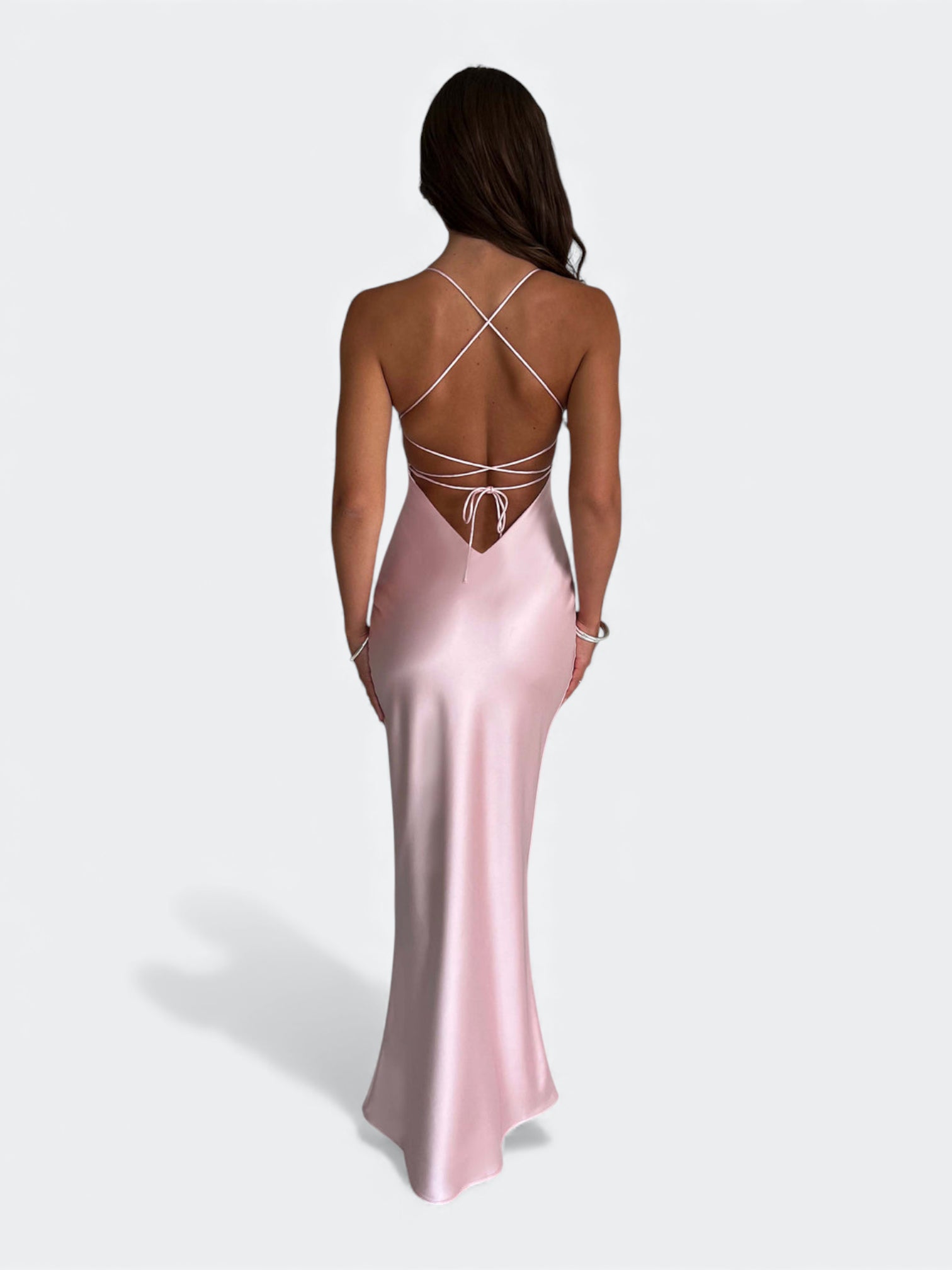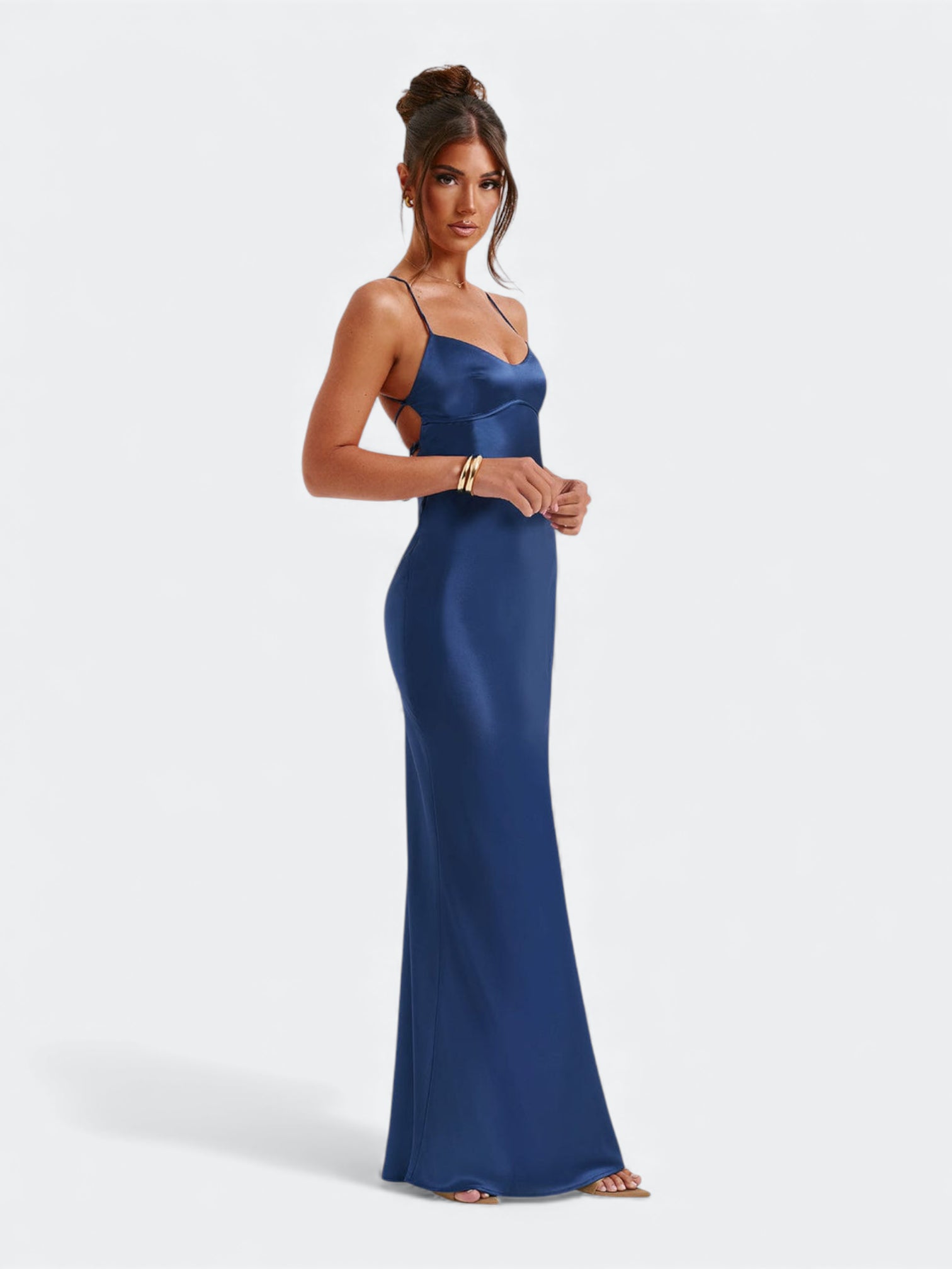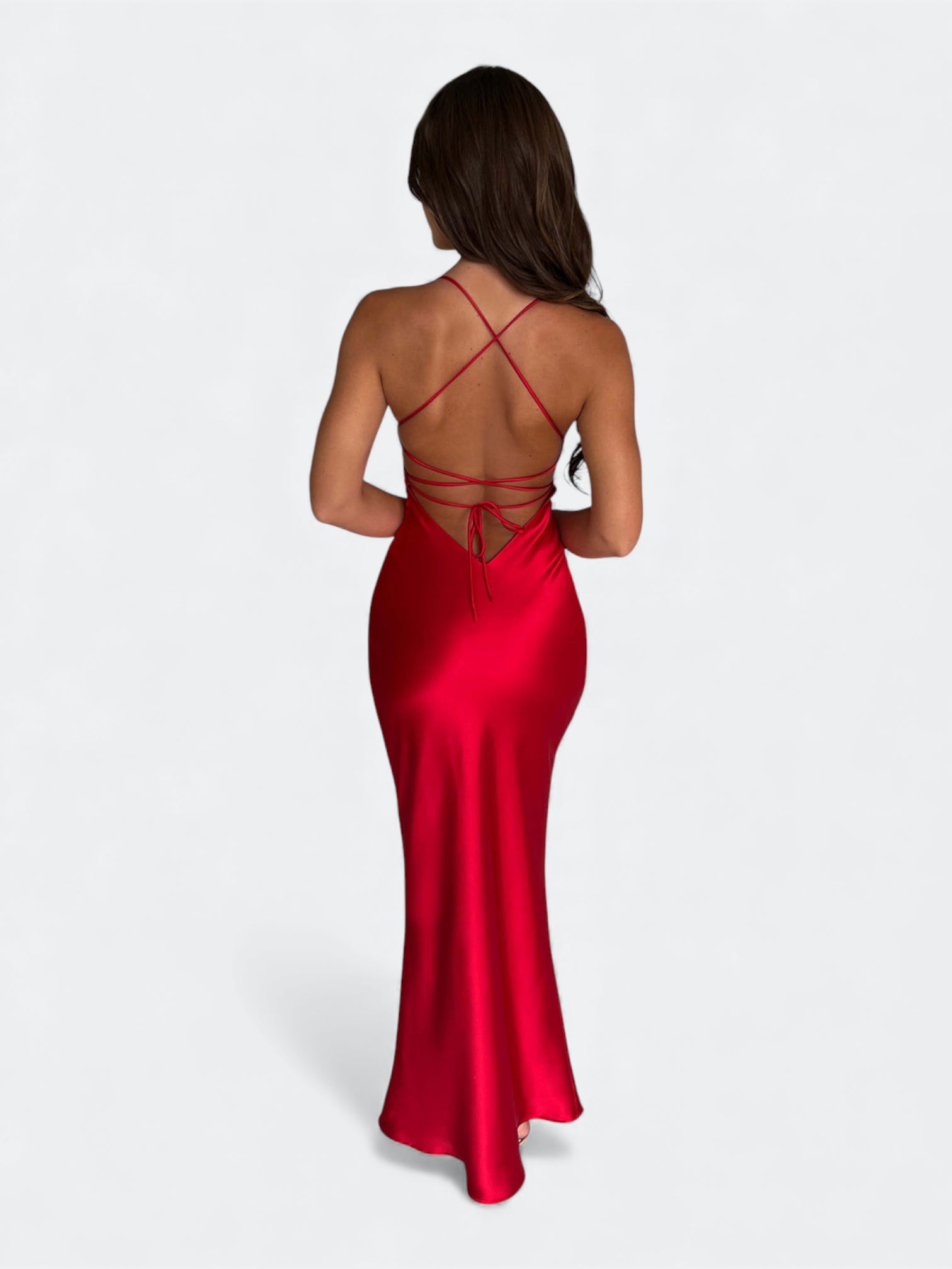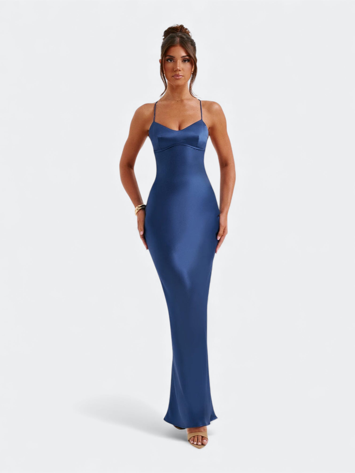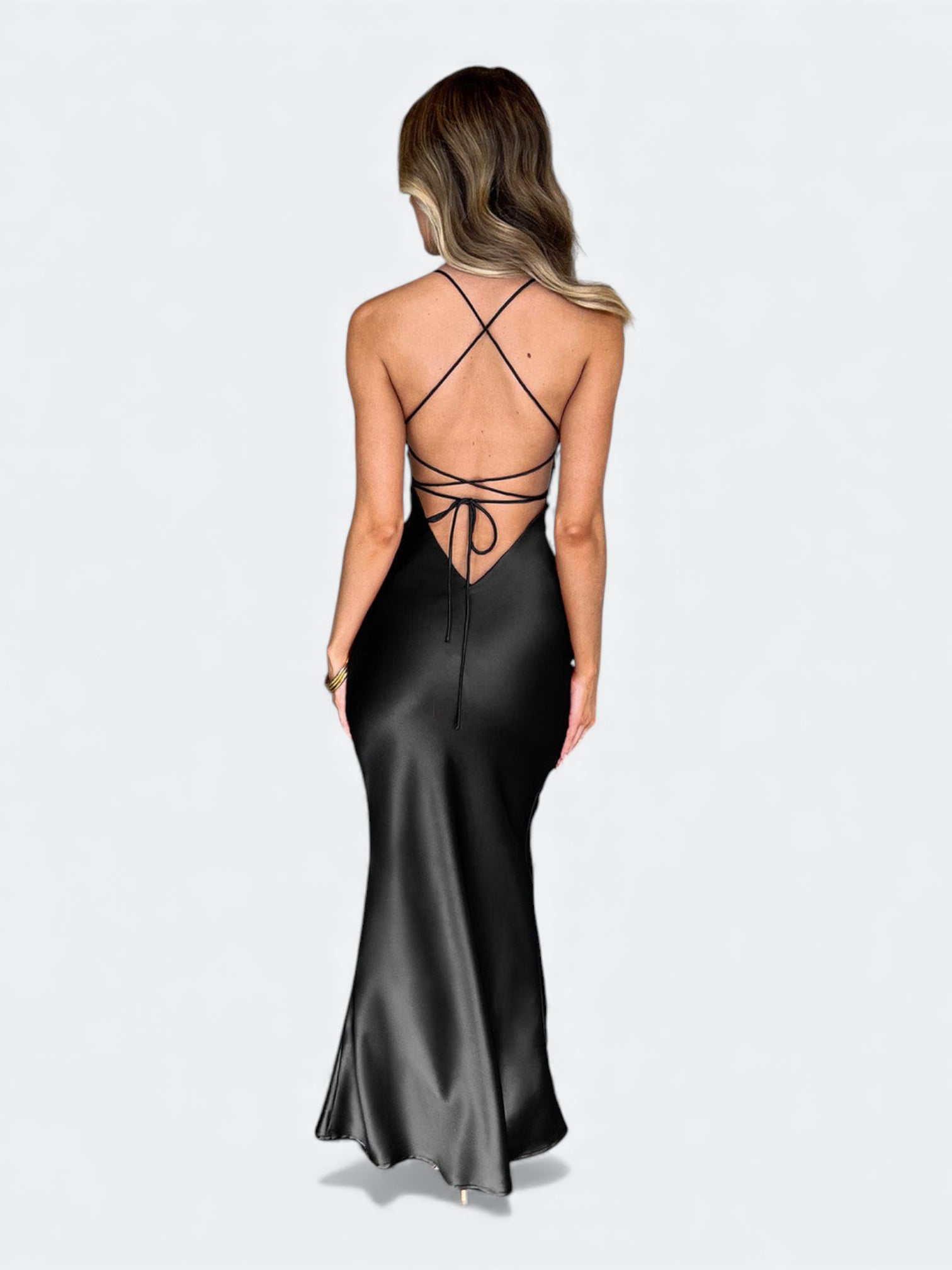 Zmysłowa, elegancka i stworzona na wieczory, w które ciało ma płynąć razem z ruchem tkaniny. Ten dopasowany fason z cienkimi ramiączkami podkreśla linię talii i bioder, a satynowa powierzchnia układa się gładko i miękko przy każdym kroku. Obniżony tył z krzyżującymi się paskami dodaje lekkości i tworzy efekt subtelnego odsłonięcia. To sukienka idealna na taneczne noce, eleganckie kolacje i wyjątkowe momenty, które wymagają minimalistycznej, ale mocno działającej formy.