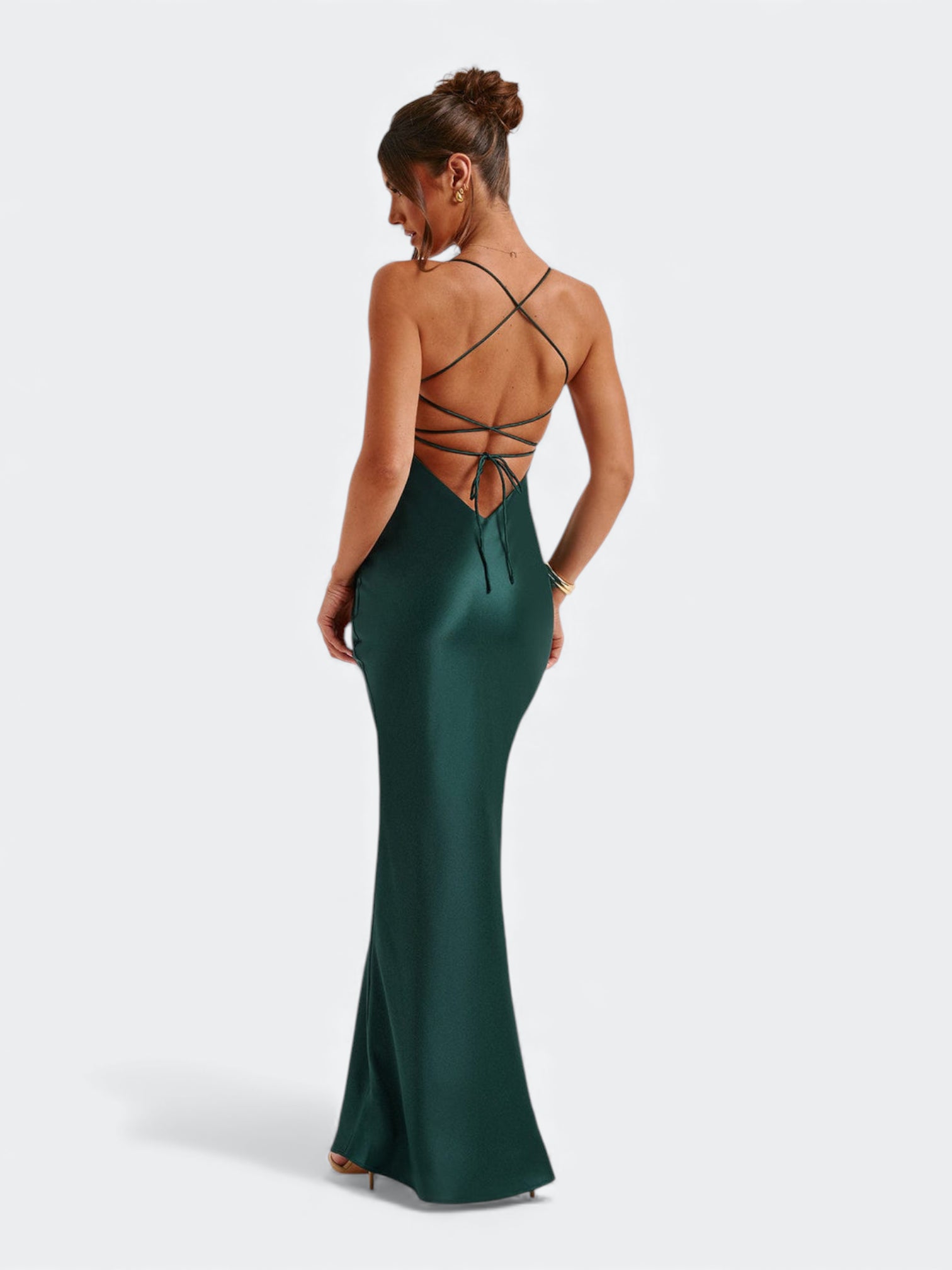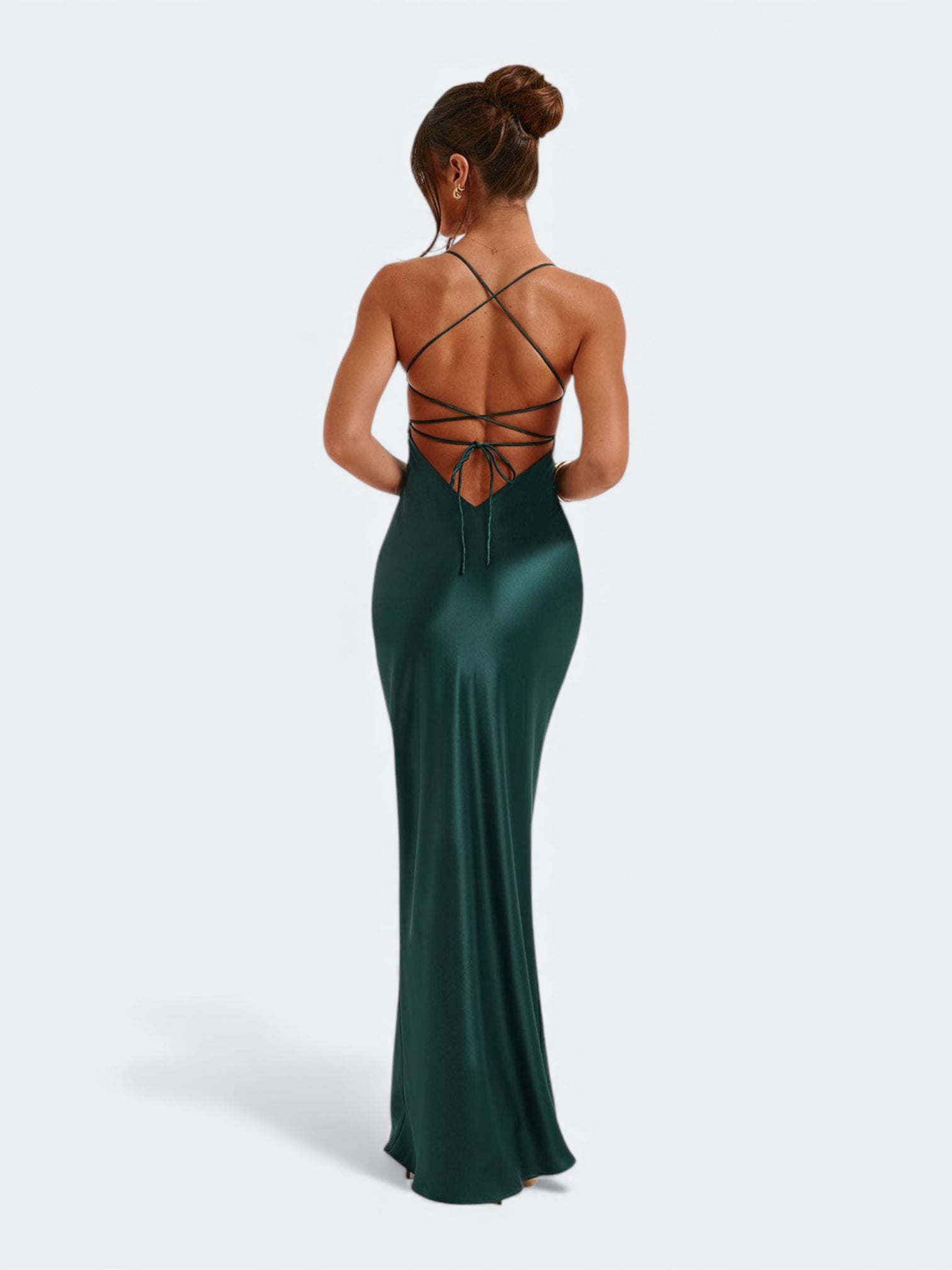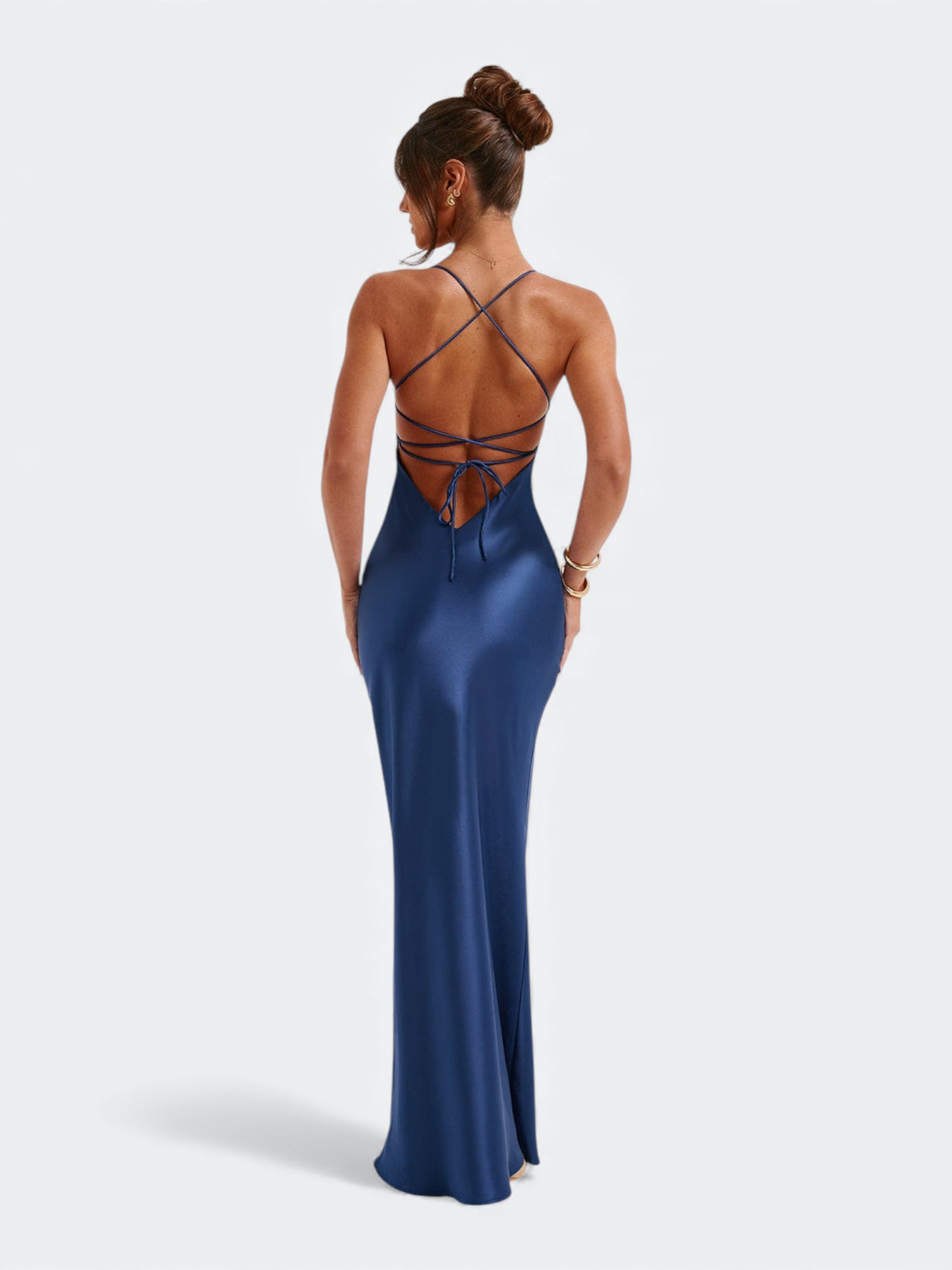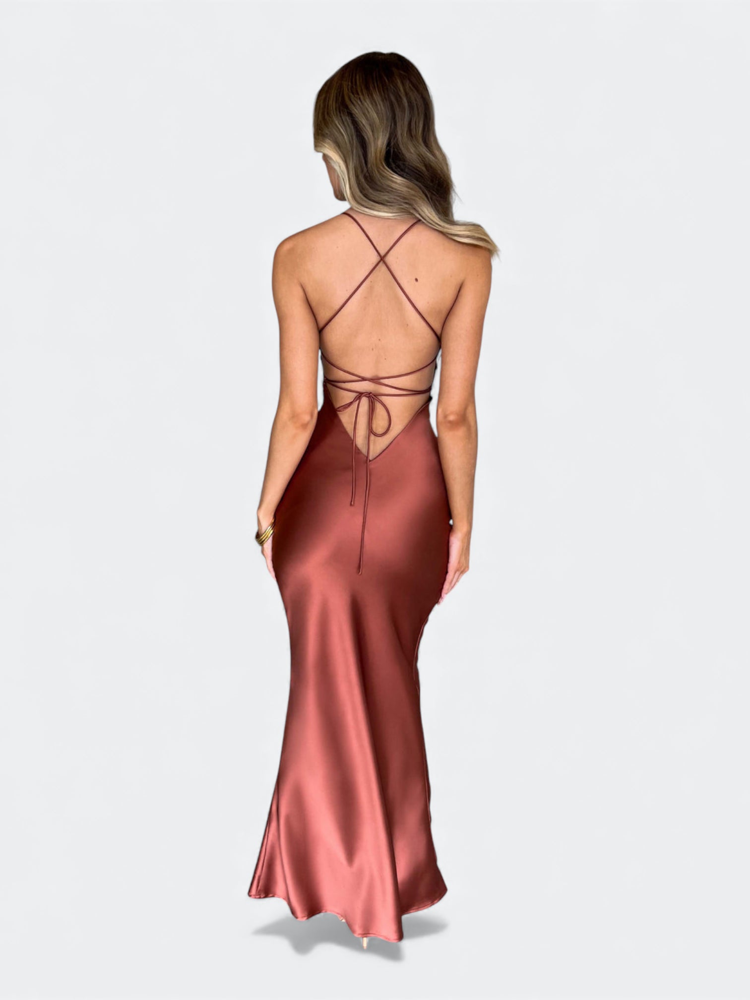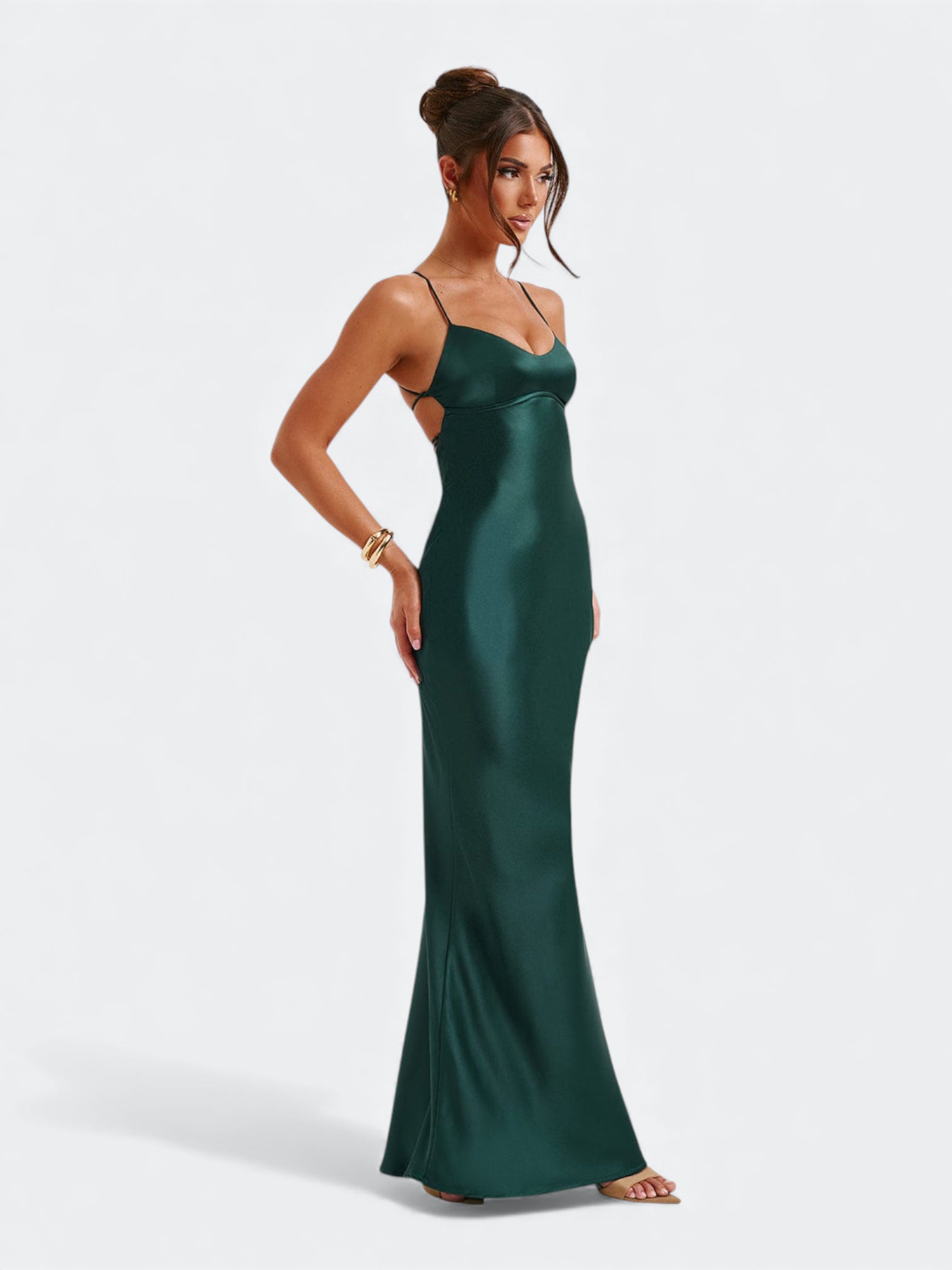 Zmysłowa, elegancka i stworzona na wieczory, w które ciało ma płynąć razem z ruchem tkaniny. Ten dopasowany fason z cienkimi ramiączkami podkreśla linię talii i bioder, a satynowa powierzchnia układa się gładko i miękko przy każdym kroku. Obniżony tył z krzyżującymi się paskami dodaje lekkości i tworzy efekt subtelnego odsłonięcia. To sukienka idealna na taneczne noce, eleganckie kolacje i wyjątkowe momenty, które wymagają minimalistycznej, ale mocno działającej formy.
