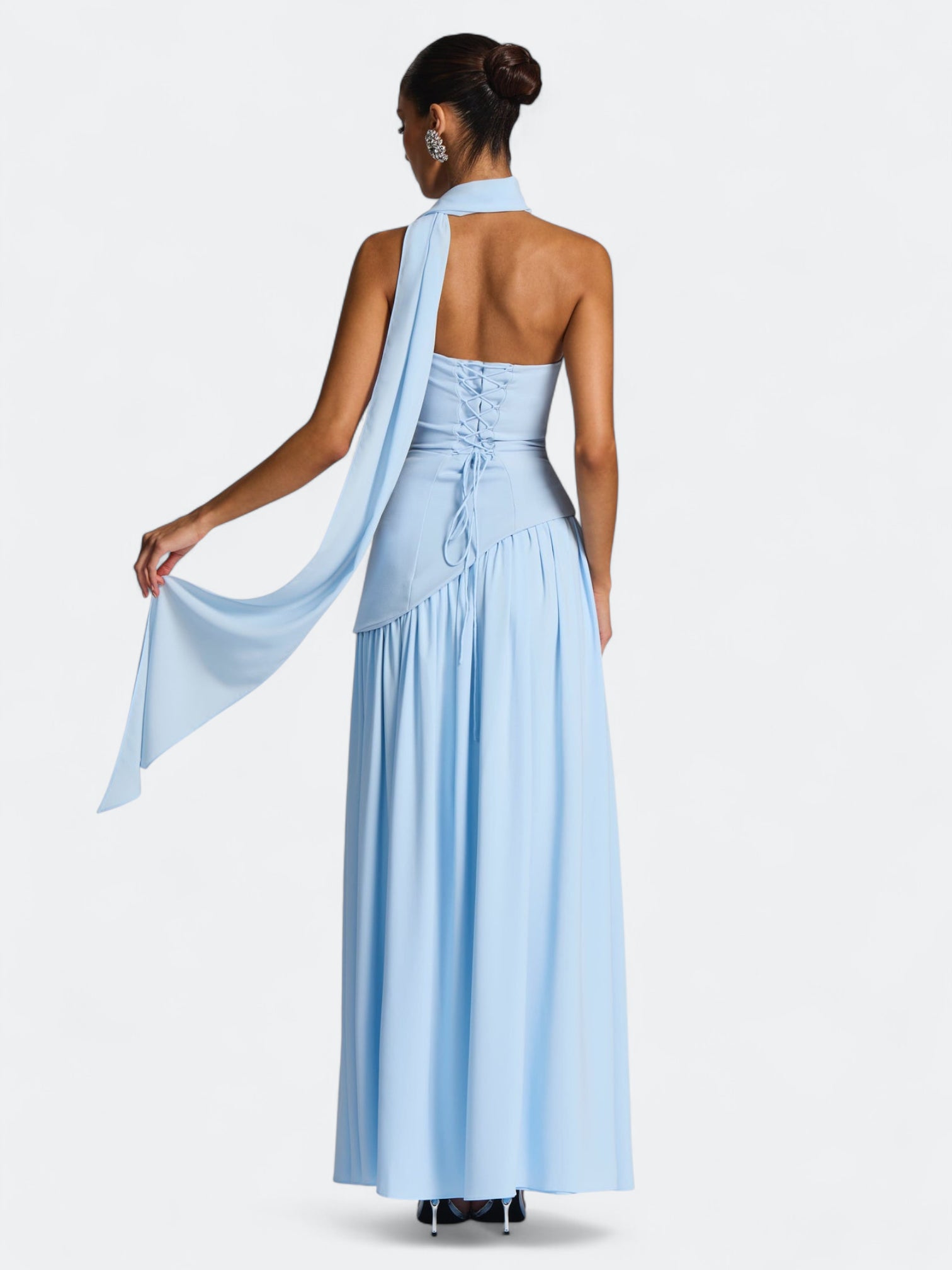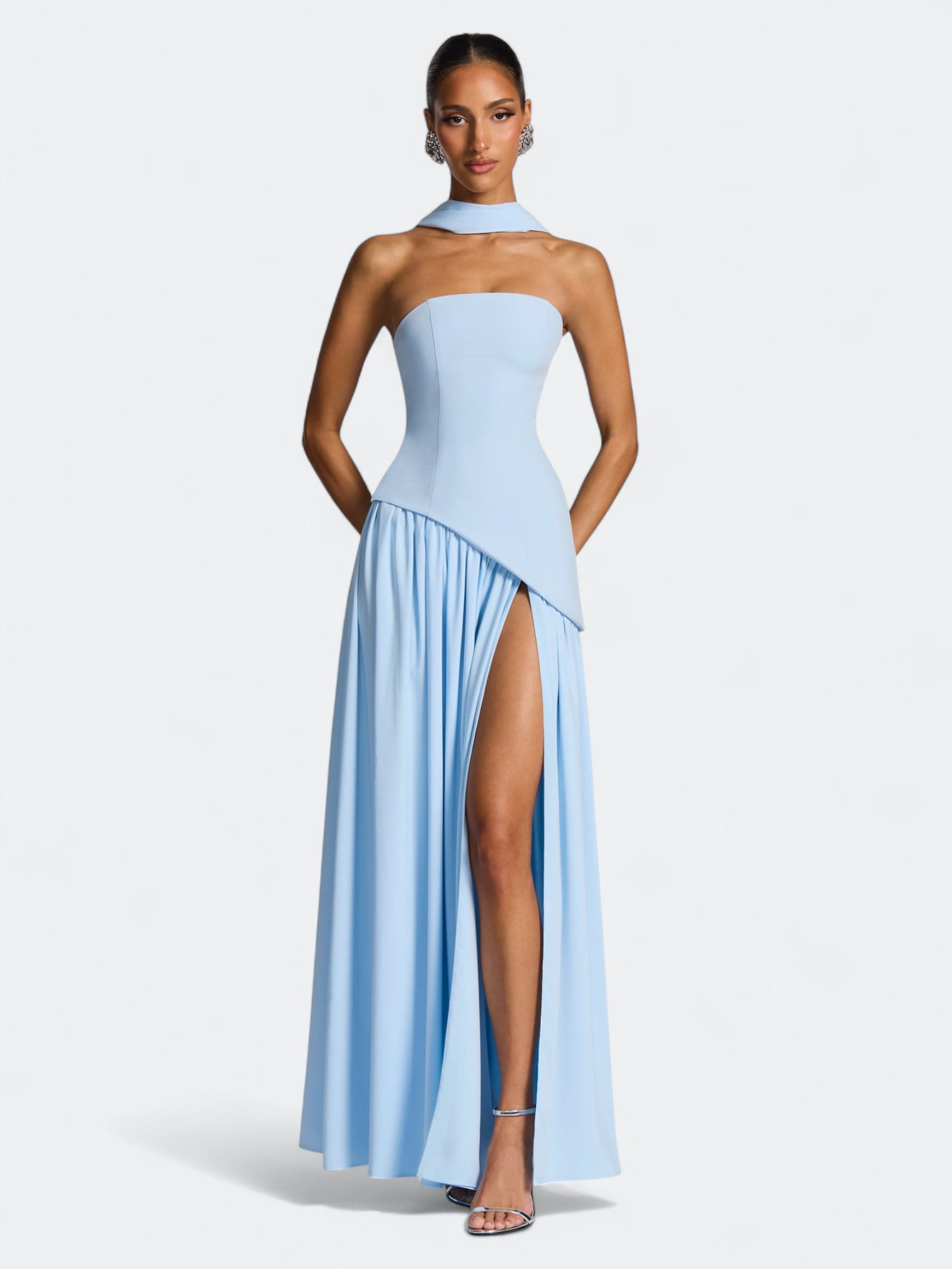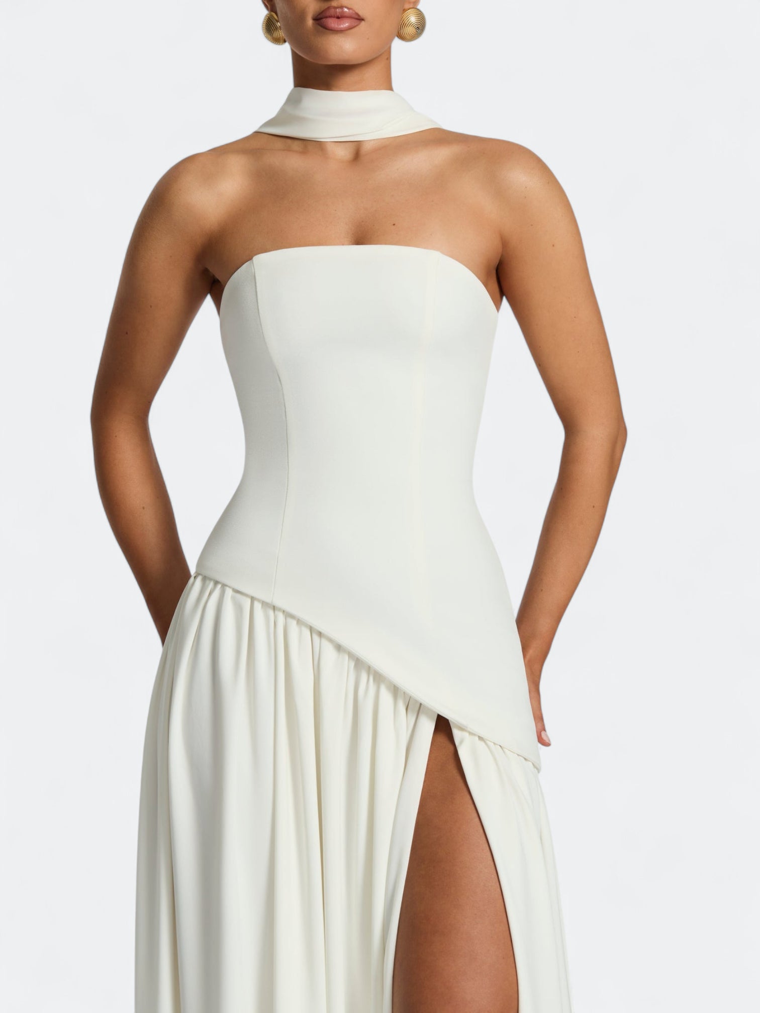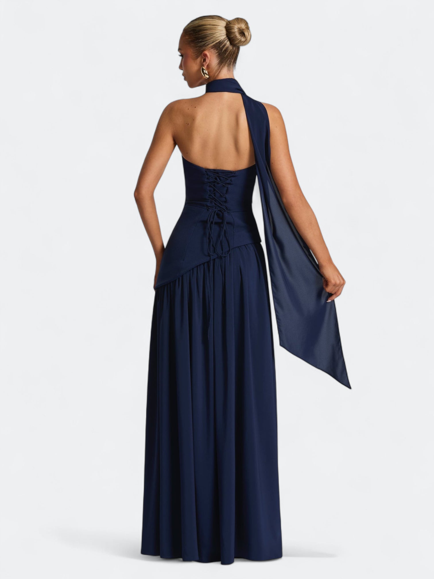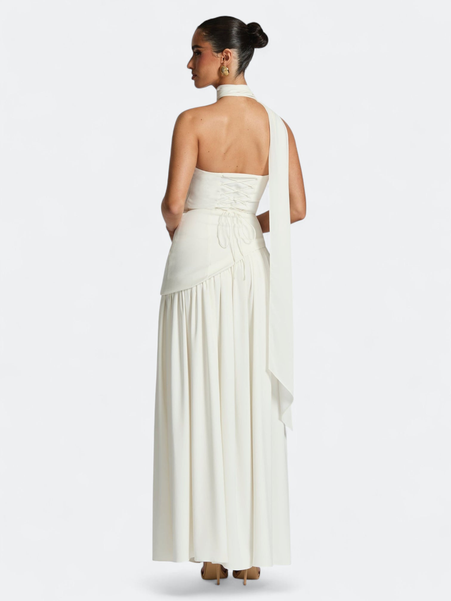 Lunara łączy architekturę formy z kobiecą lekkością. Dopasowany gorset z gładkiej, matowej krepy subtelnie modeluje sylwetkę, a pełna, zwiewna spódnica z szyfonu miękko pracuje w ruchu. Asymetryczny dół i wysokie rozcięcie nadają nowoczesny charakter, a przewieszony przy szyi panel materiału dodaje miękkości. Zapięcie krytym zamkiem oraz wiązanie gorsetowe na plecach domykają czystą, elegancką linię.