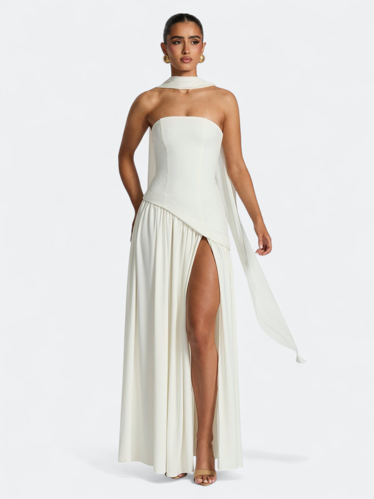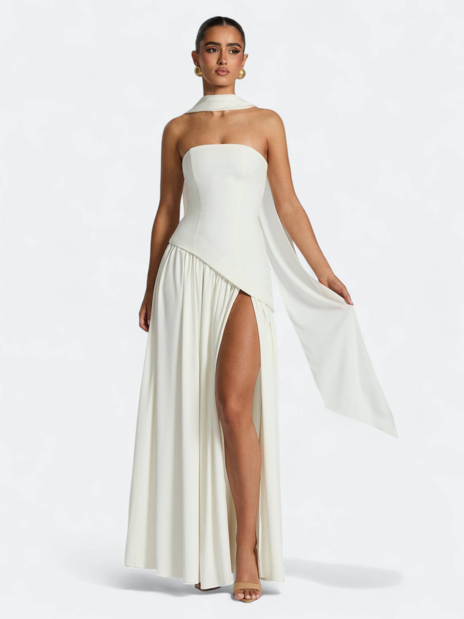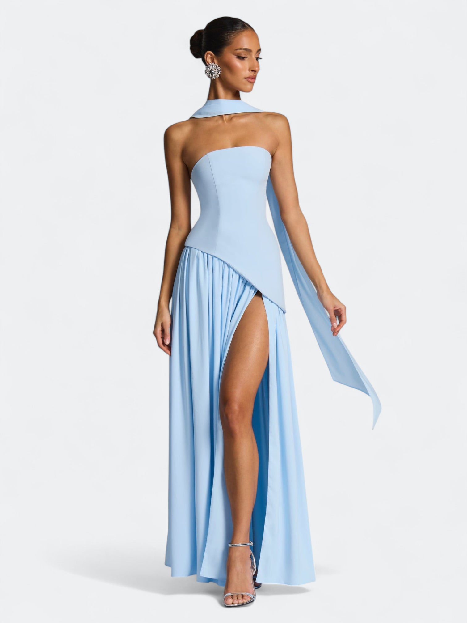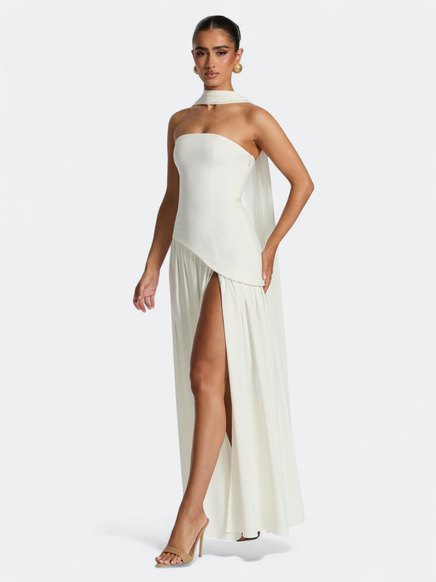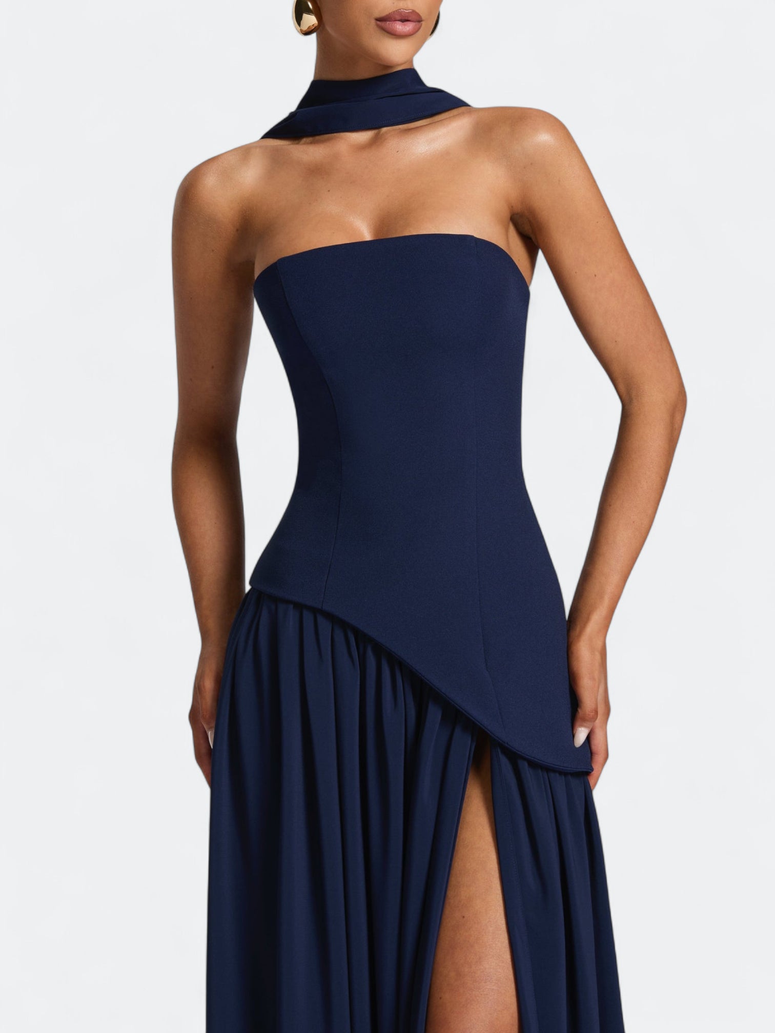 Lunara łączy architekturę formy z kobiecą lekkością. Dopasowany gorset z gładkiej, matowej krepy subtelnie modeluje sylwetkę, a pełna, zwiewna spódnica z szyfonu miękko pracuje w ruchu. Asymetryczny dół i wysokie rozcięcie nadają nowoczesny charakter, a przewieszony przy szyi panel materiału dodaje miękkości. Zapięcie krytym zamkiem oraz wiązanie gorsetowe na plecach domykają czystą, elegancką linię.