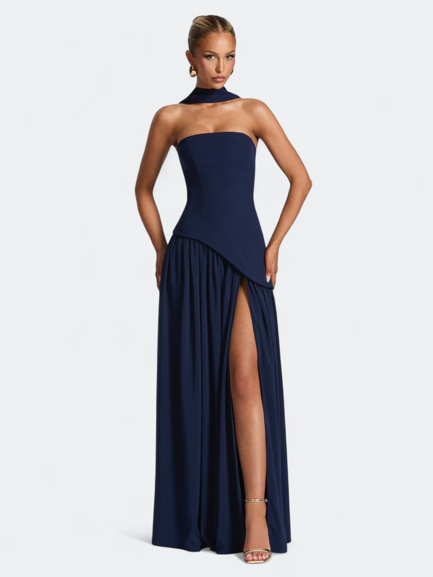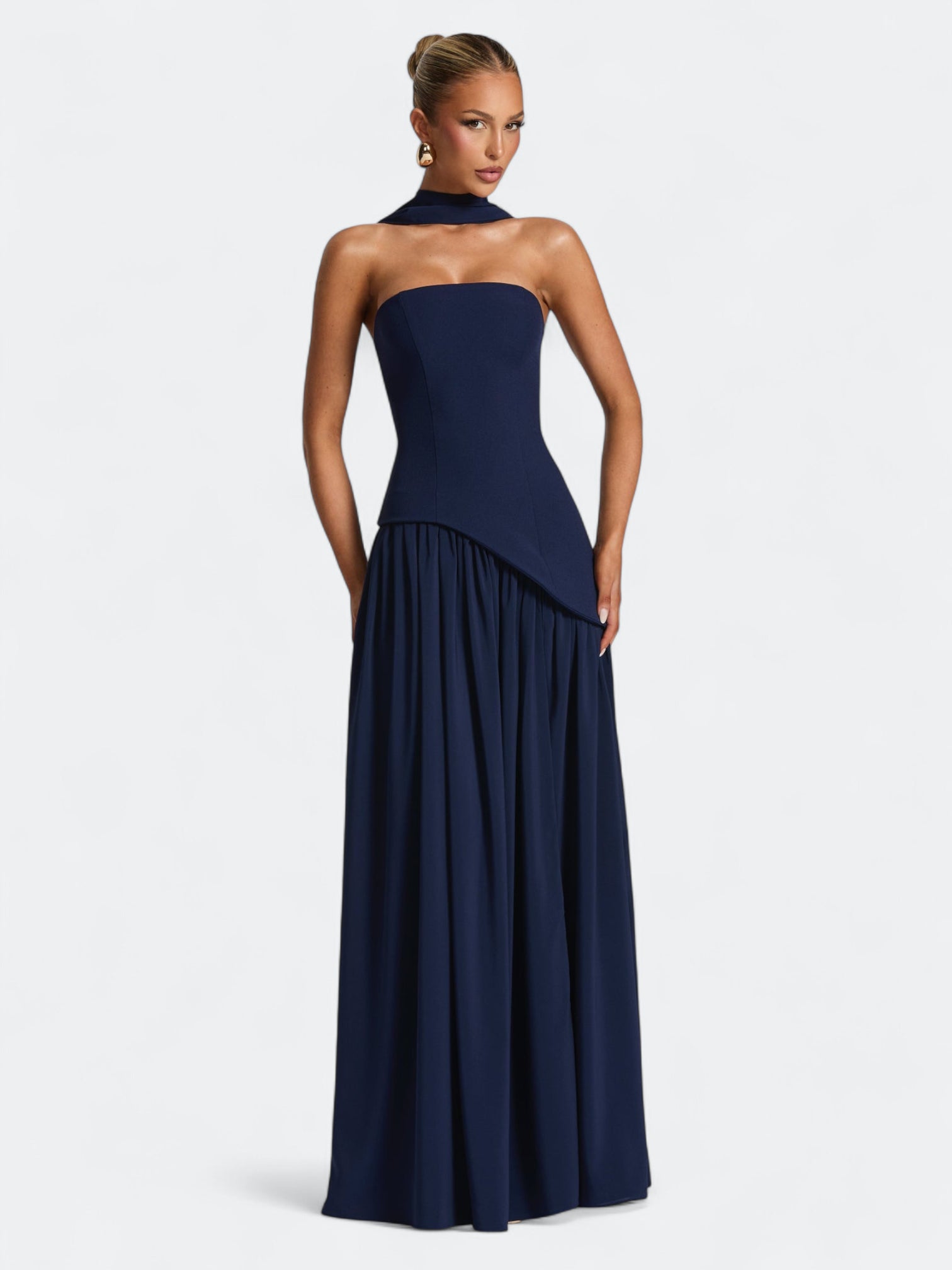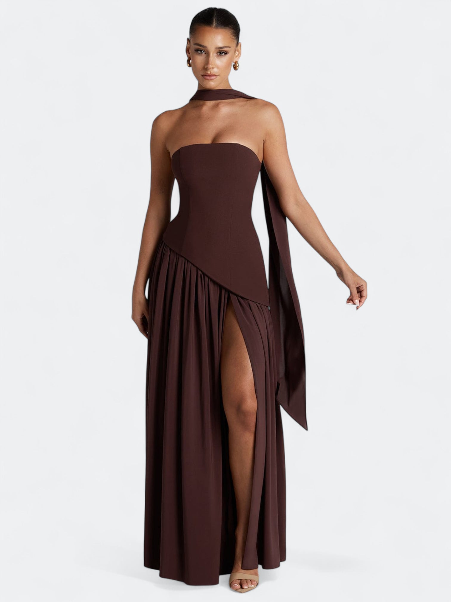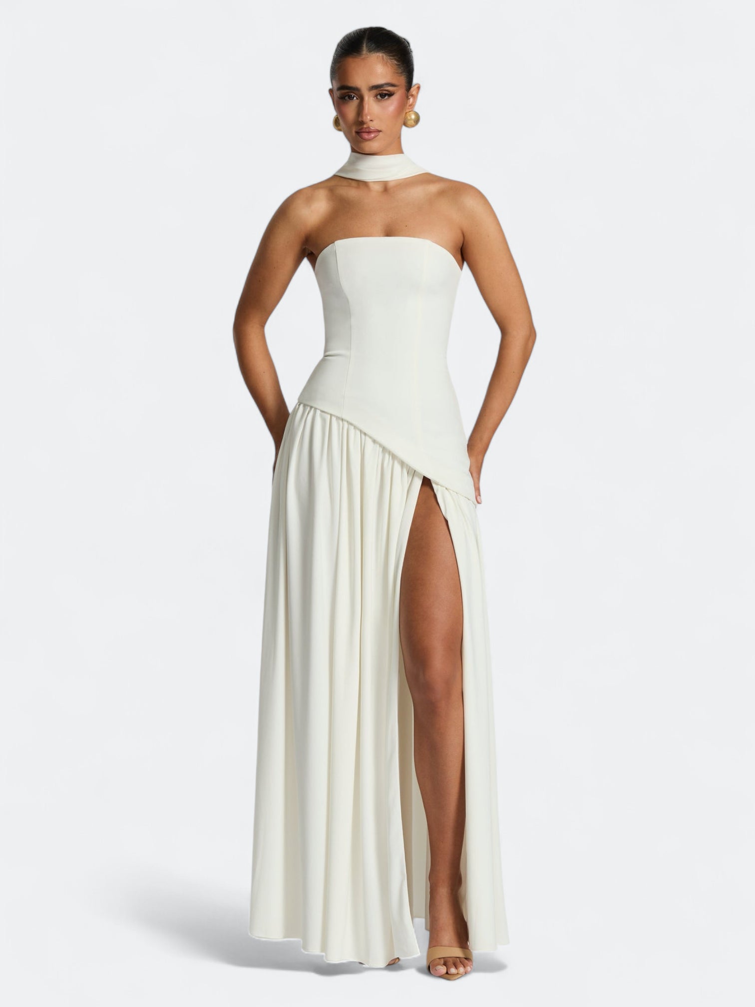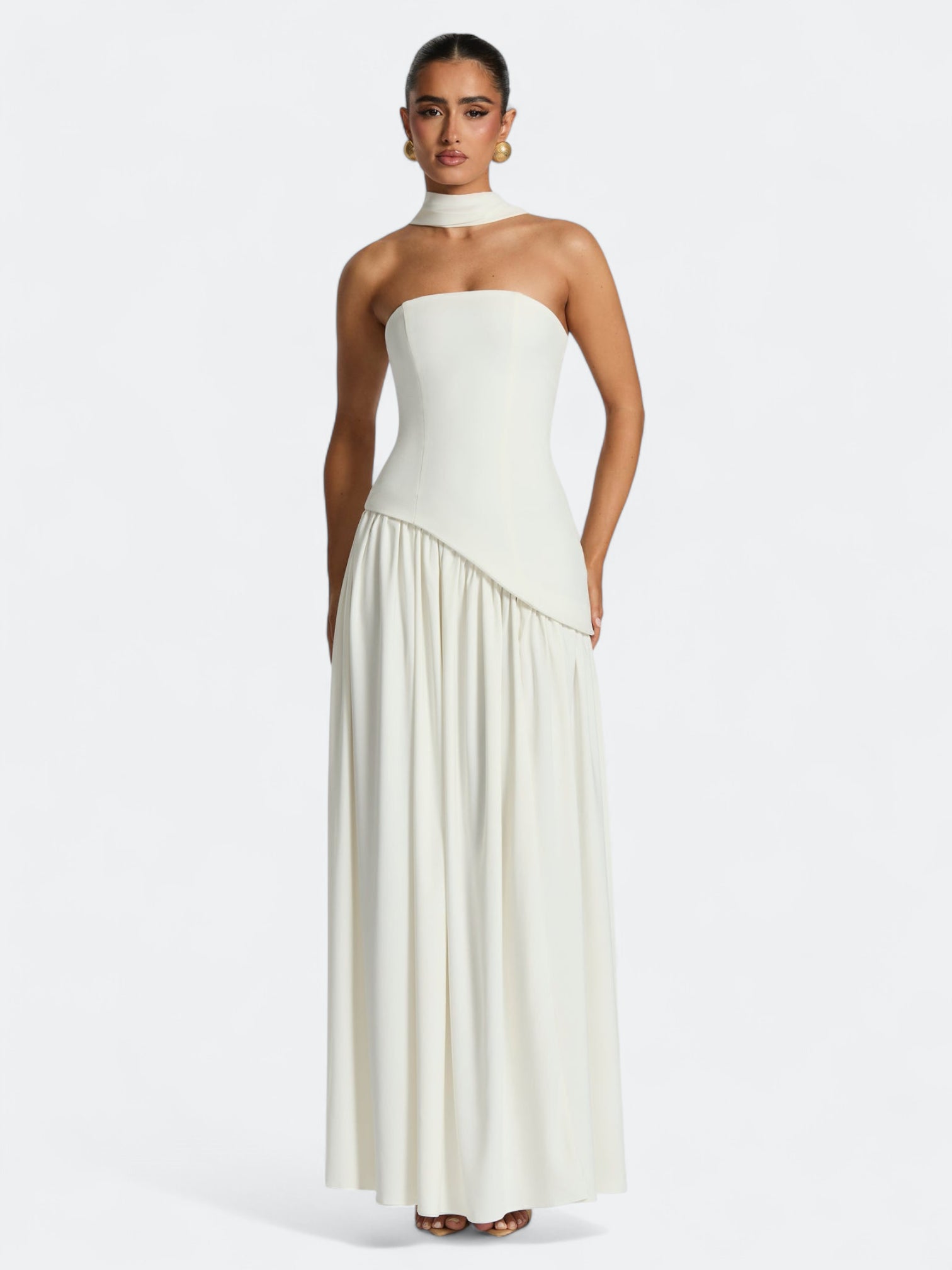 Lunara łączy architekturę formy z kobiecą lekkością. Dopasowany gorset z gładkiej, matowej krepy subtelnie modeluje sylwetkę, a pełna, zwiewna spódnica z szyfonu miękko pracuje w ruchu. Asymetryczny dół i wysokie rozcięcie nadają nowoczesny charakter, a przewieszony przy szyi panel materiału dodaje miękkości. Zapięcie krytym zamkiem oraz wiązanie gorsetowe na plecach domykają czystą, elegancką linię.