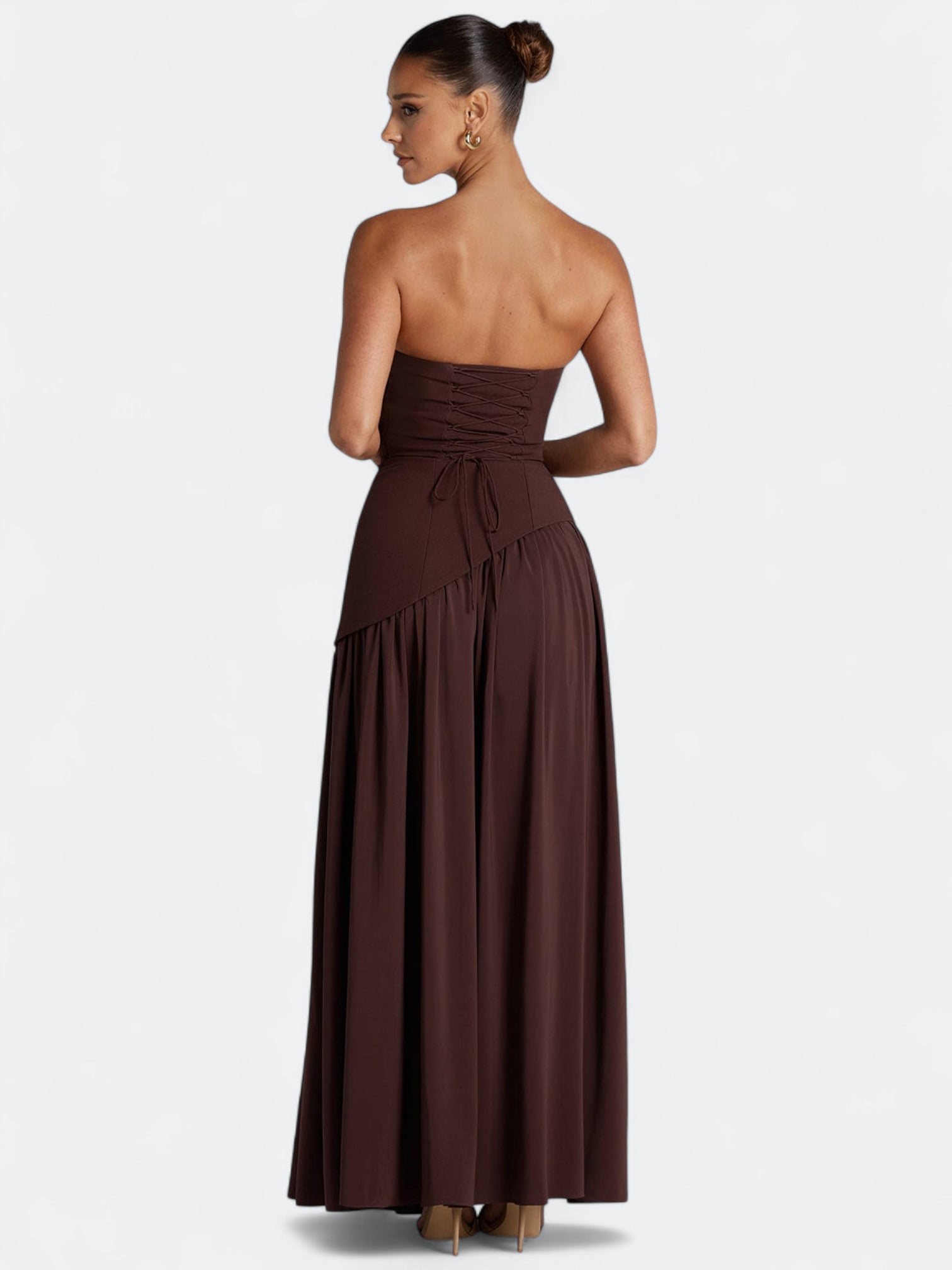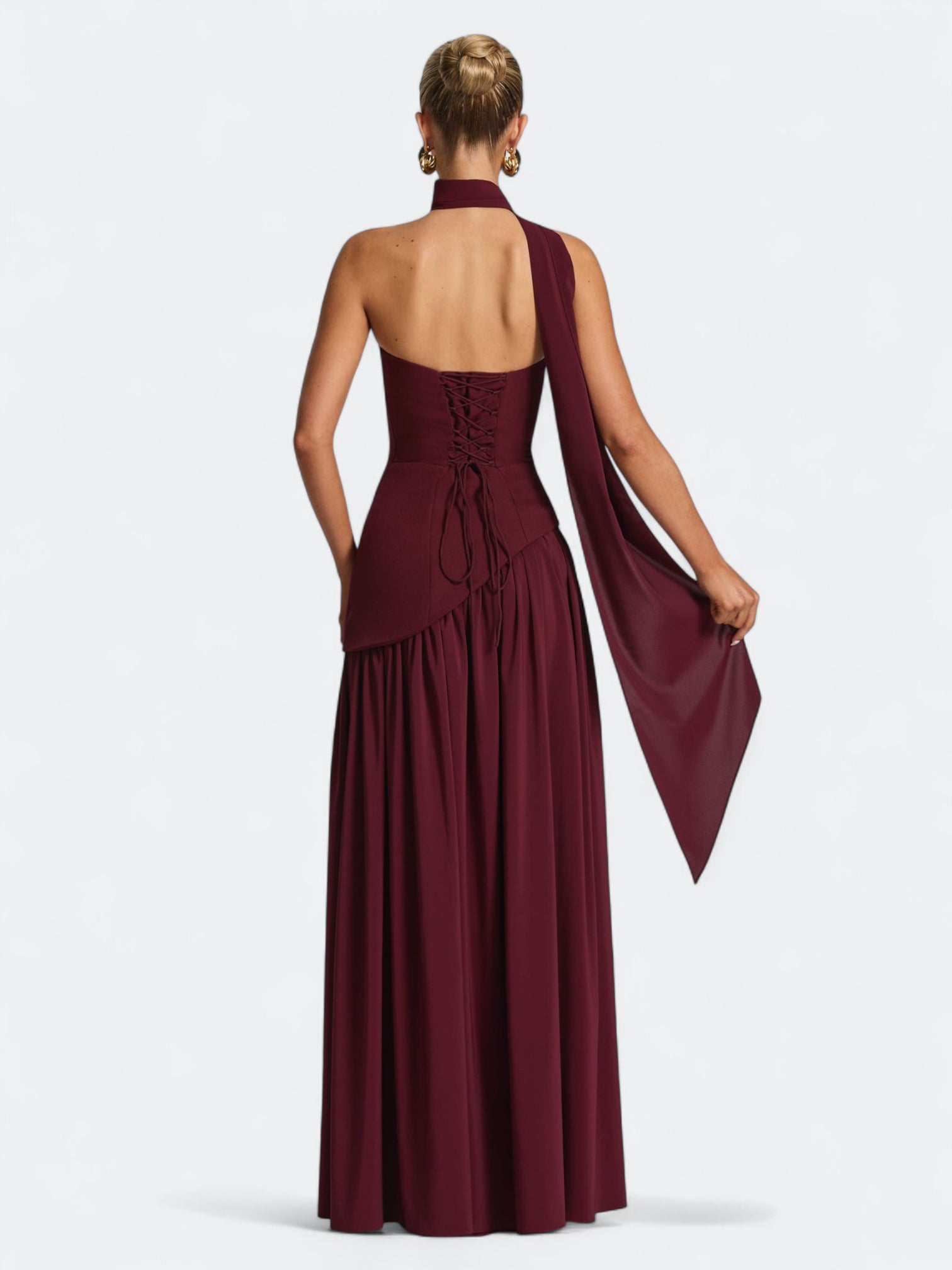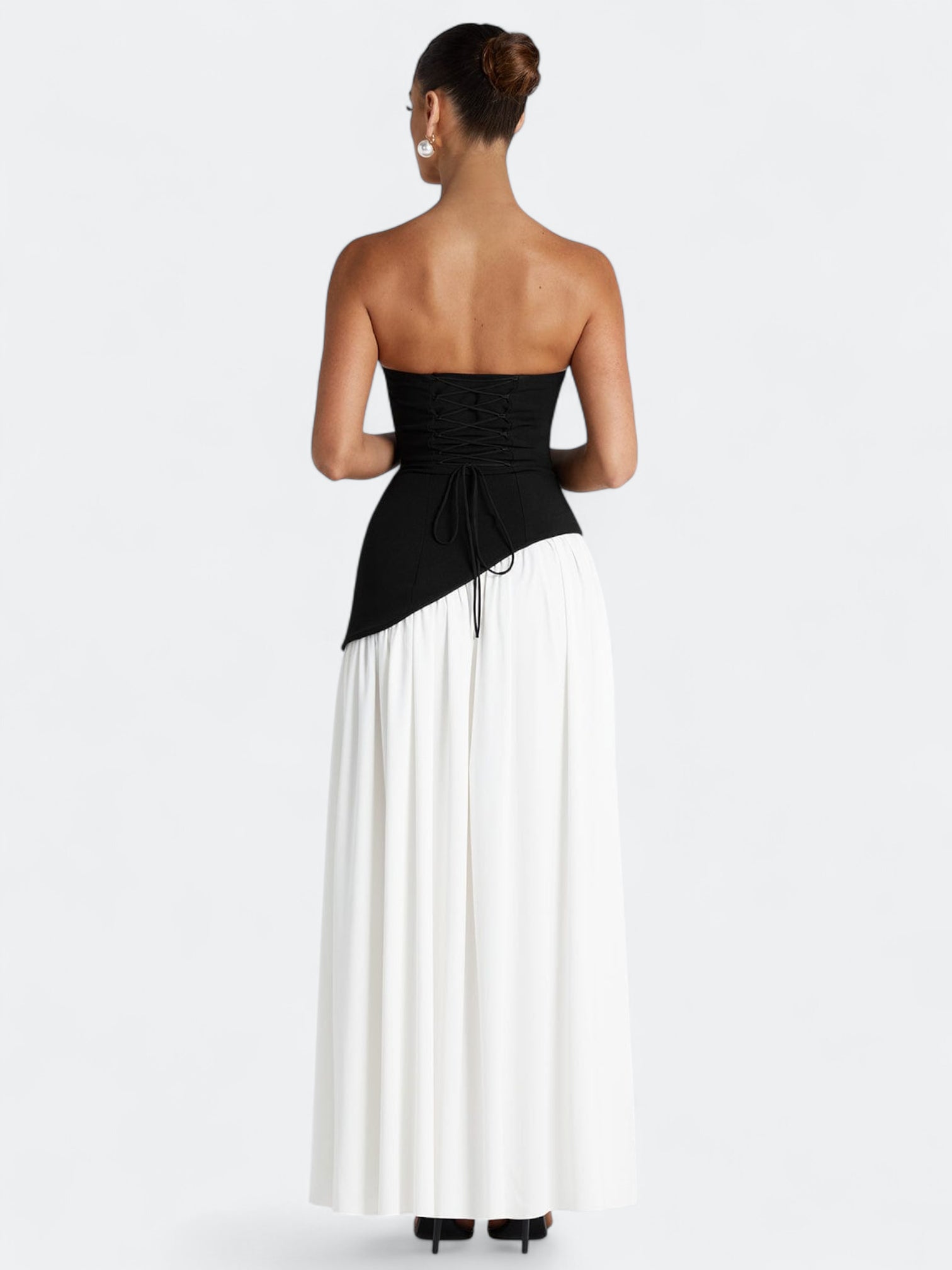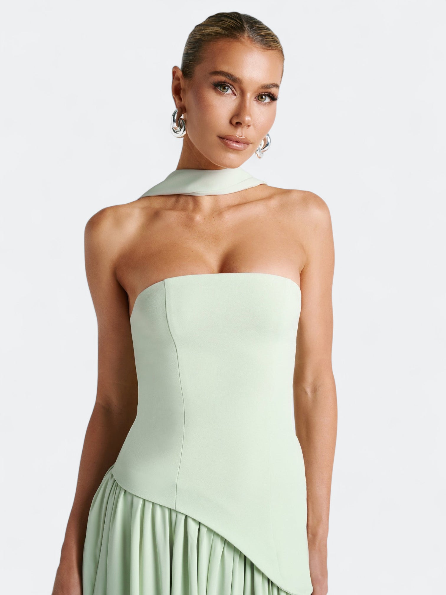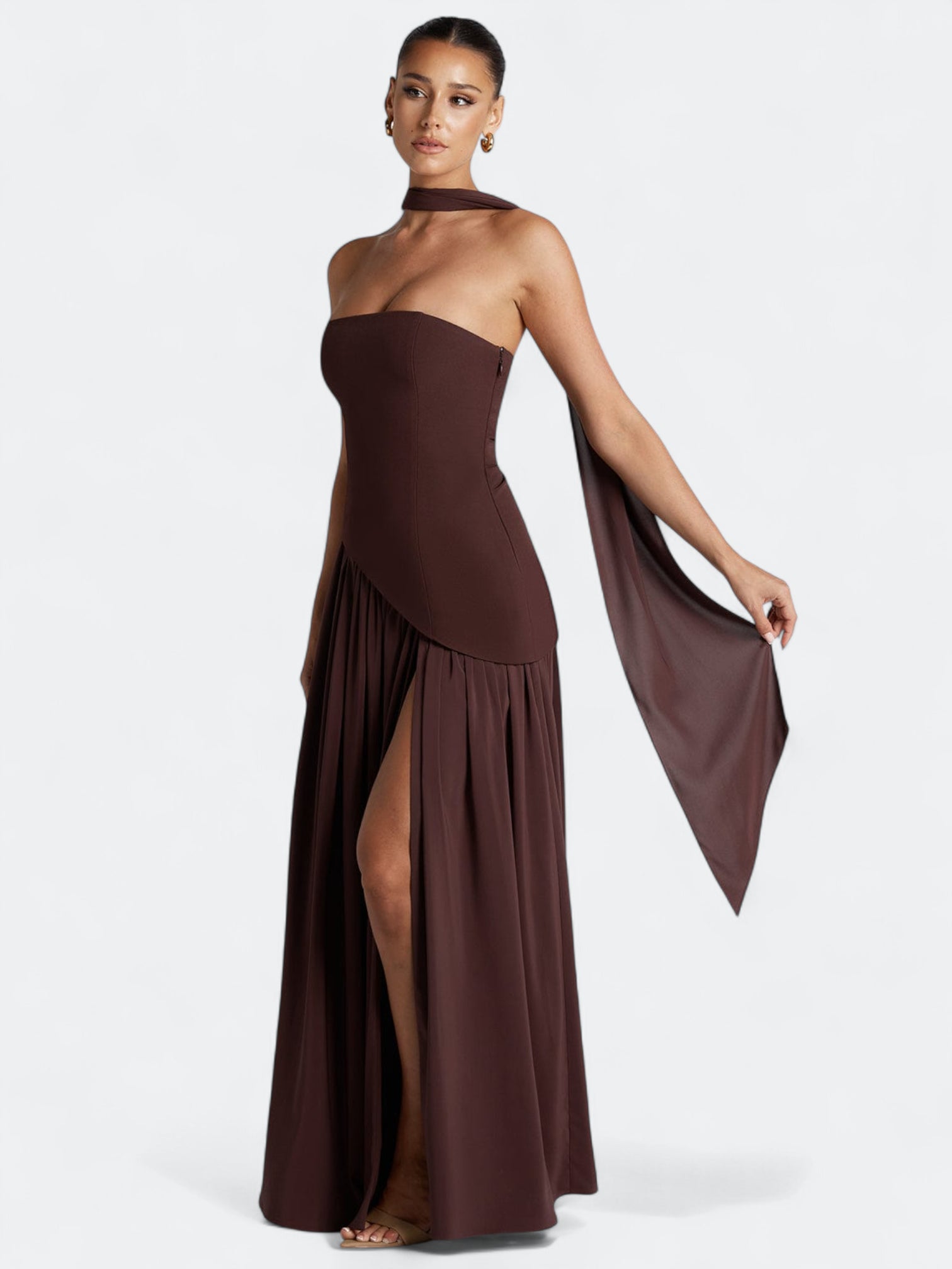 Lunara łączy architekturę formy z kobiecą lekkością. Dopasowany gorset z gładkiej, matowej krepy subtelnie modeluje sylwetkę, a pełna, zwiewna spódnica z szyfonu miękko pracuje w ruchu. Asymetryczny dół i wysokie rozcięcie nadają nowoczesny charakter, a przewieszony przy szyi panel materiału dodaje miękkości. Zapięcie krytym zamkiem oraz wiązanie gorsetowe na plecach domykają czystą, elegancką linię.