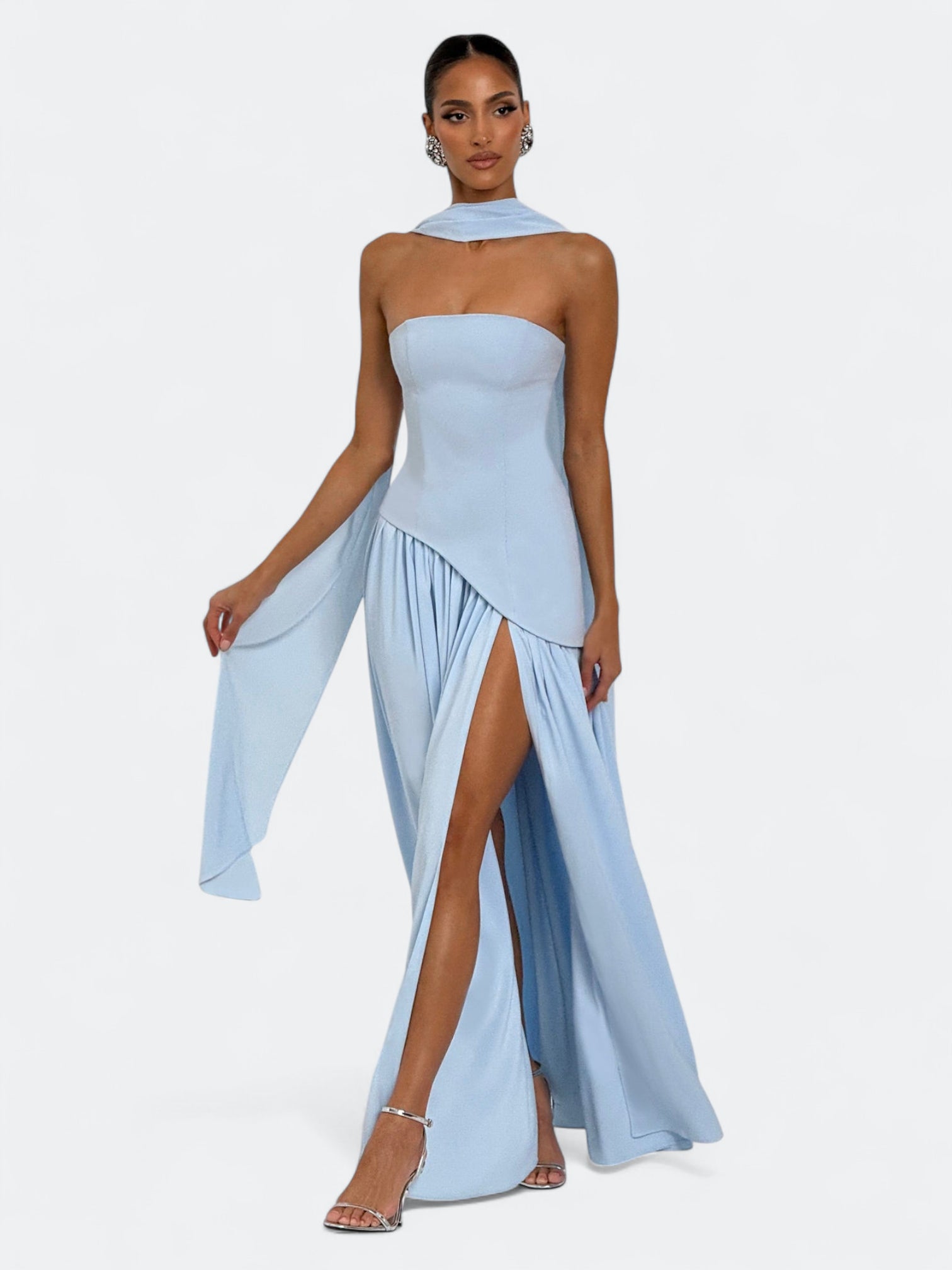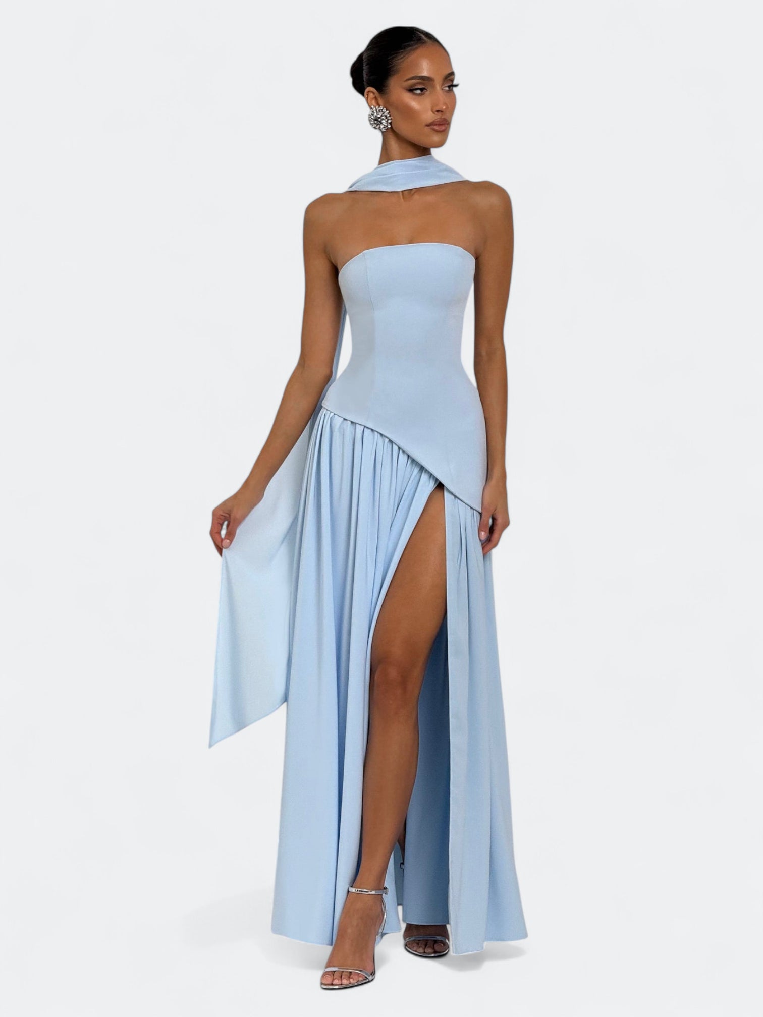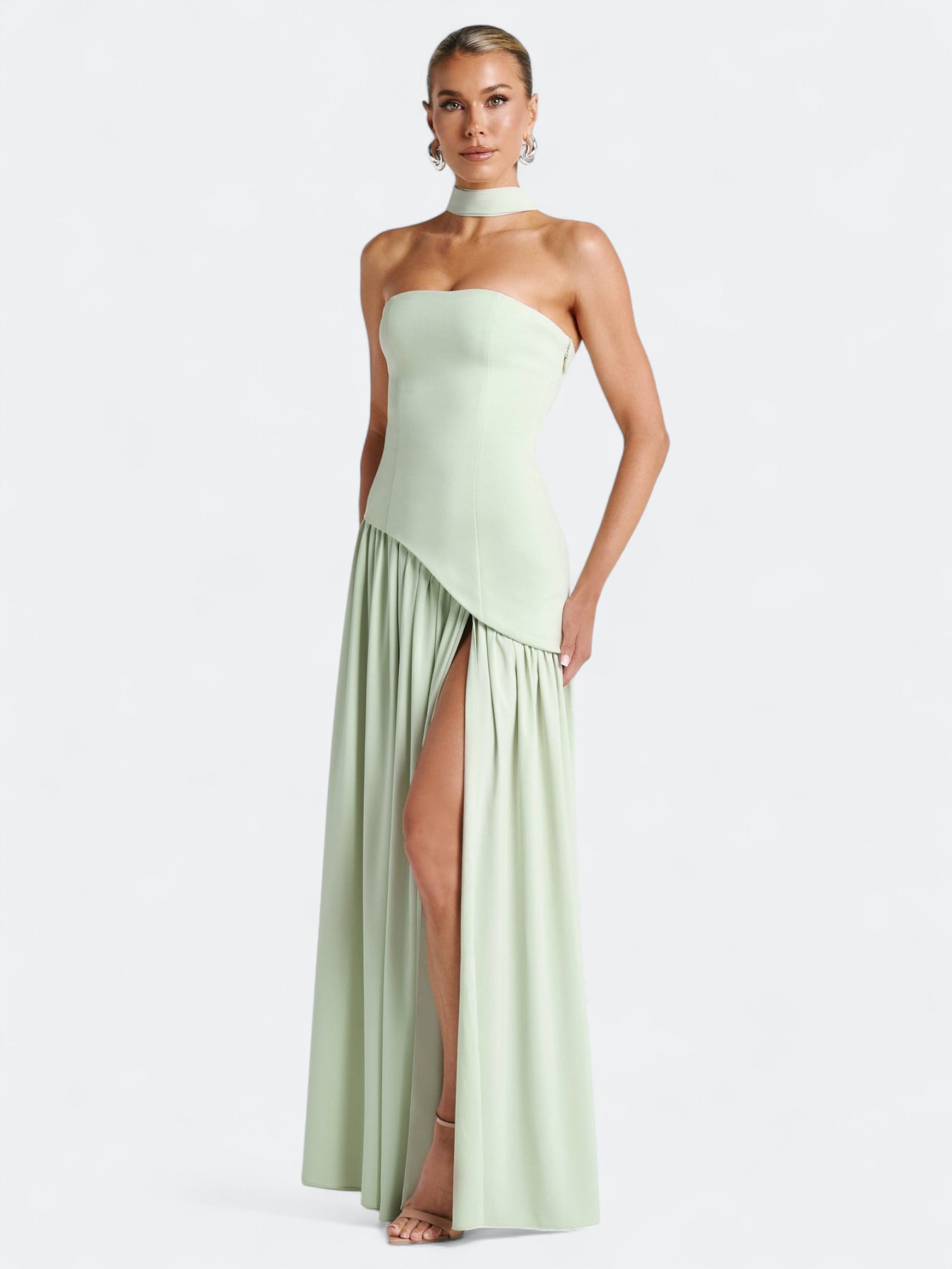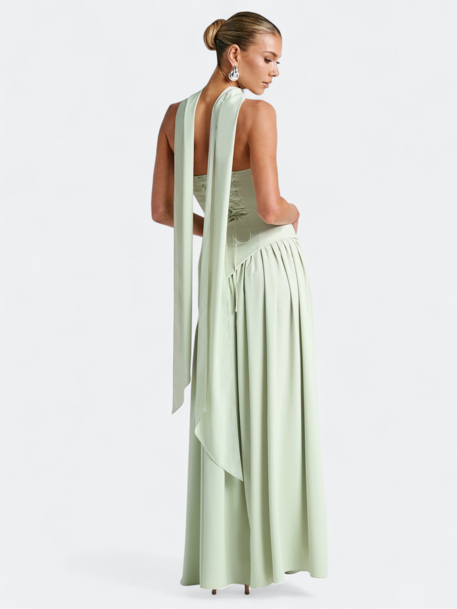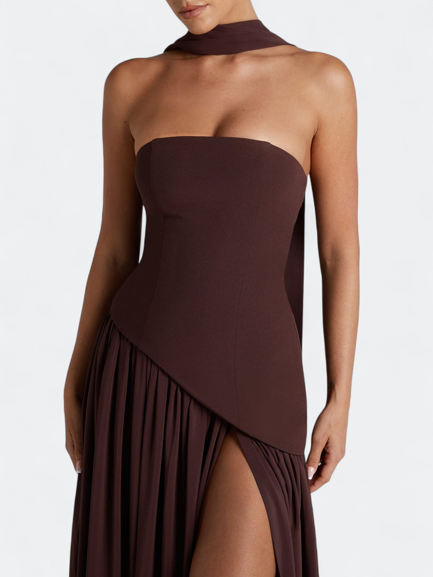 Lunara łączy architekturę formy z kobiecą lekkością. Dopasowany gorset z gładkiej, matowej krepy subtelnie modeluje sylwetkę, a pełna, zwiewna spódnica z szyfonu miękko pracuje w ruchu. Asymetryczny dół i wysokie rozcięcie nadają nowoczesny charakter, a przewieszony przy szyi panel materiału dodaje miękkości. Zapięcie krytym zamkiem oraz wiązanie gorsetowe na plecach domykają czystą, elegancką linię.