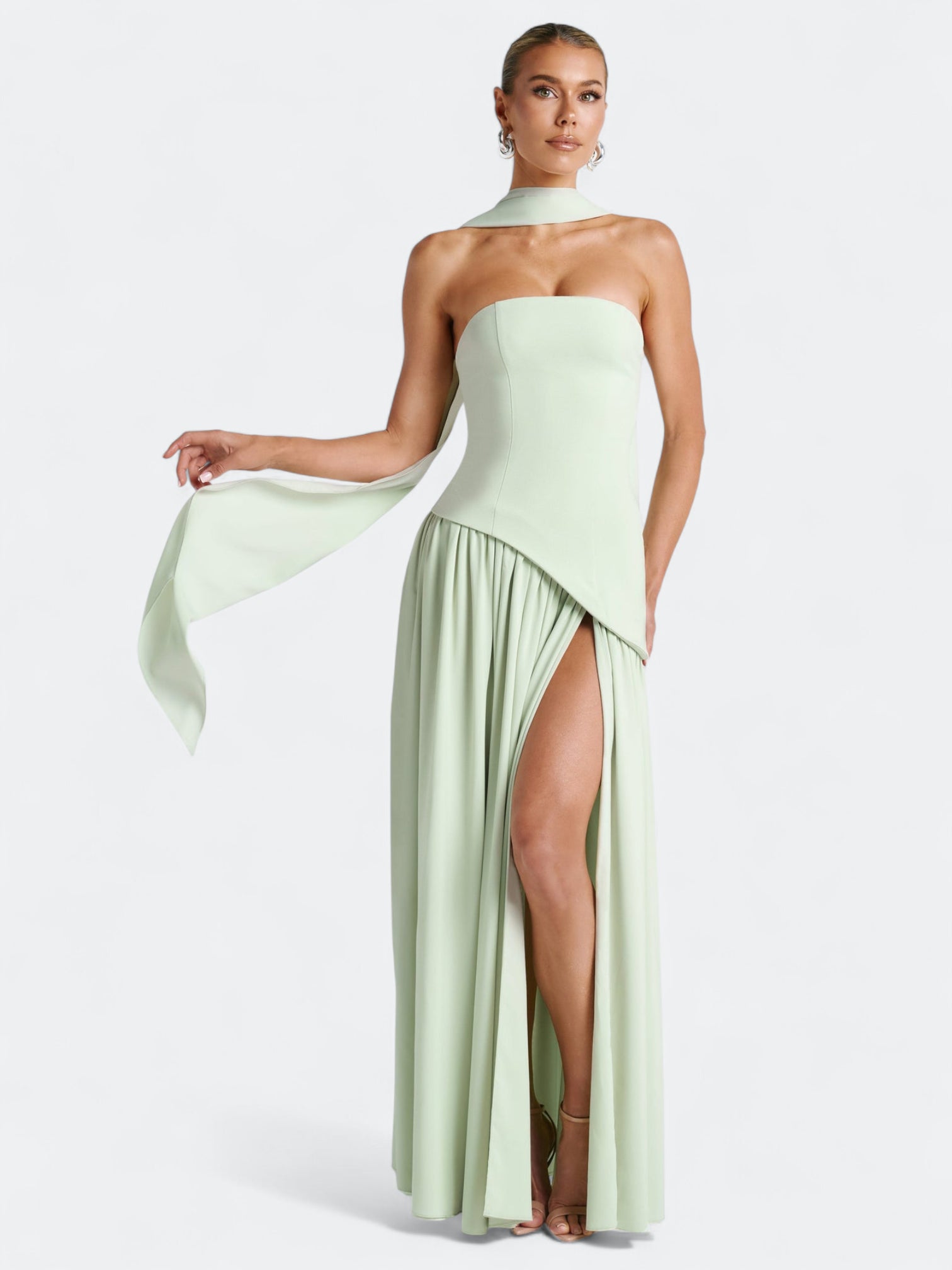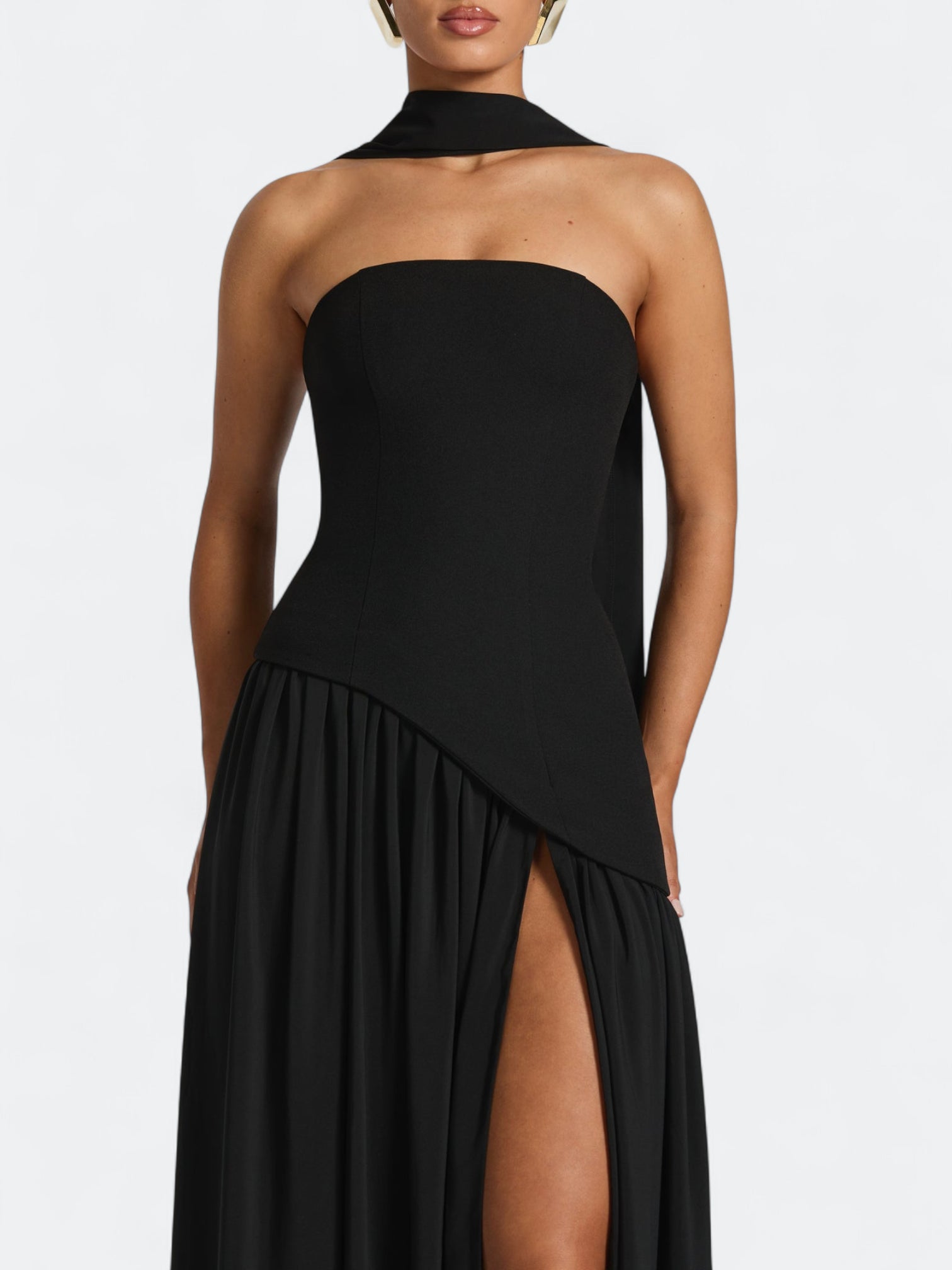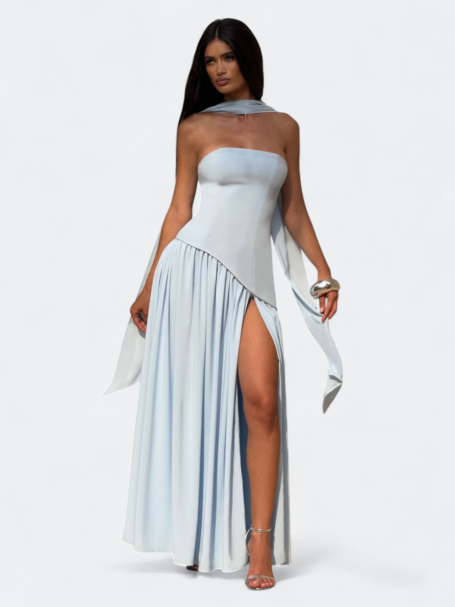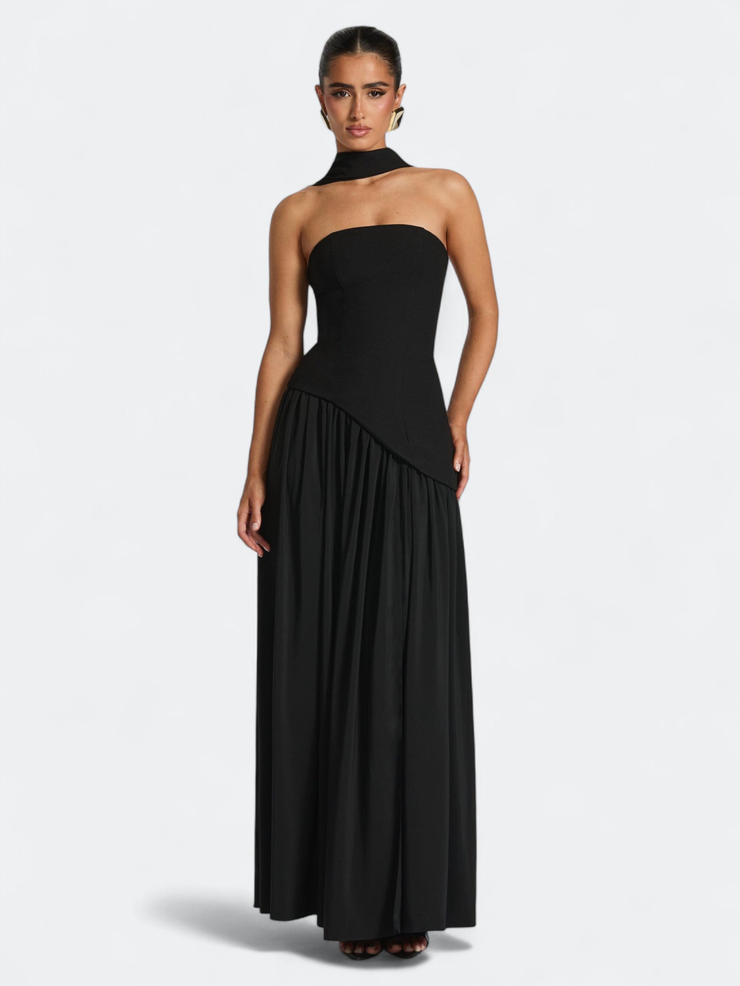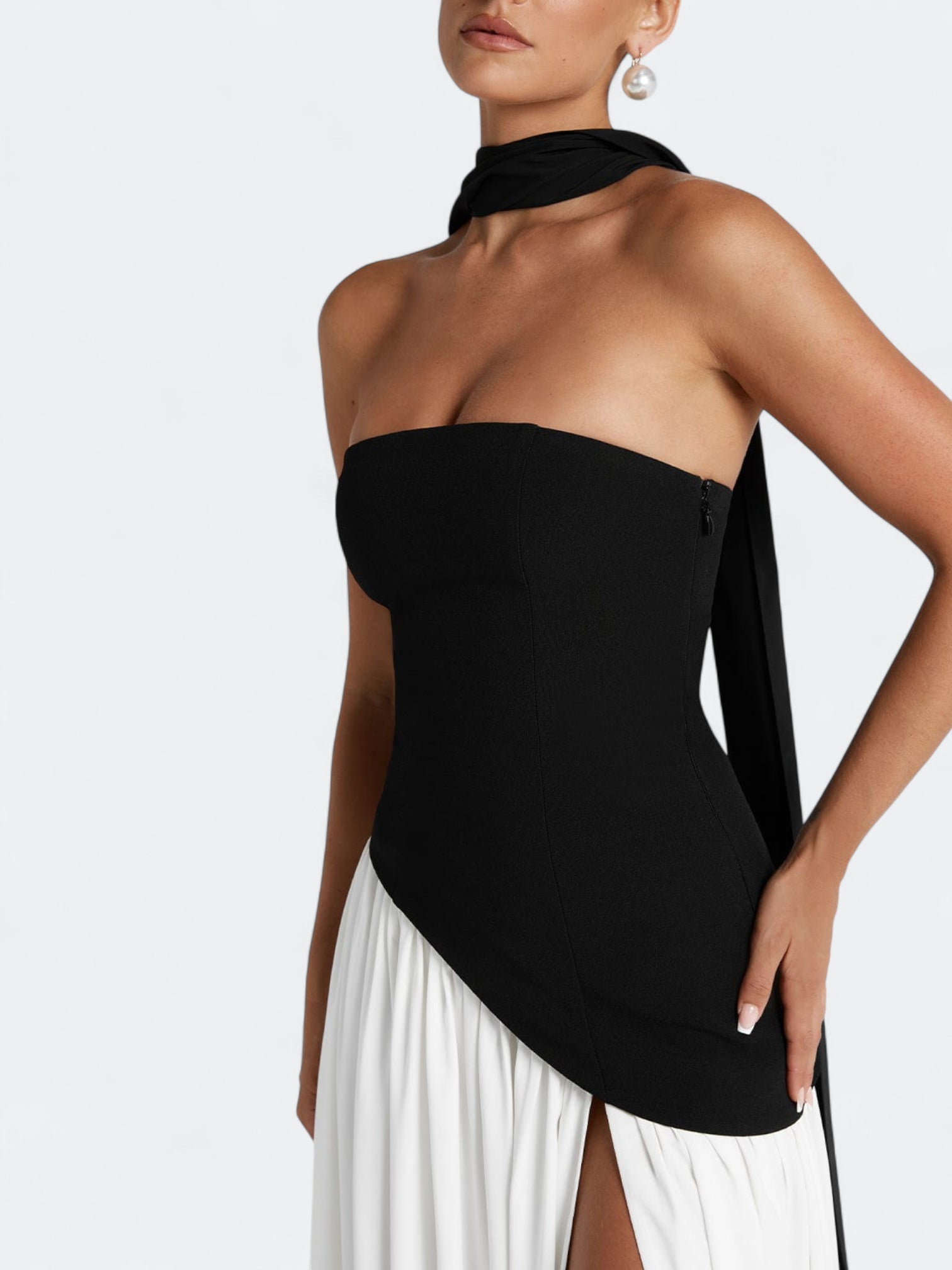 Lunara łączy architekturę formy z kobiecą lekkością. Dopasowany gorset z gładkiej, matowej krepy subtelnie modeluje sylwetkę, a pełna, zwiewna spódnica z szyfonu miękko pracuje w ruchu. Asymetryczny dół i wysokie rozcięcie nadają nowoczesny charakter, a przewieszony przy szyi panel materiału dodaje miękkości. Zapięcie krytym zamkiem oraz wiązanie gorsetowe na plecach domykają czystą, elegancką linię.
