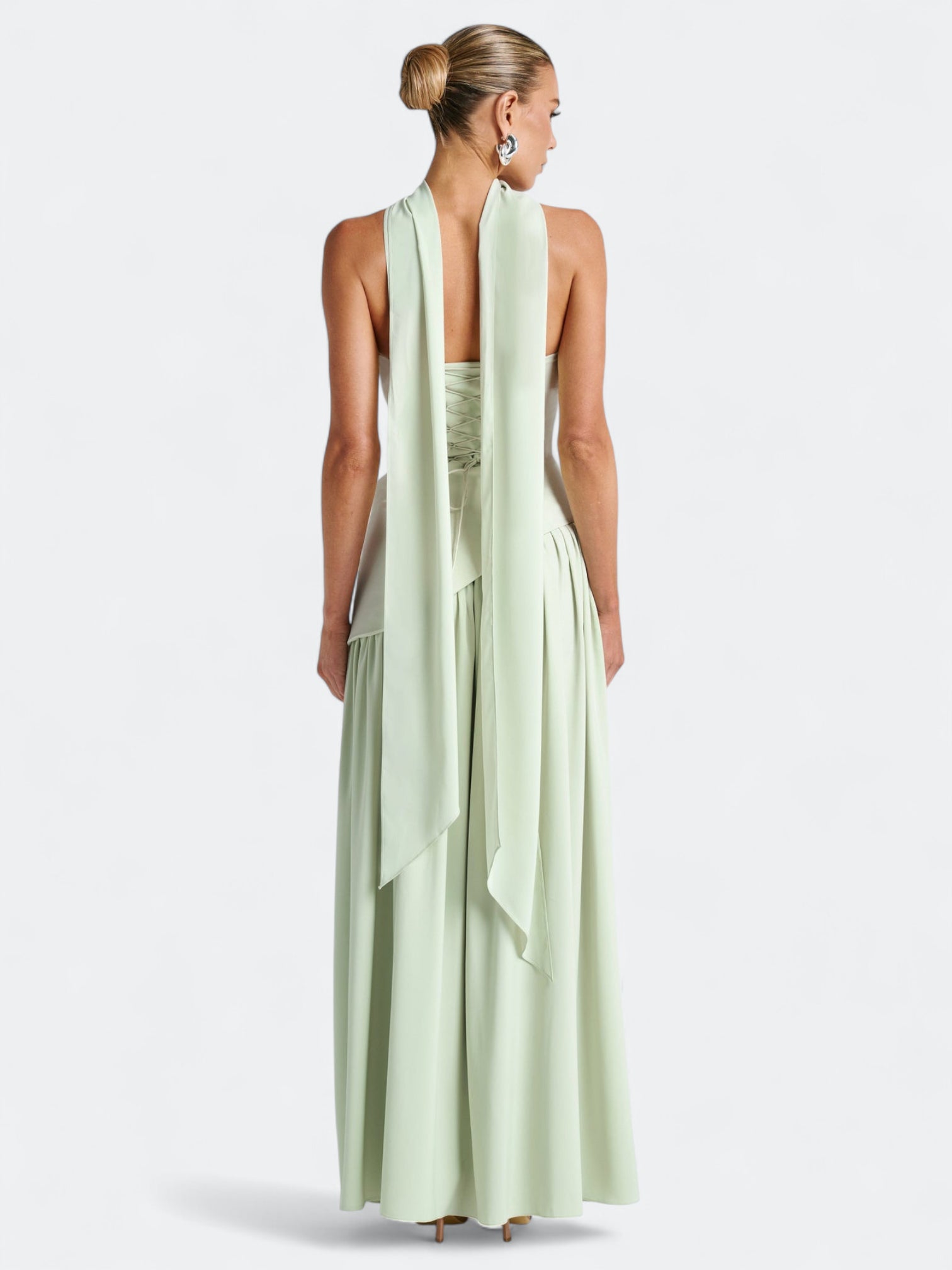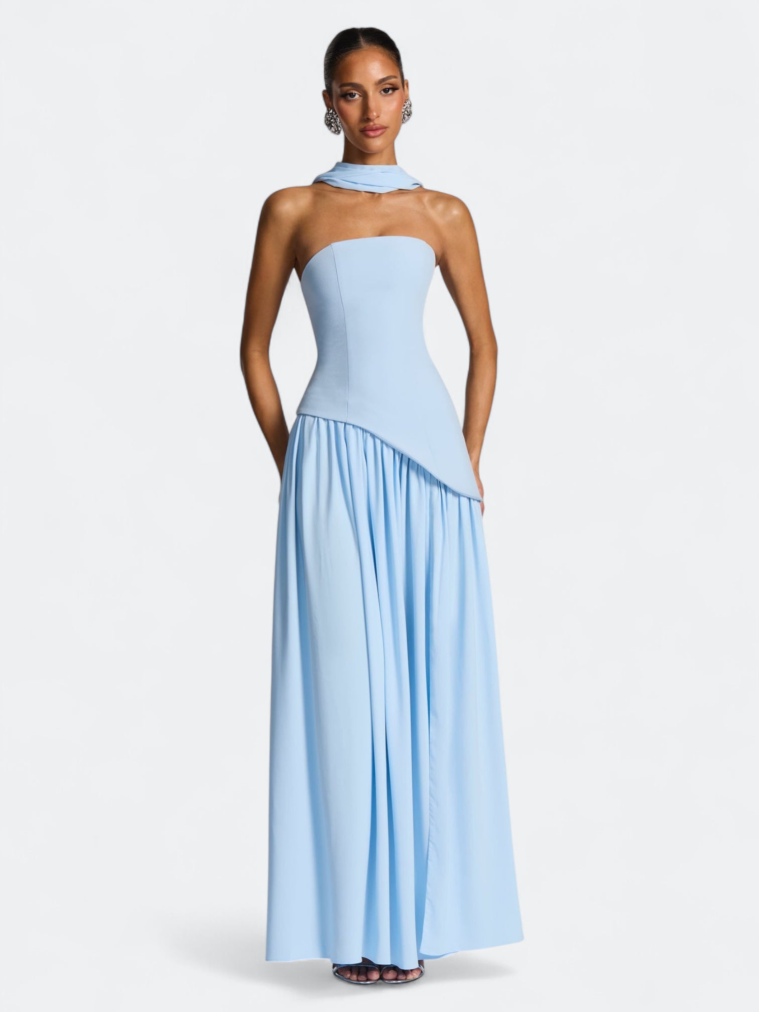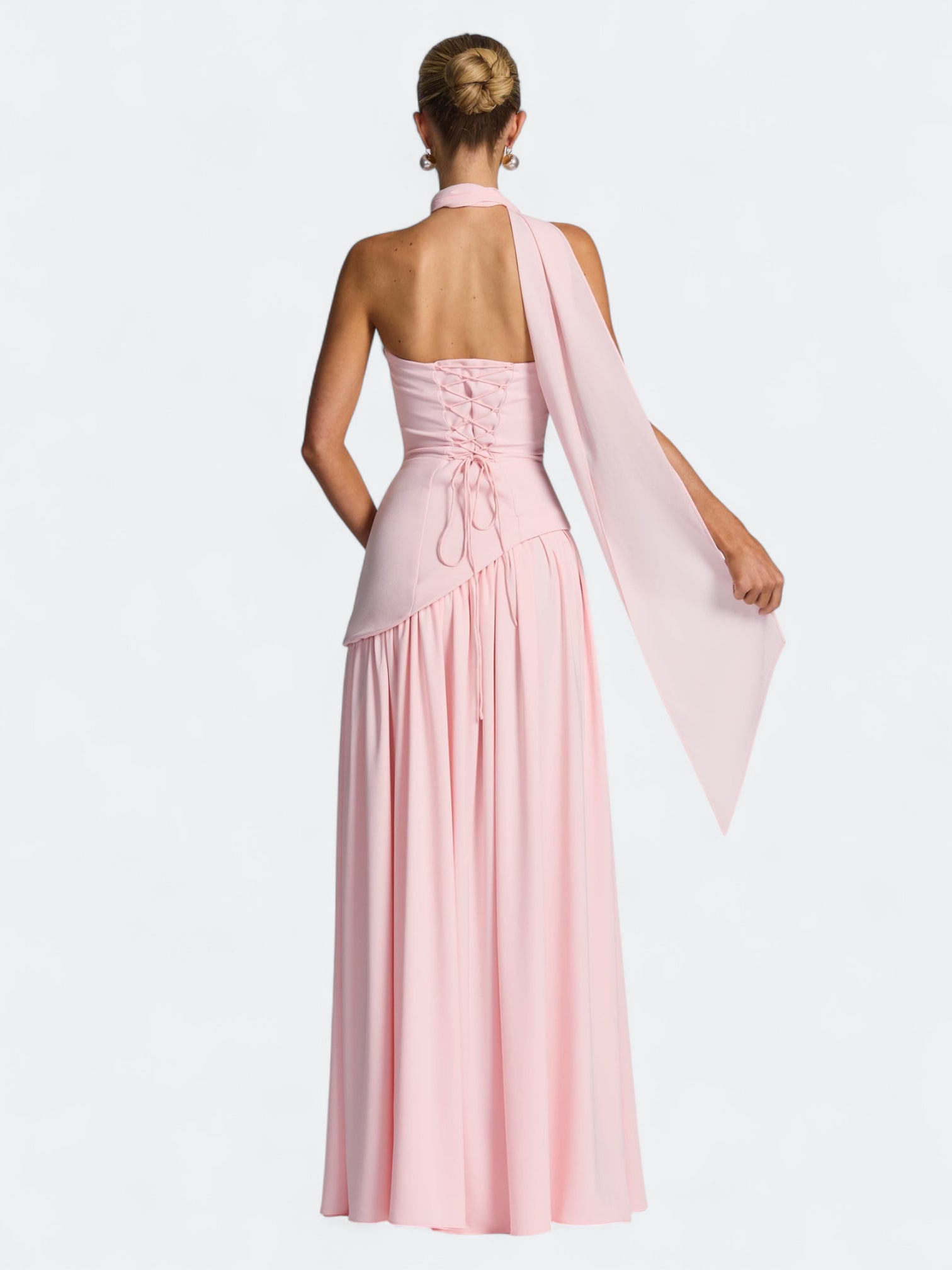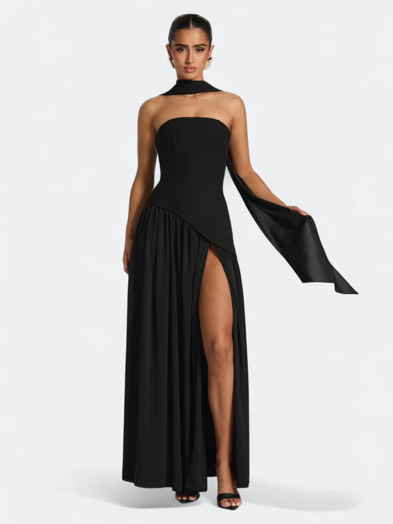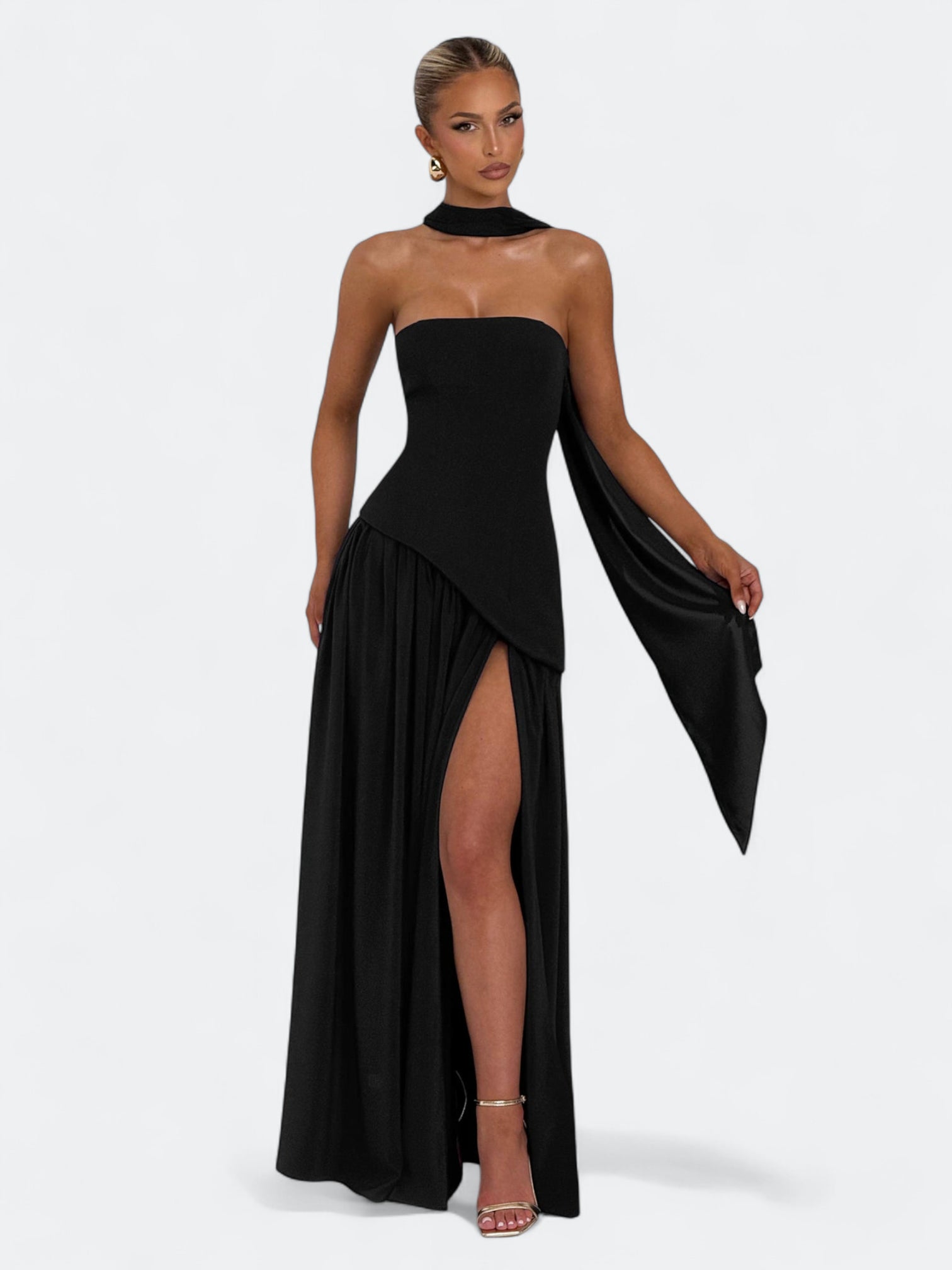 Lunara łączy architekturę formy z kobiecą lekkością. Dopasowany gorset z gładkiej, matowej krepy subtelnie modeluje sylwetkę, a pełna, zwiewna spódnica z szyfonu miękko pracuje w ruchu. Asymetryczny dół i wysokie rozcięcie nadają nowoczesny charakter, a przewieszony przy szyi panel materiału dodaje miękkości. Zapięcie krytym zamkiem oraz wiązanie gorsetowe na plecach domykają czystą, elegancką linię.