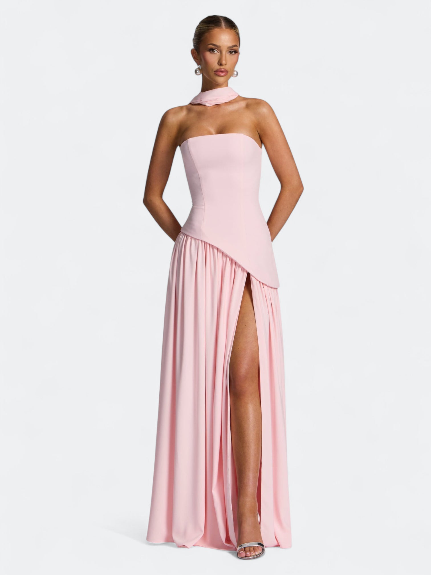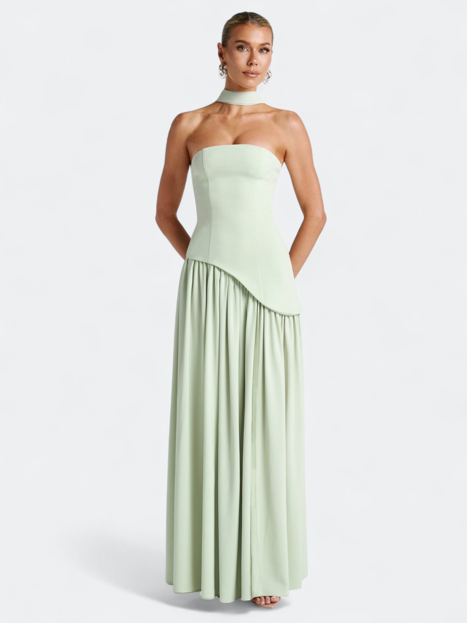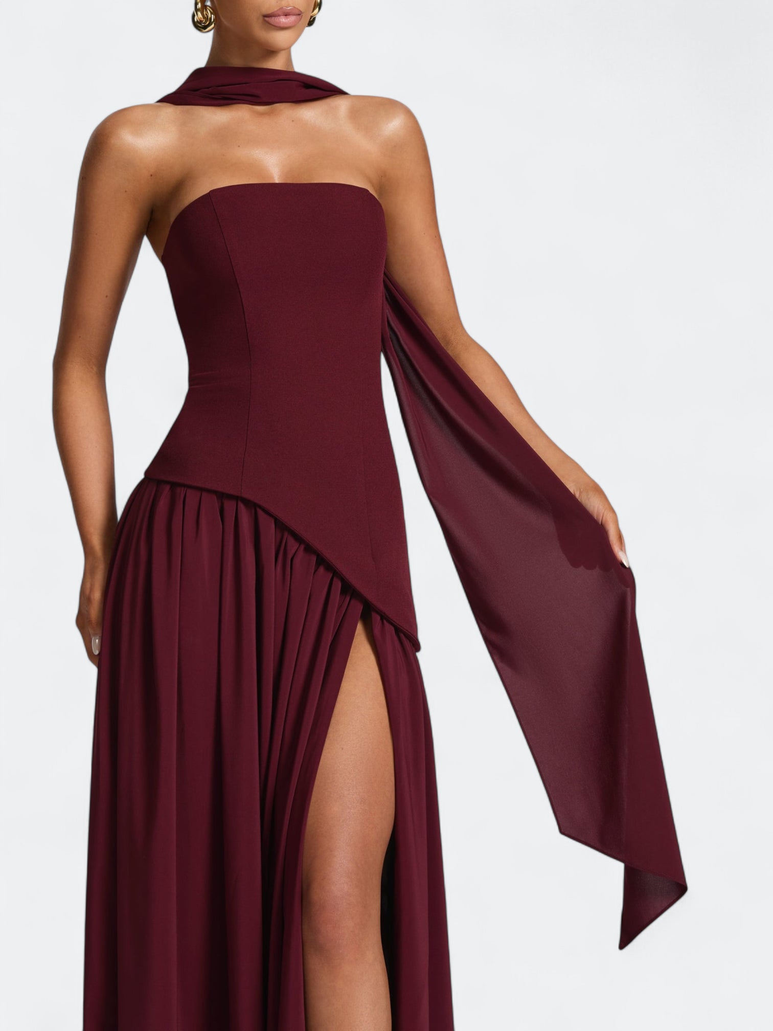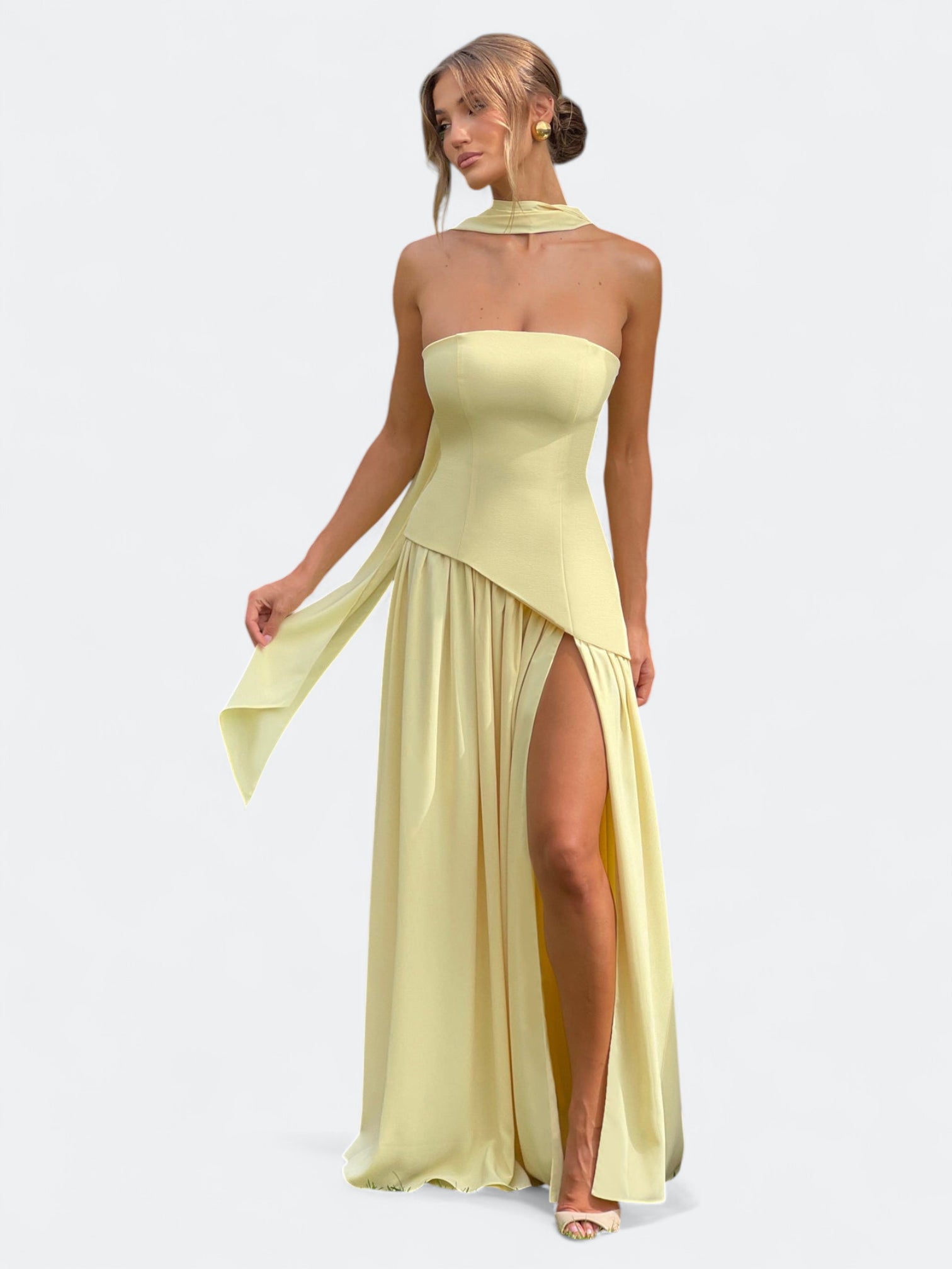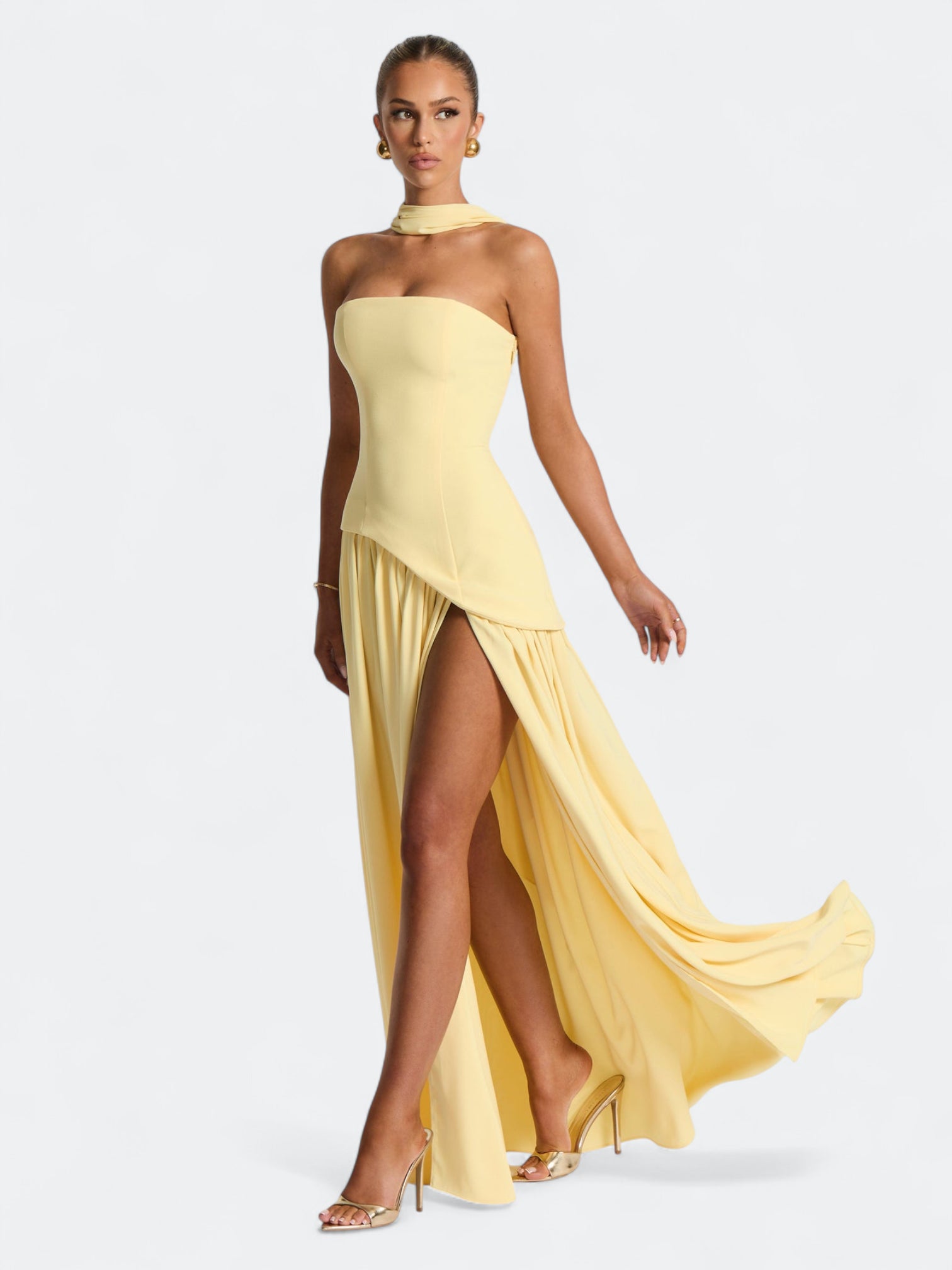 Lunara łączy architekturę formy z kobiecą lekkością. Dopasowany gorset z gładkiej, matowej krepy subtelnie modeluje sylwetkę, a pełna, zwiewna spódnica z szyfonu miękko pracuje w ruchu. Asymetryczny dół i wysokie rozcięcie nadają nowoczesny charakter, a przewieszony przy szyi panel materiału dodaje miękkości. Zapięcie krytym zamkiem oraz wiązanie gorsetowe na plecach domykają czystą, elegancką linię.
