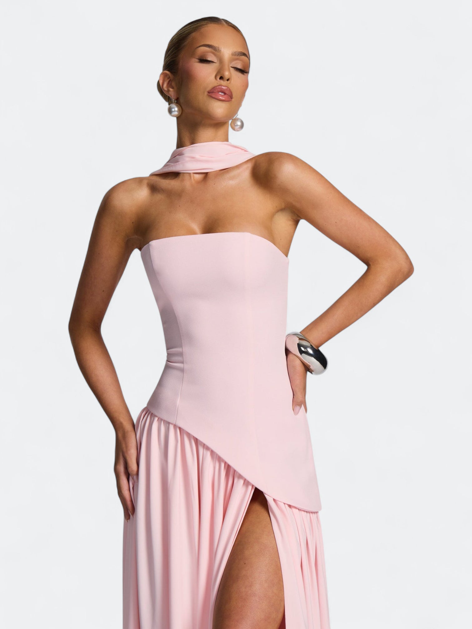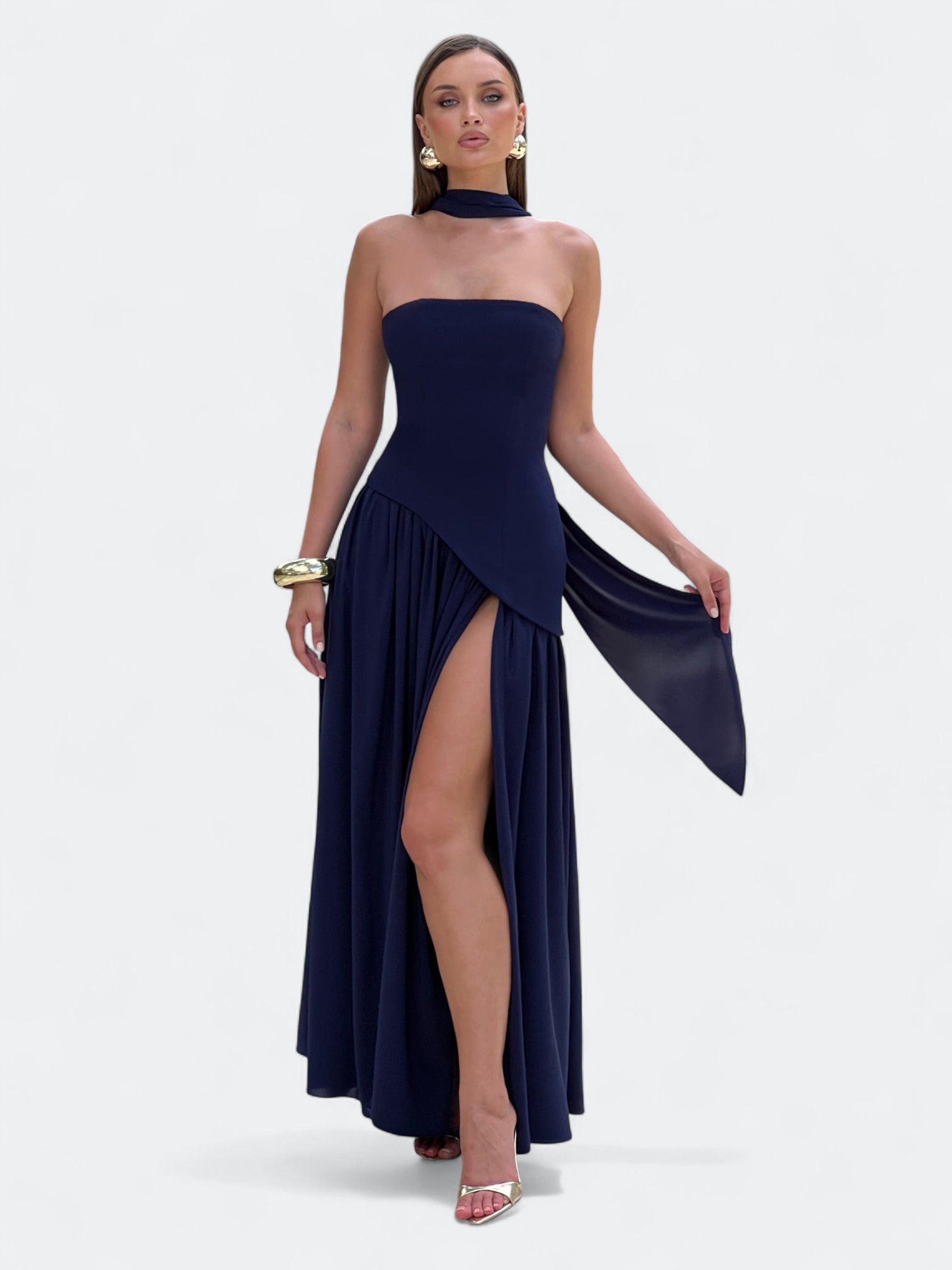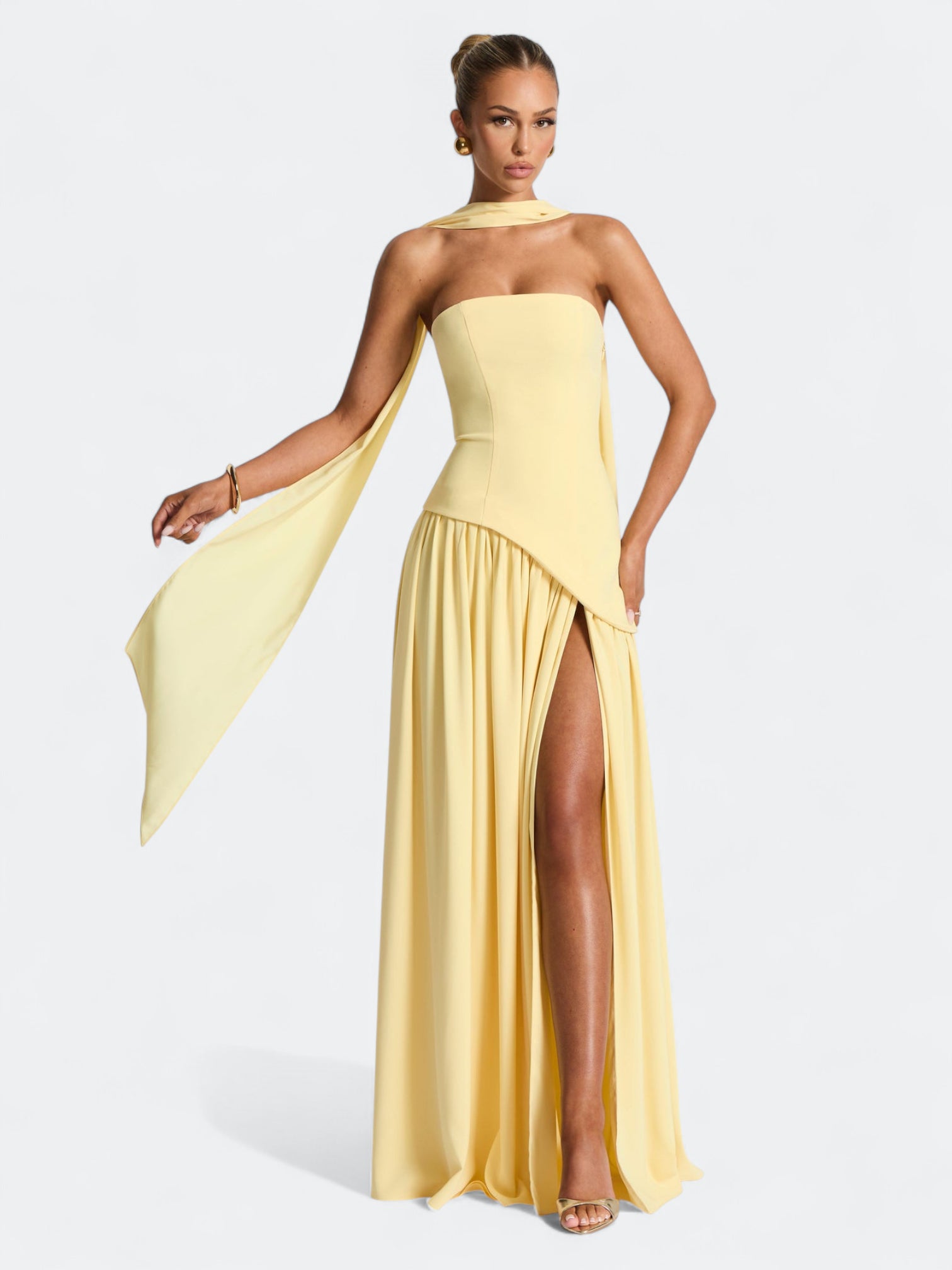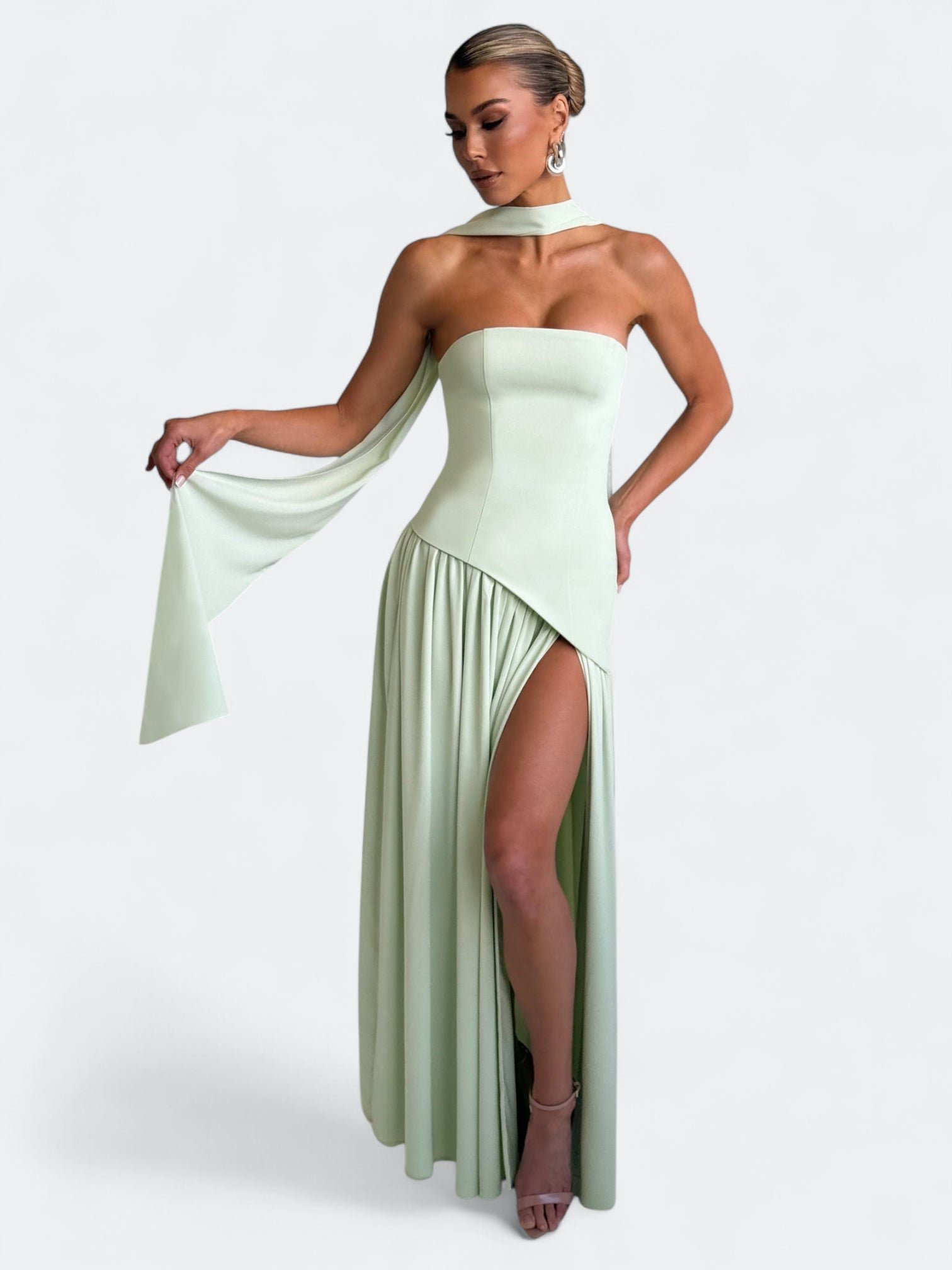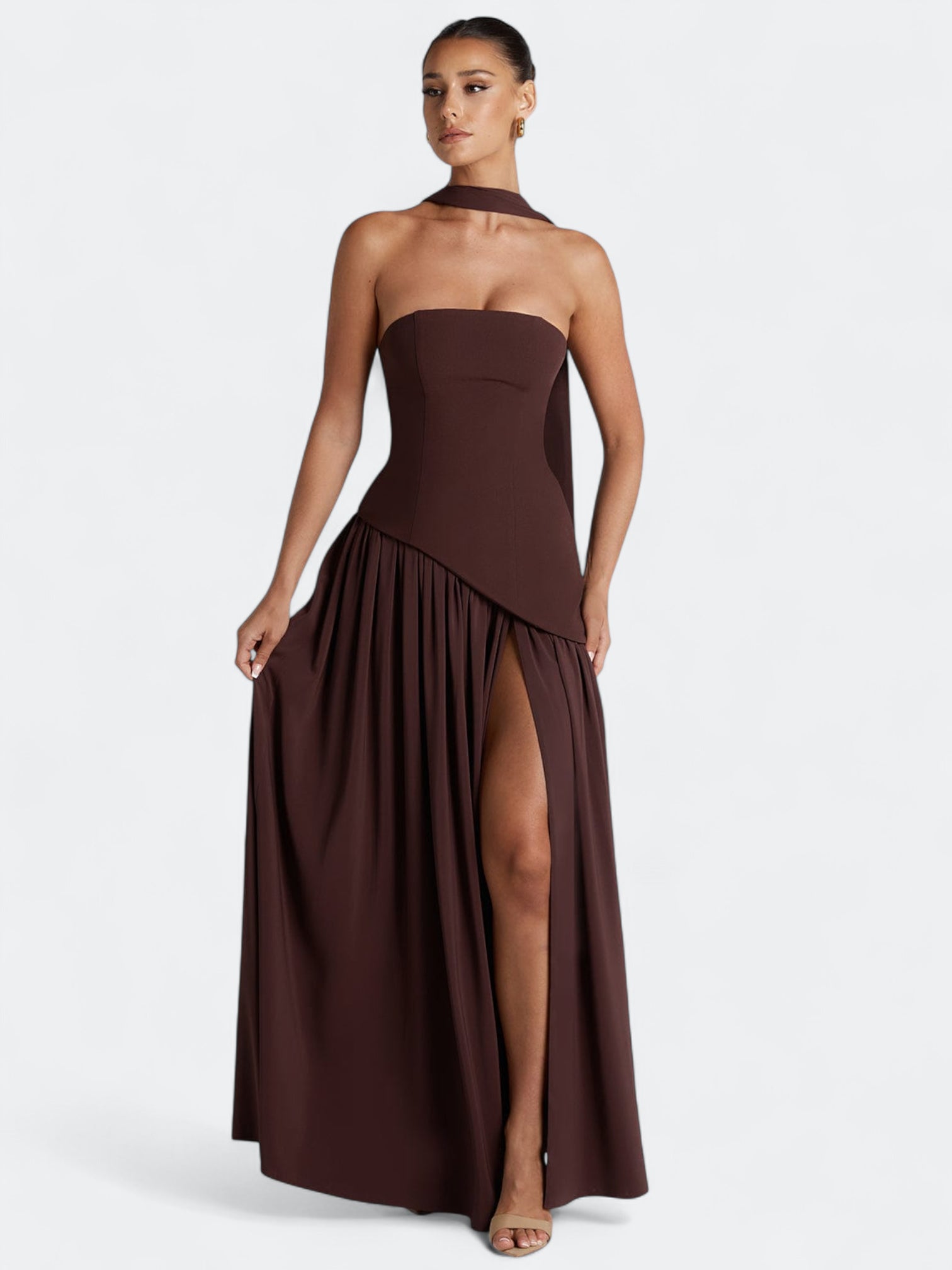 Lunara łączy architekturę formy z kobiecą lekkością. Dopasowany gorset z gładkiej, matowej krepy subtelnie modeluje sylwetkę, a pełna, zwiewna spódnica z szyfonu miękko pracuje w ruchu. Asymetryczny dół i wysokie rozcięcie nadają nowoczesny charakter, a przewieszony przy szyi panel materiału dodaje miękkości. Zapięcie krytym zamkiem oraz wiązanie gorsetowe na plecach domykają czystą, elegancką linię.