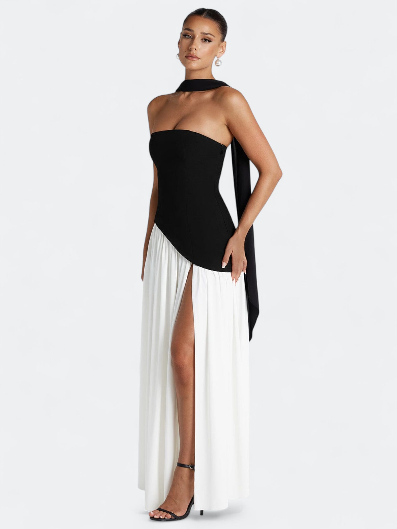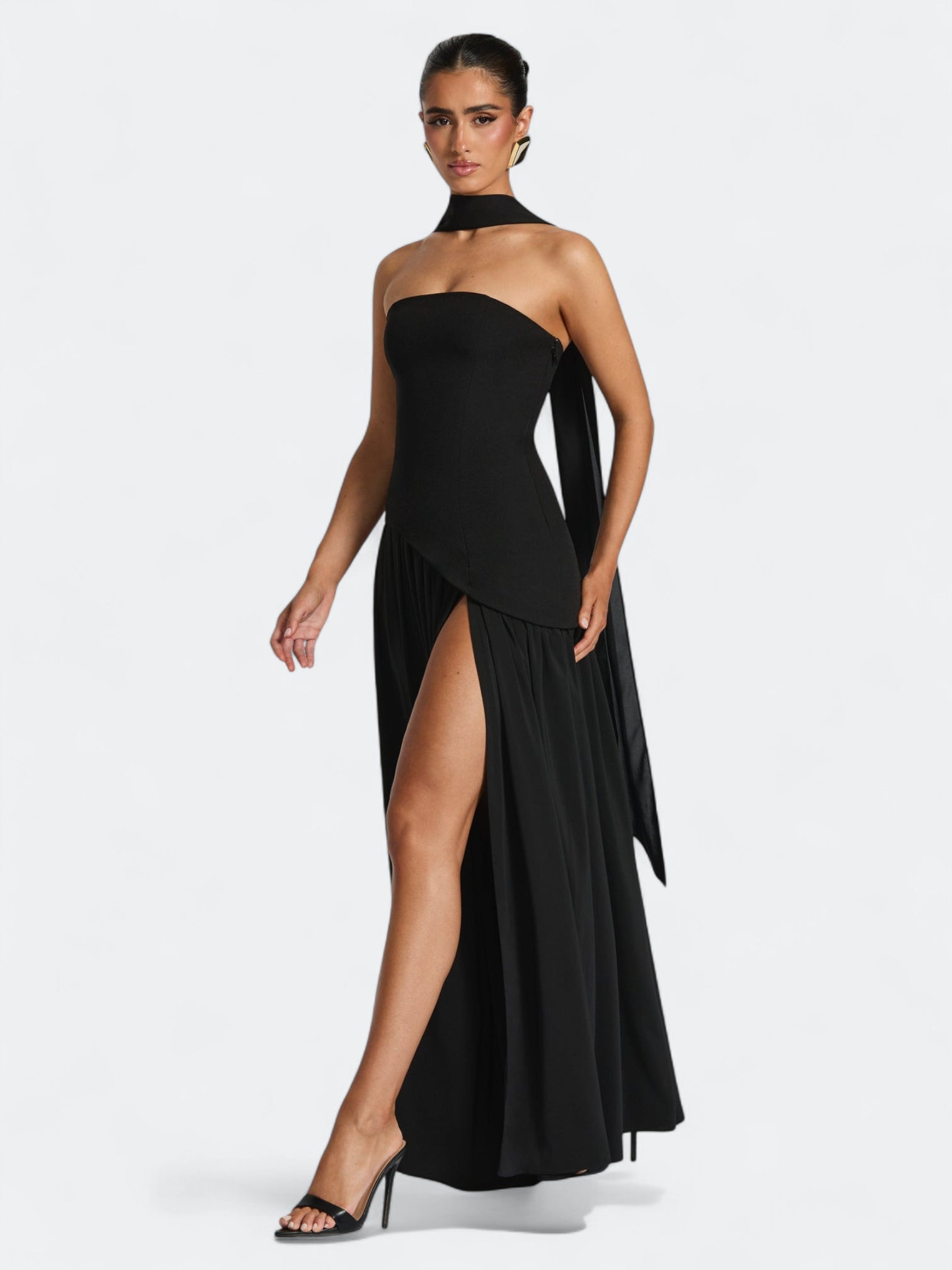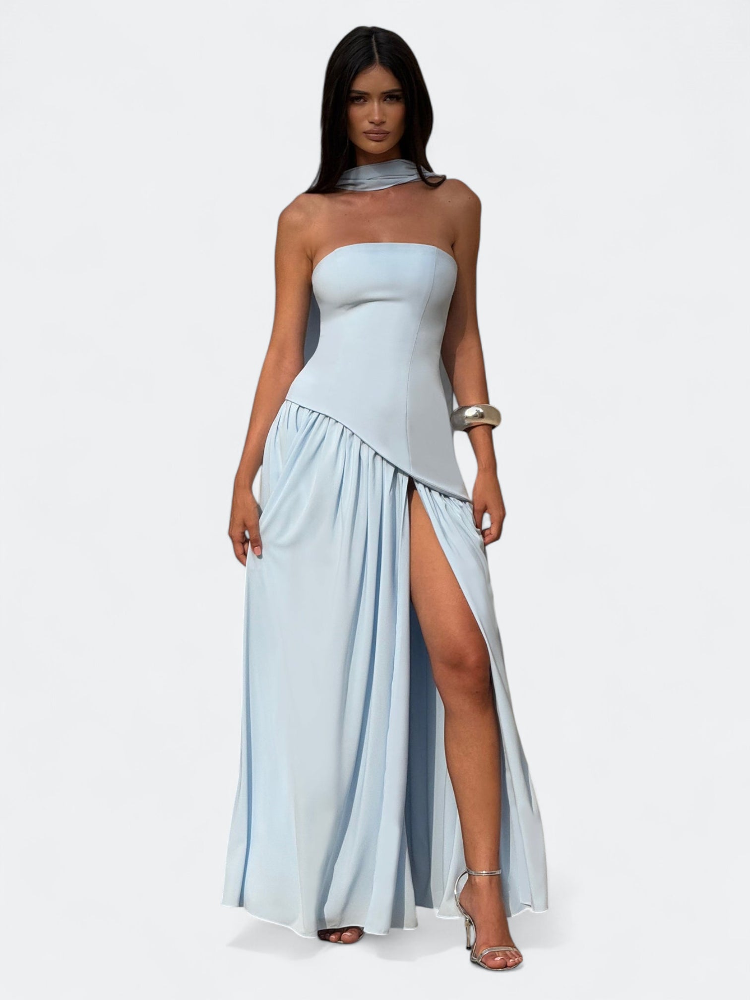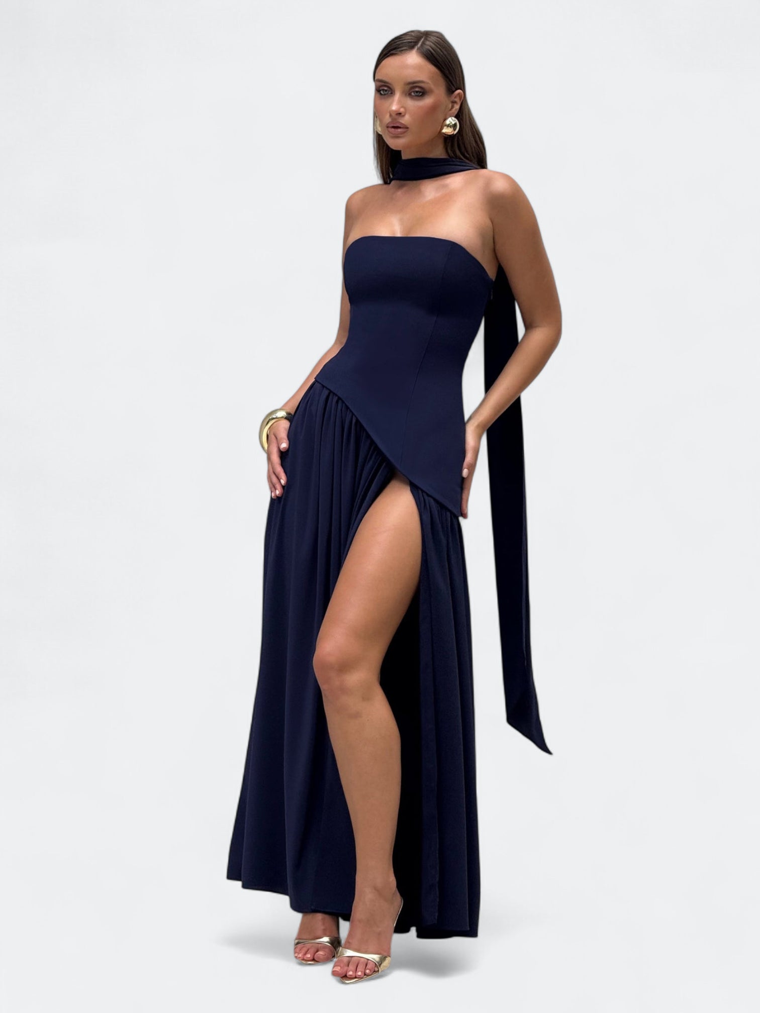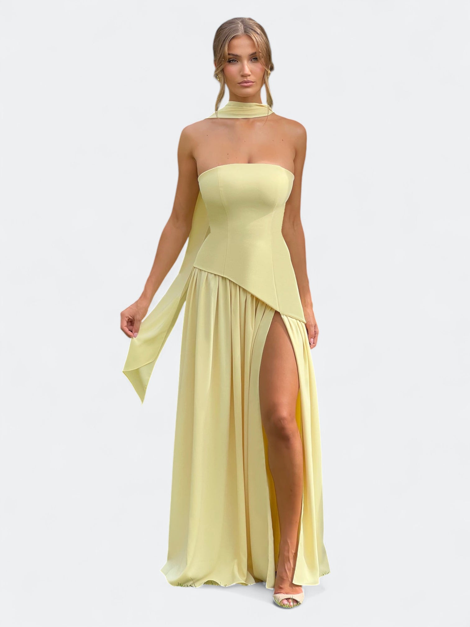 Lunara łączy architekturę formy z kobiecą lekkością. Dopasowany gorset z gładkiej, matowej krepy subtelnie modeluje sylwetkę, a pełna, zwiewna spódnica z szyfonu miękko pracuje w ruchu. Asymetryczny dół i wysokie rozcięcie nadają nowoczesny charakter, a przewieszony przy szyi panel materiału dodaje miękkości. Zapięcie krytym zamkiem oraz wiązanie gorsetowe na plecach domykają czystą, elegancką linię.