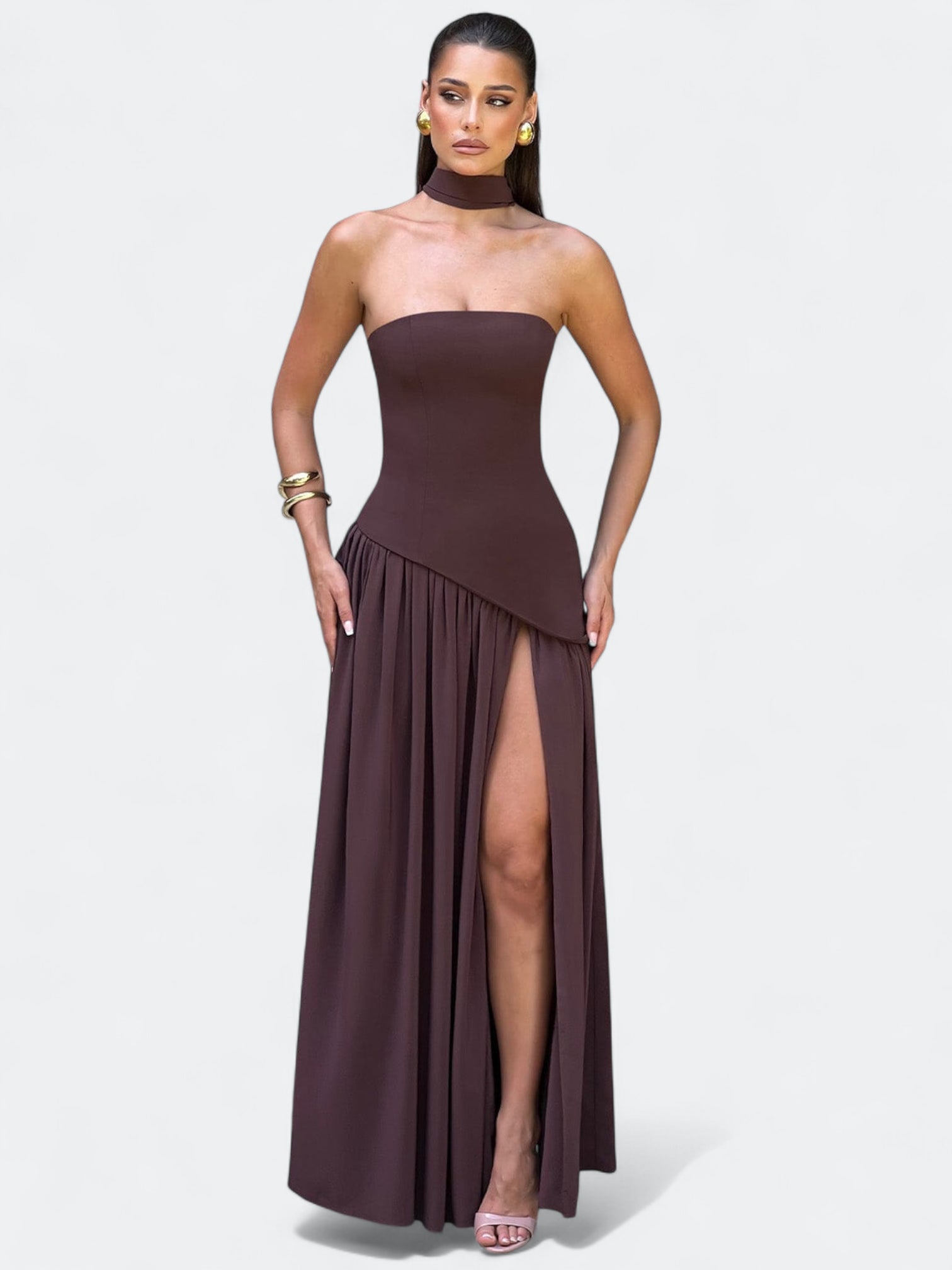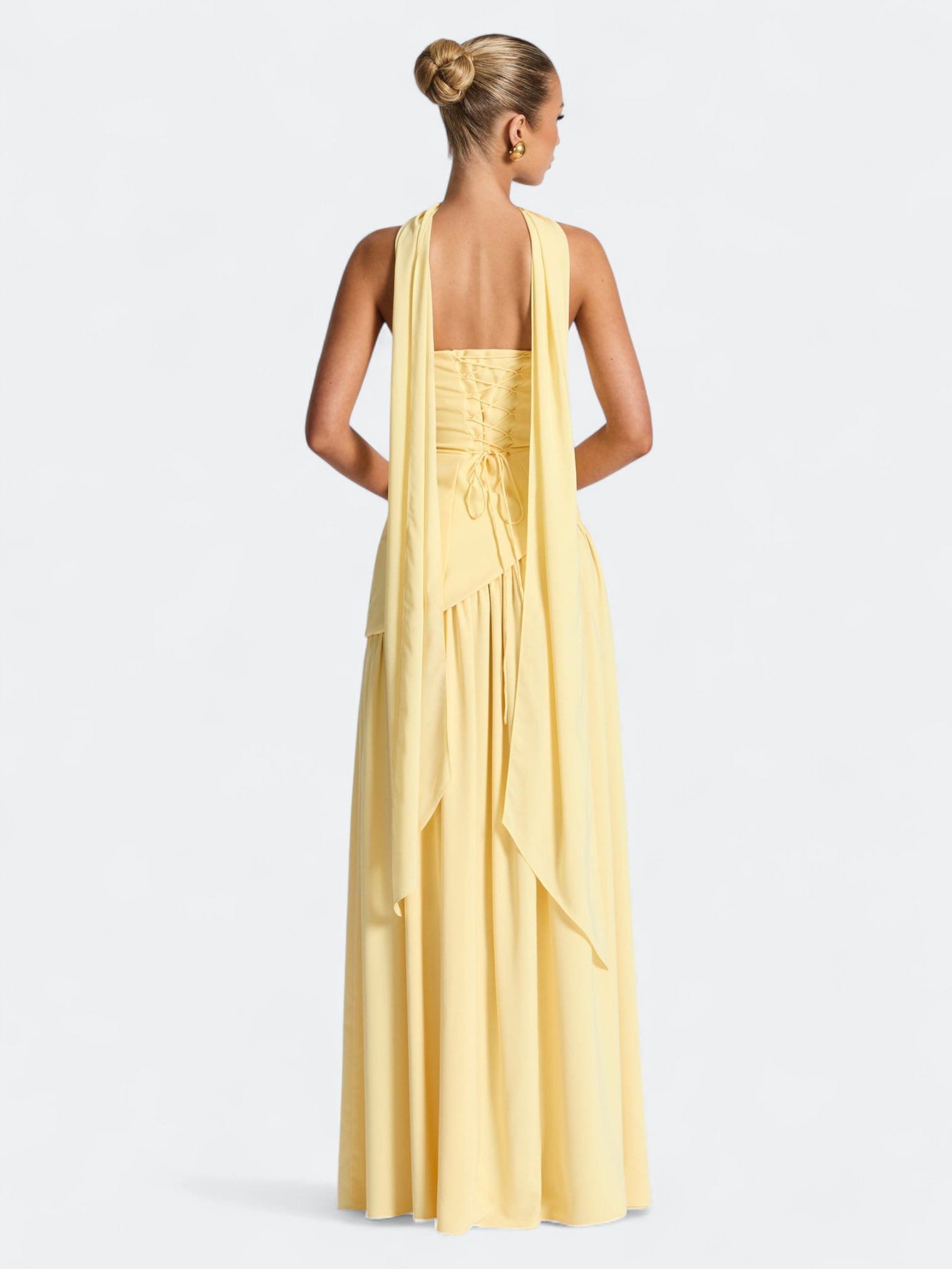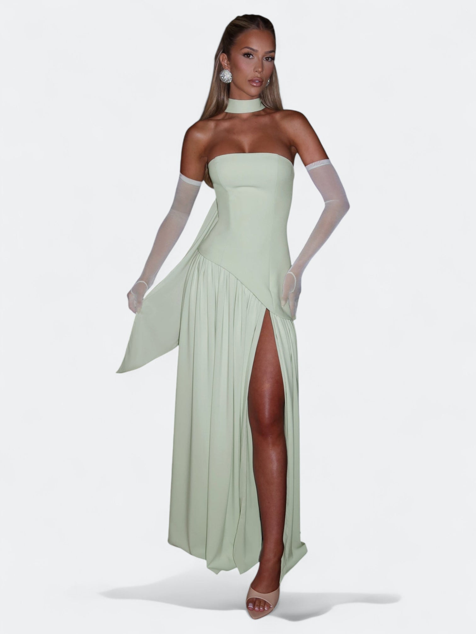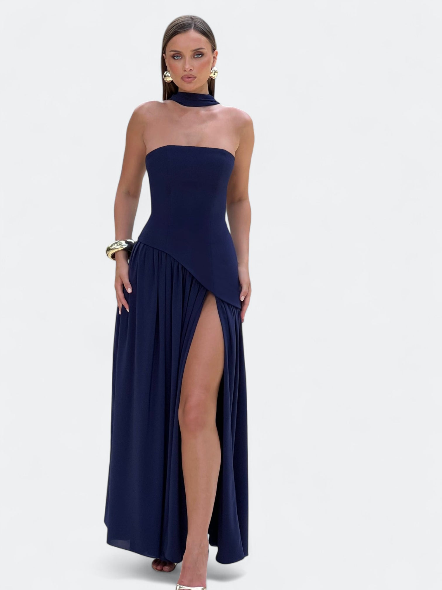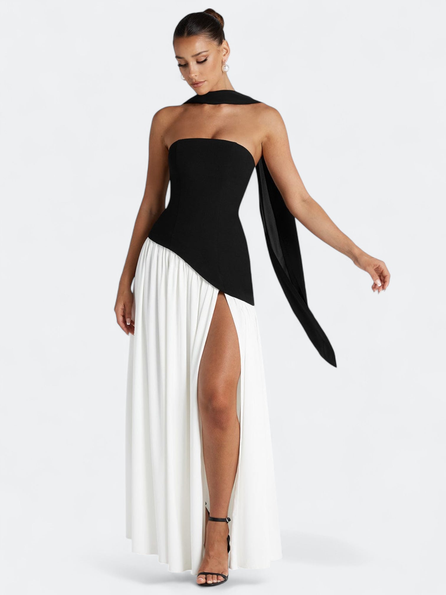 Lunara łączy architekturę formy z kobiecą lekkością. Dopasowany gorset z gładkiej, matowej krepy subtelnie modeluje sylwetkę, a pełna, zwiewna spódnica z szyfonu miękko pracuje w ruchu. Asymetryczny dół i wysokie rozcięcie nadają nowoczesny charakter, a przewieszony przy szyi panel materiału dodaje miękkości. Zapięcie krytym zamkiem oraz wiązanie gorsetowe na plecach domykają czystą, elegancką linię.