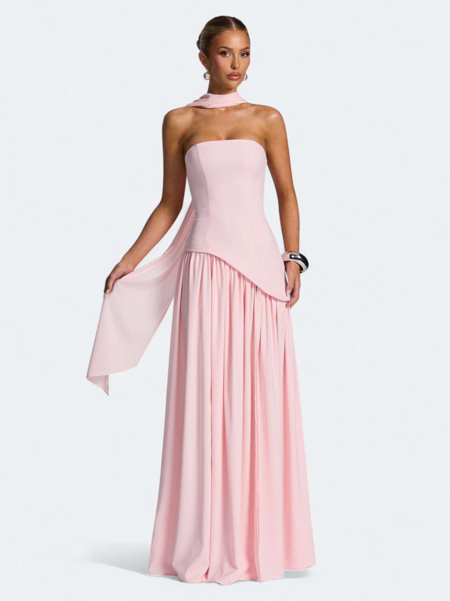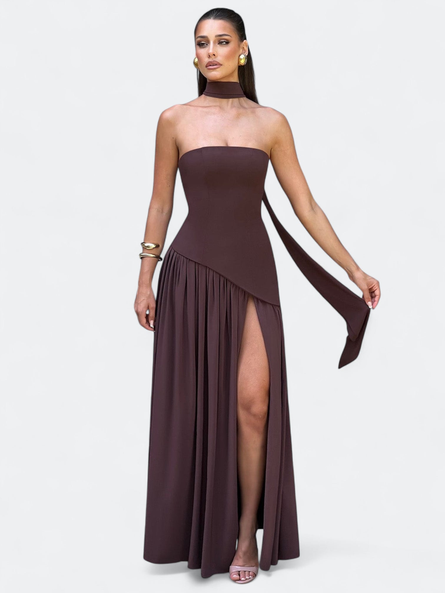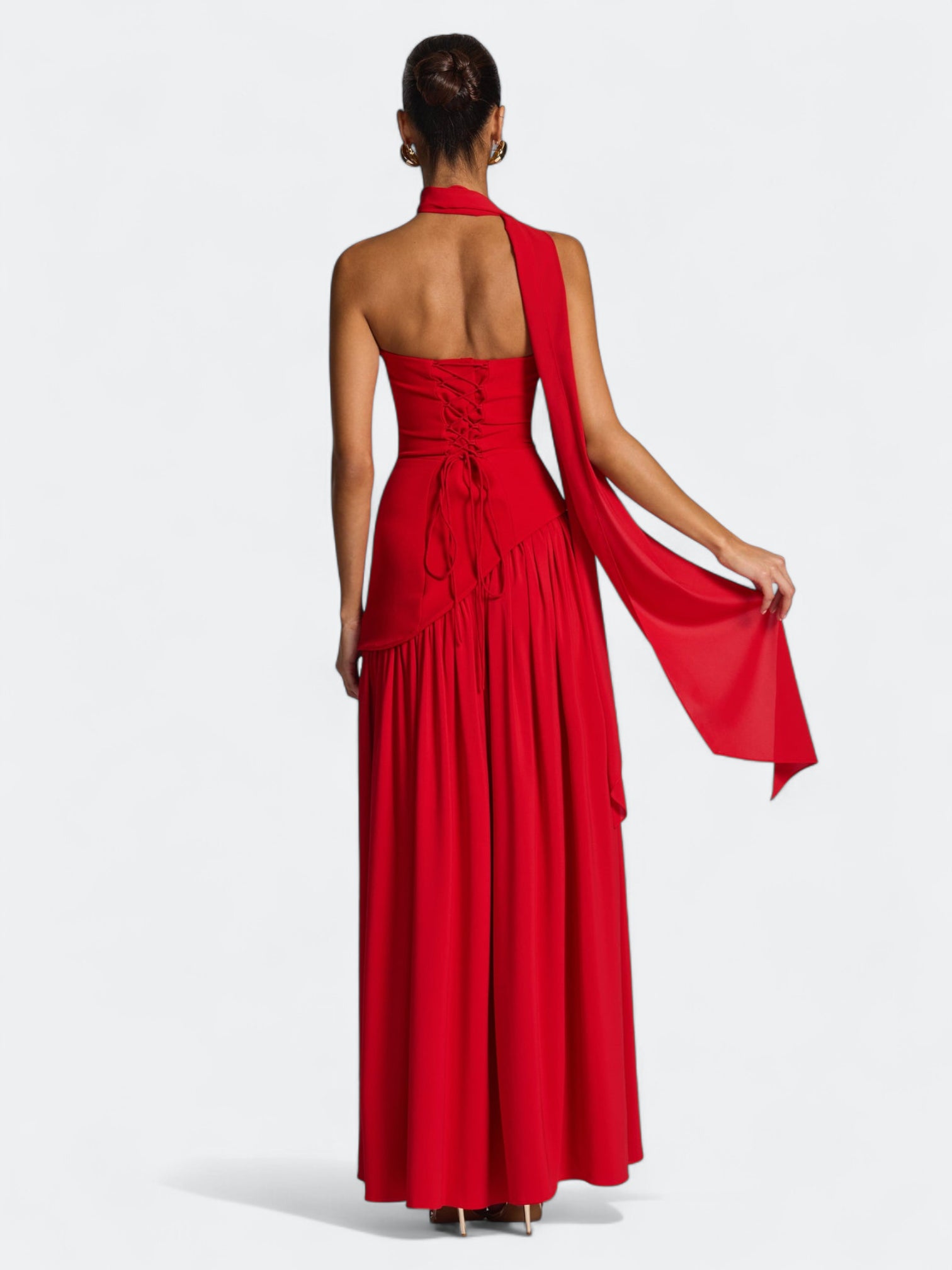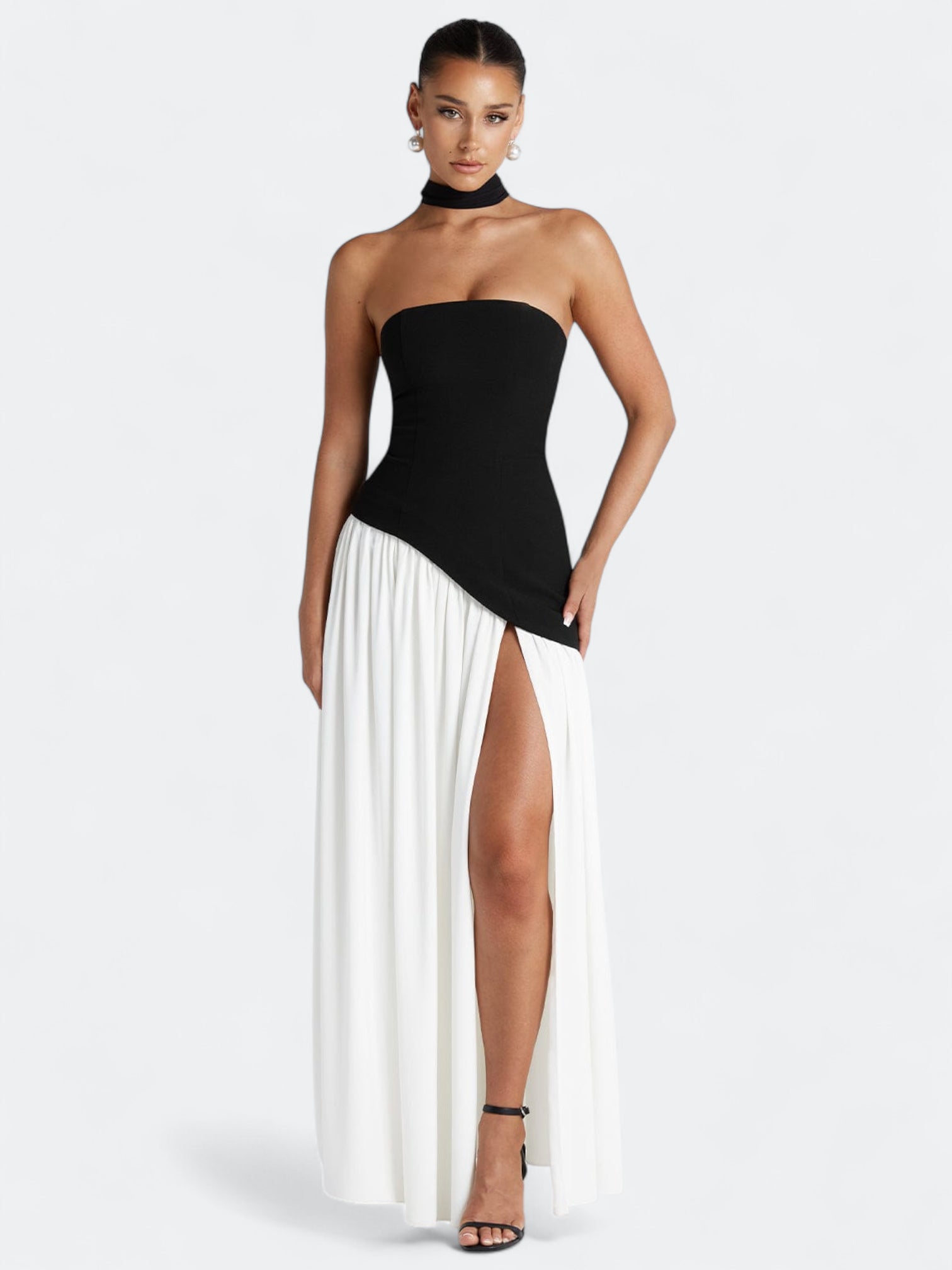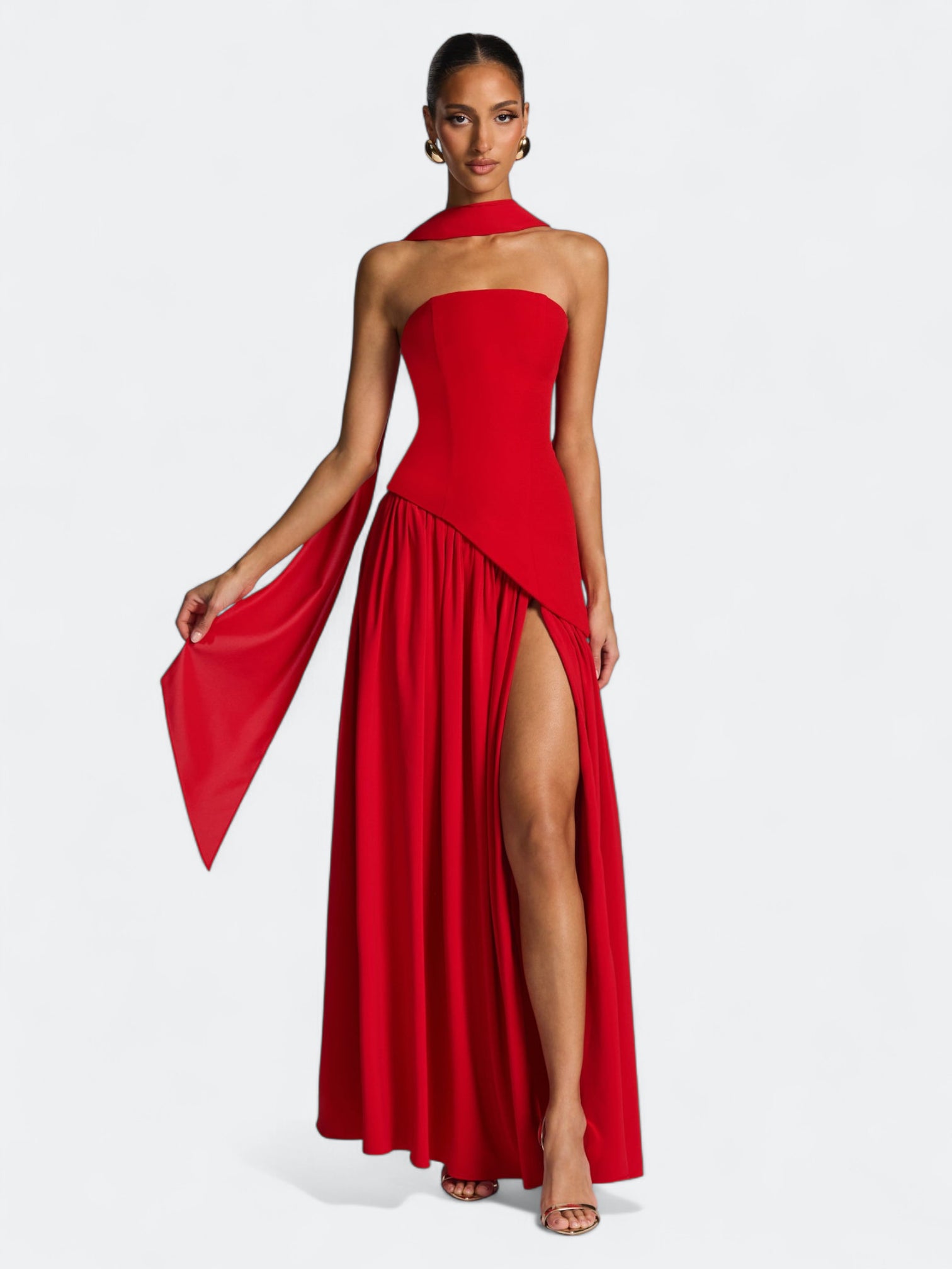 Lunara łączy architekturę formy z kobiecą lekkością. Dopasowany gorset z gładkiej, matowej krepy subtelnie modeluje sylwetkę, a pełna, zwiewna spódnica z szyfonu miękko pracuje w ruchu. Asymetryczny dół i wysokie rozcięcie nadają nowoczesny charakter, a przewieszony przy szyi panel materiału dodaje miękkości. Zapięcie krytym zamkiem oraz wiązanie gorsetowe na plecach domykają czystą, elegancką linię.