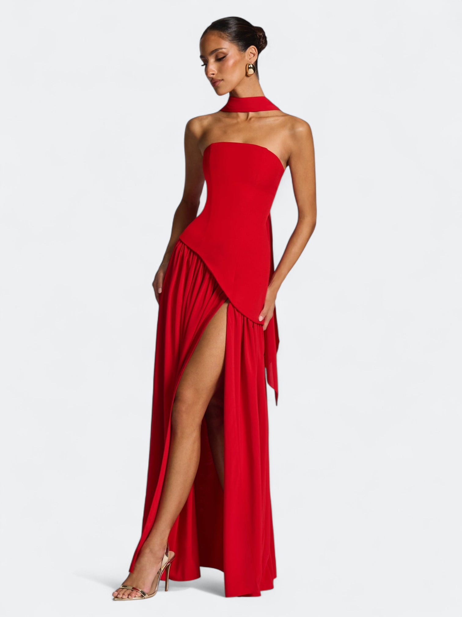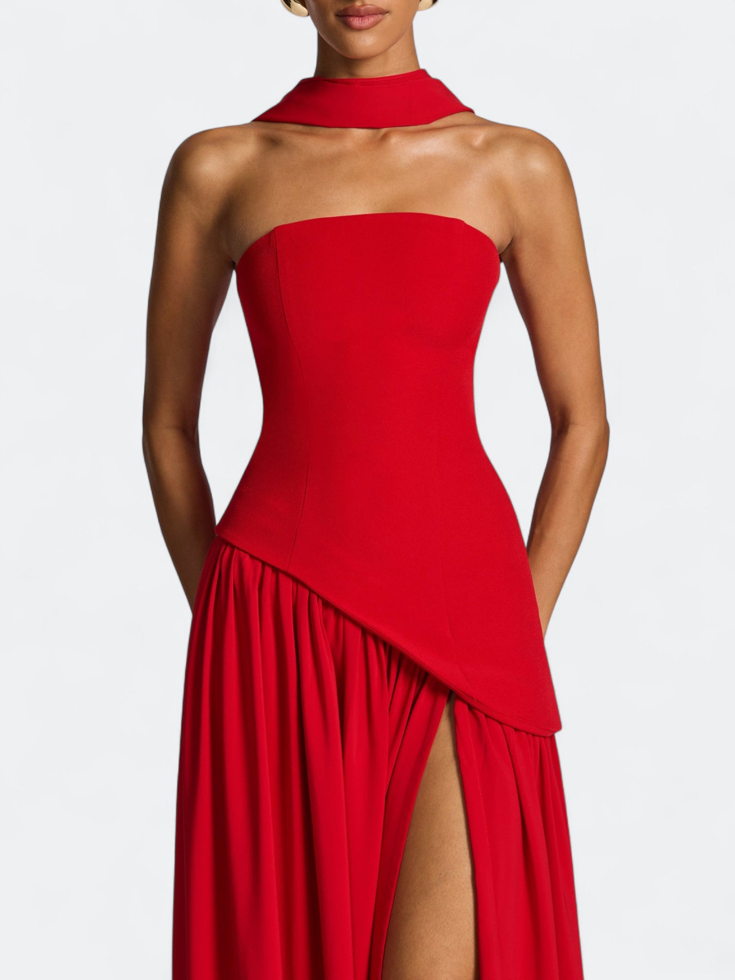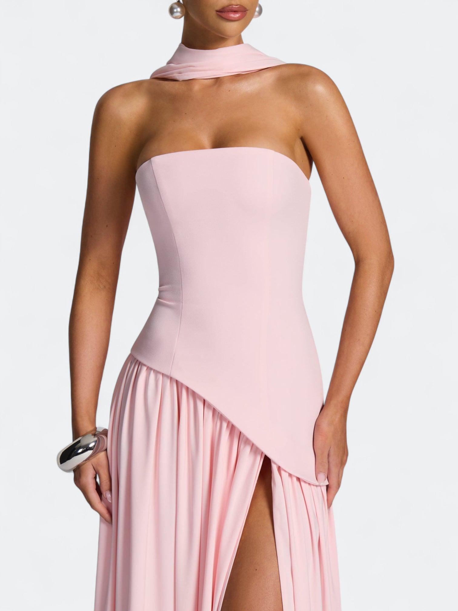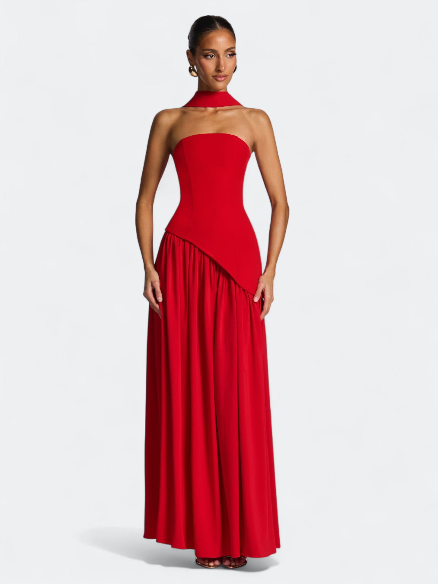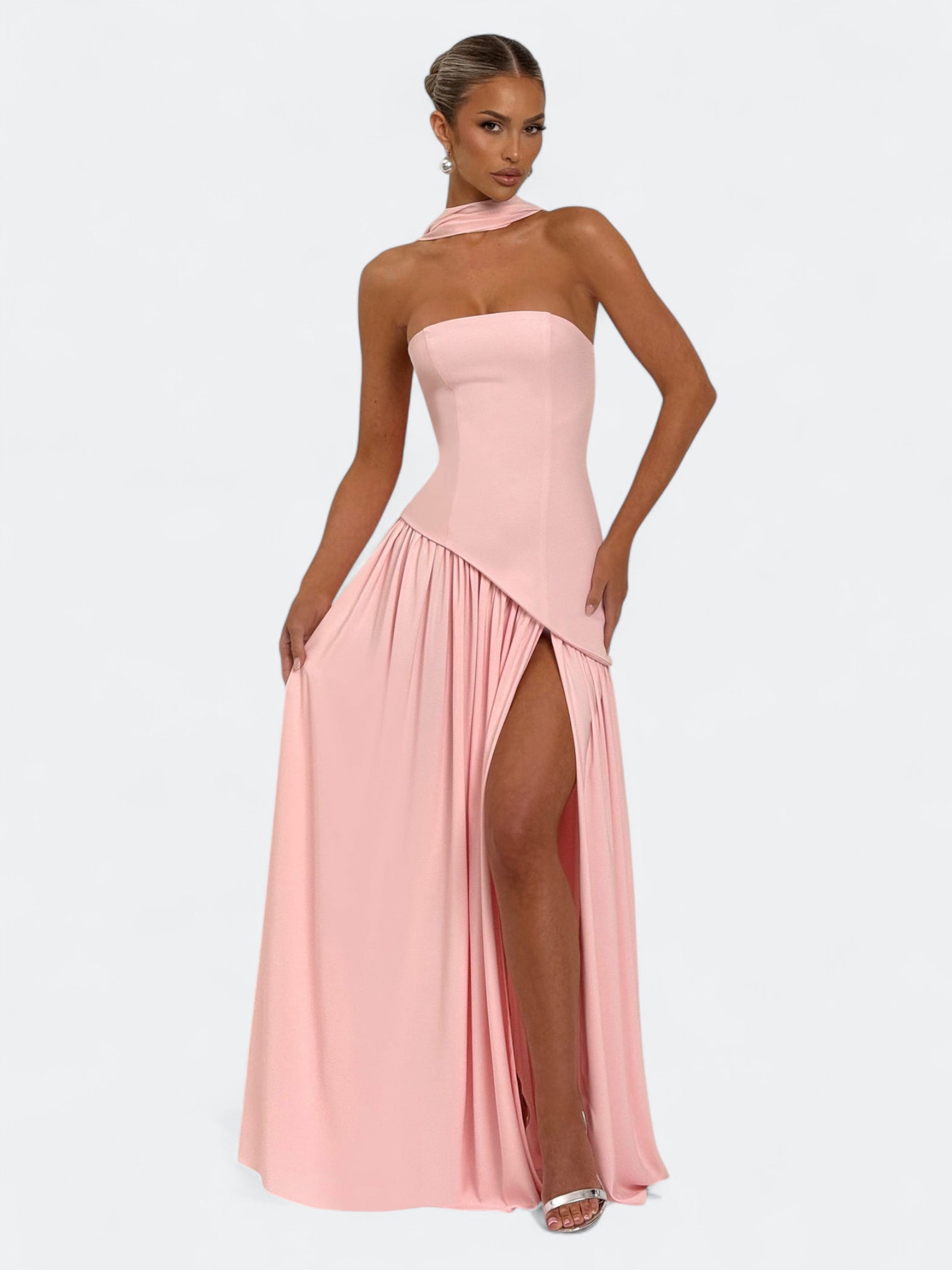 Lunara łączy architekturę formy z kobiecą lekkością. Dopasowany gorset z gładkiej, matowej krepy subtelnie modeluje sylwetkę, a pełna, zwiewna spódnica z szyfonu miękko pracuje w ruchu. Asymetryczny dół i wysokie rozcięcie nadają nowoczesny charakter, a przewieszony przy szyi panel materiału dodaje miękkości. Zapięcie krytym zamkiem oraz wiązanie gorsetowe na plecach domykają czystą, elegancką linię.