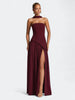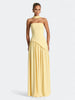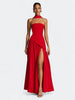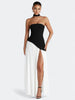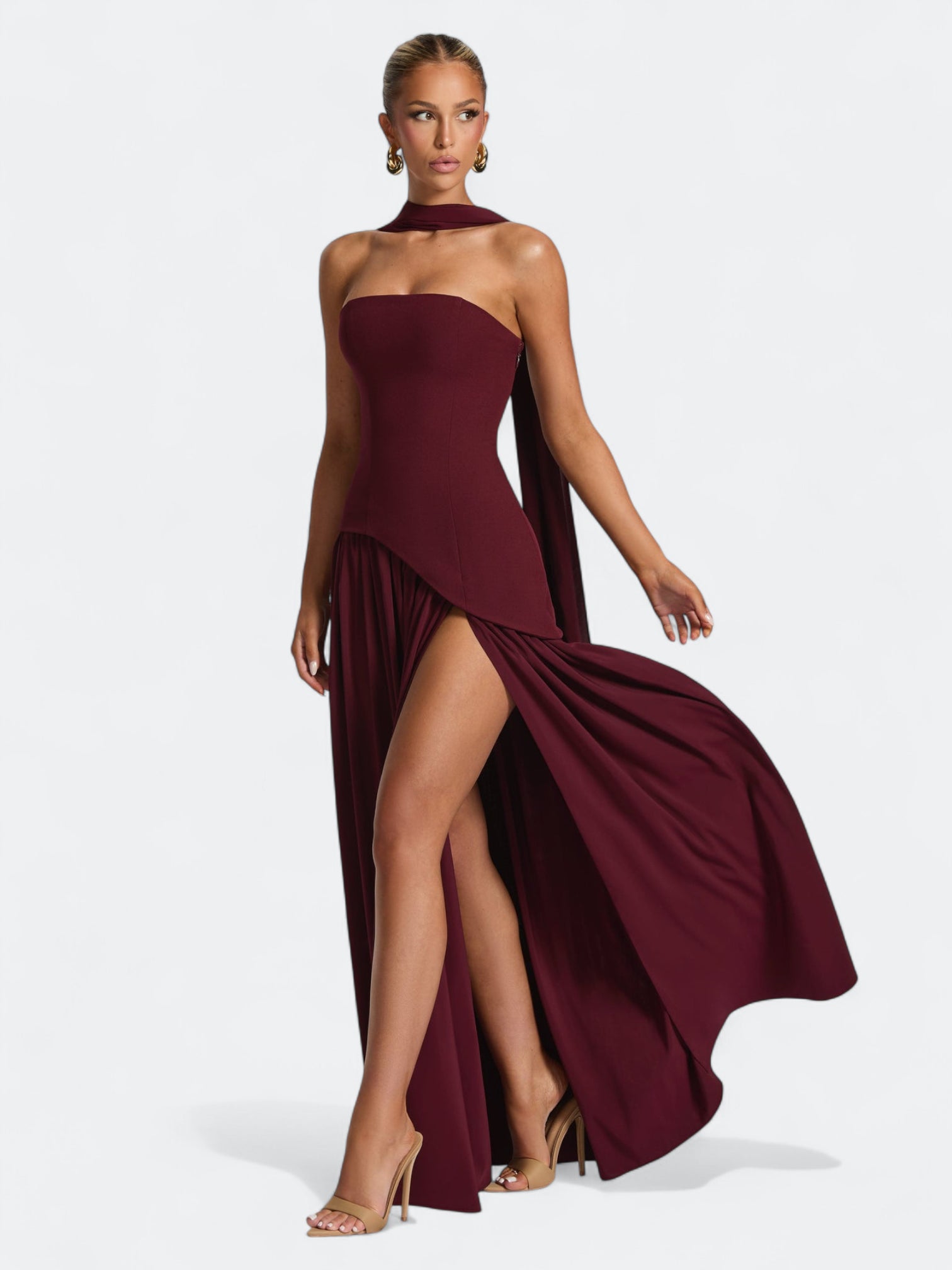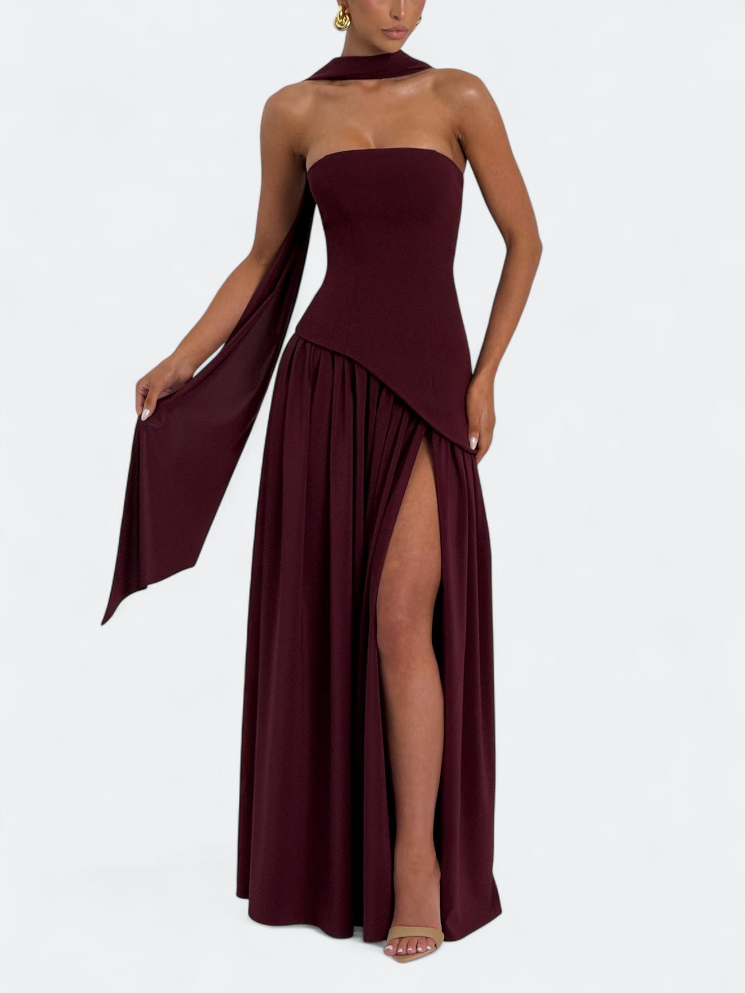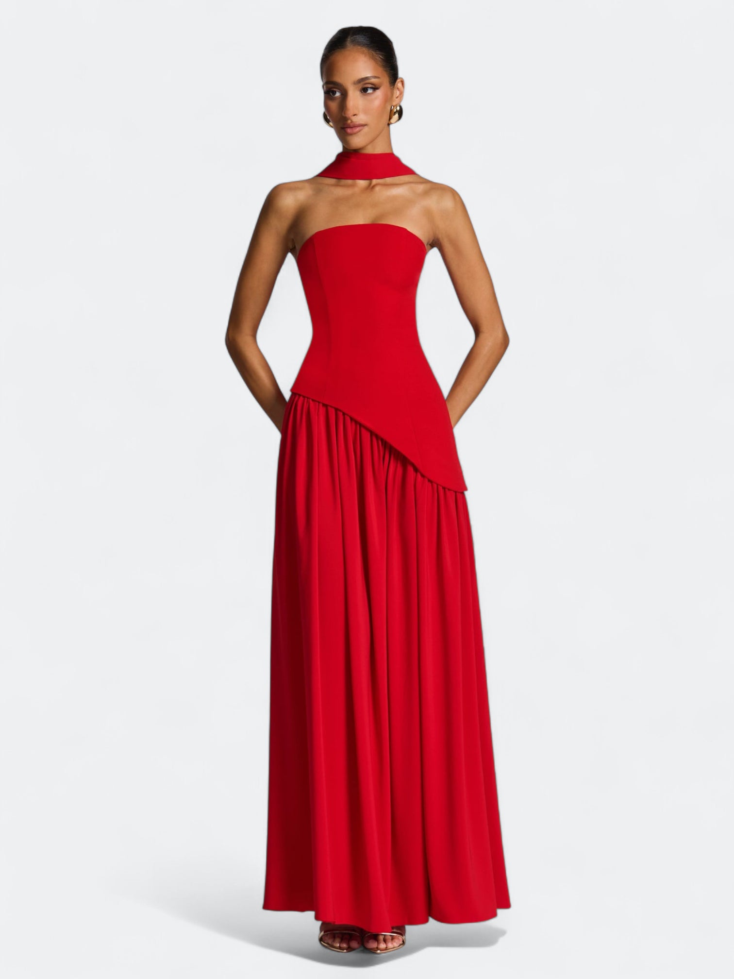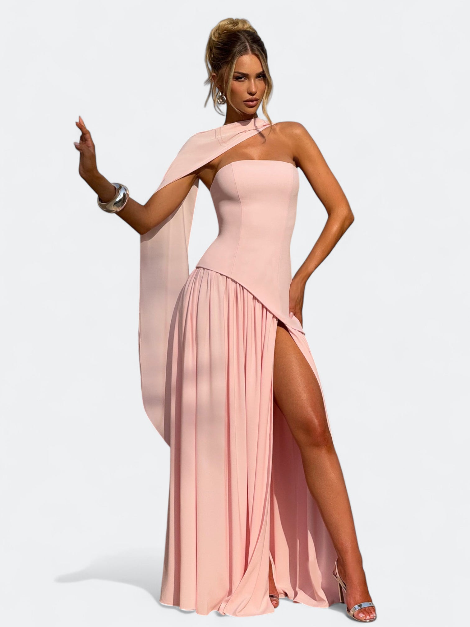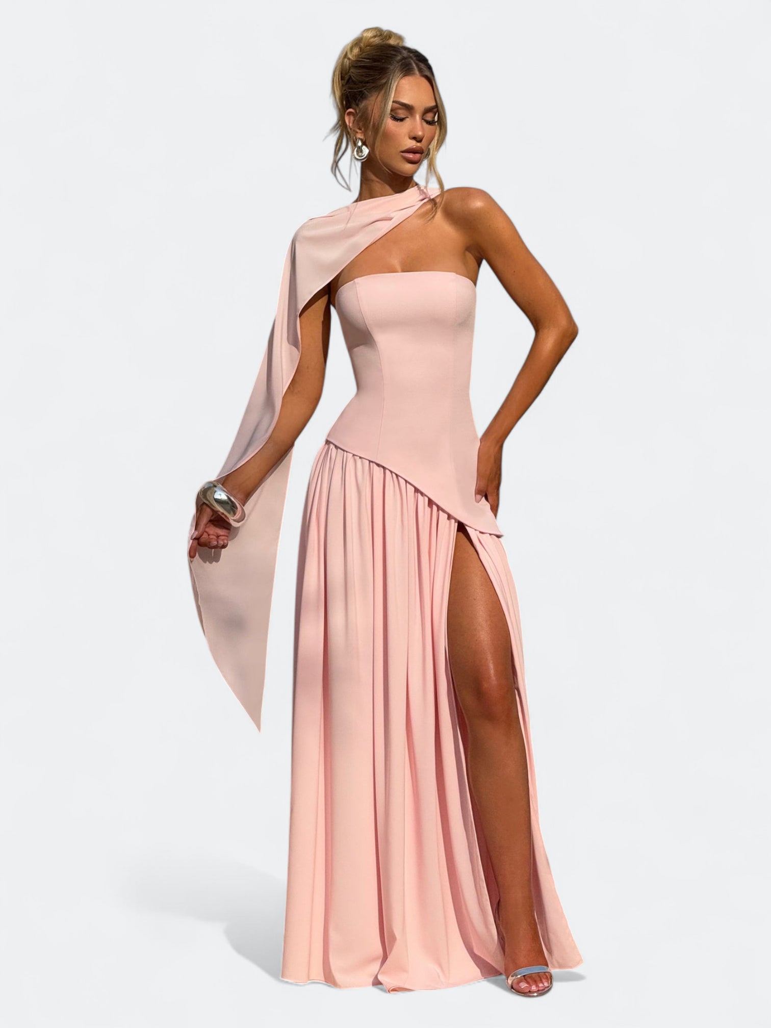 Lunara łączy architekturę formy z kobiecą lekkością. Dopasowany gorset z gładkiej, matowej krepy subtelnie modeluje sylwetkę, a pełna, zwiewna spódnica z szyfonu miękko pracuje w ruchu. Asymetryczny dół i wysokie rozcięcie nadają nowoczesny charakter, a przewieszony przy szyi panel materiału dodaje miękkości. Zapięcie krytym zamkiem oraz wiązanie gorsetowe na plecach domykają czystą, elegancką linię.