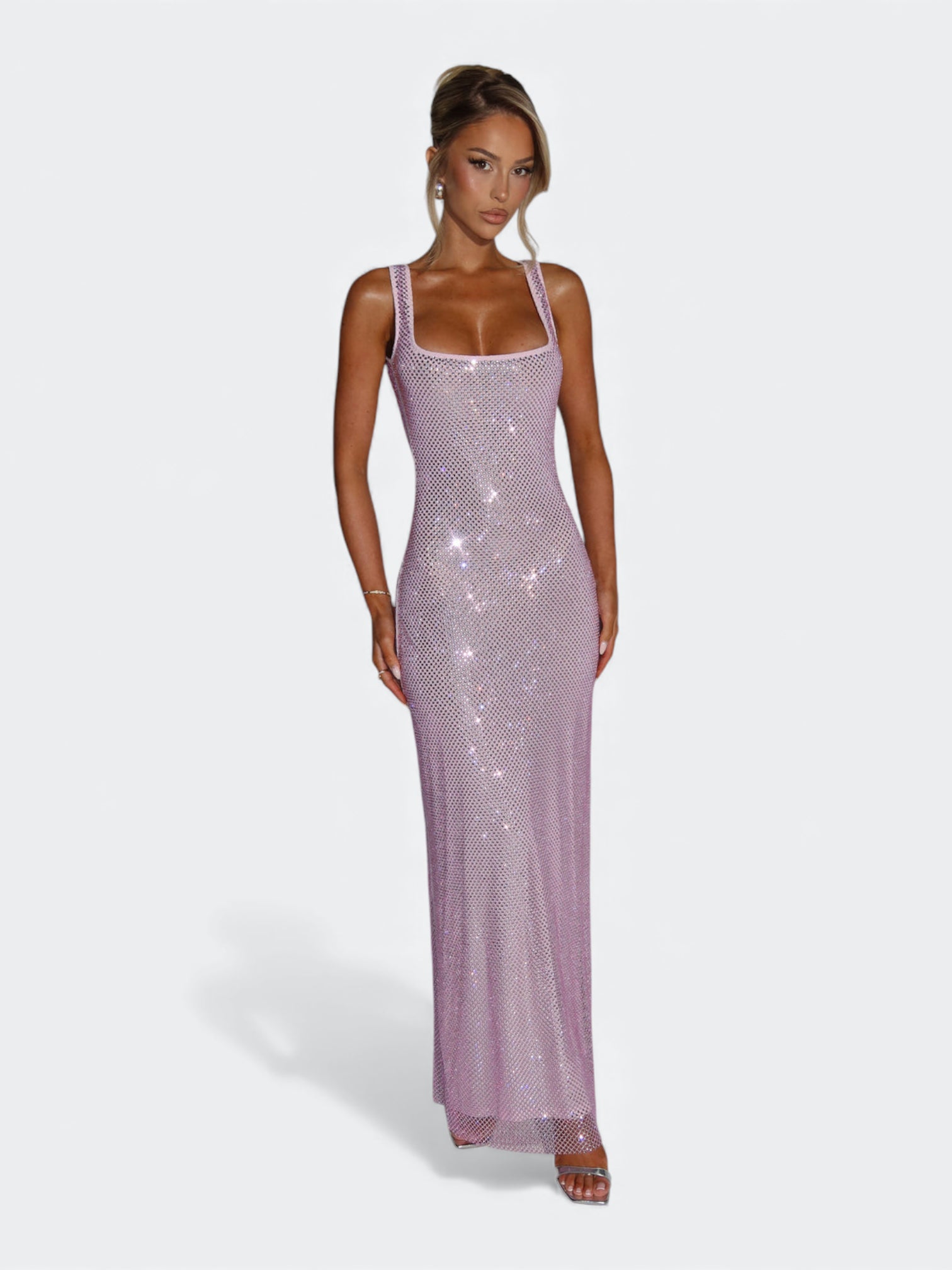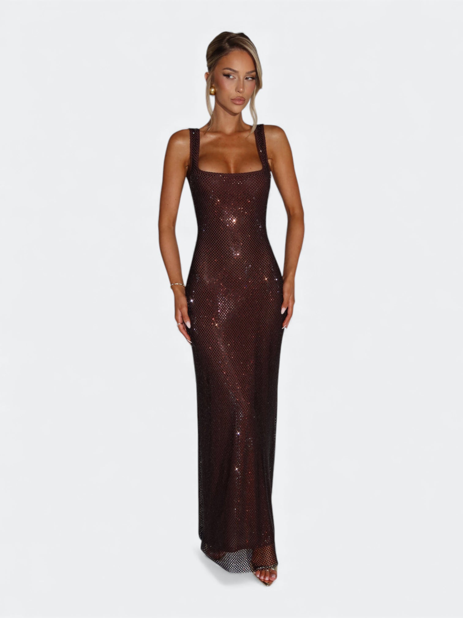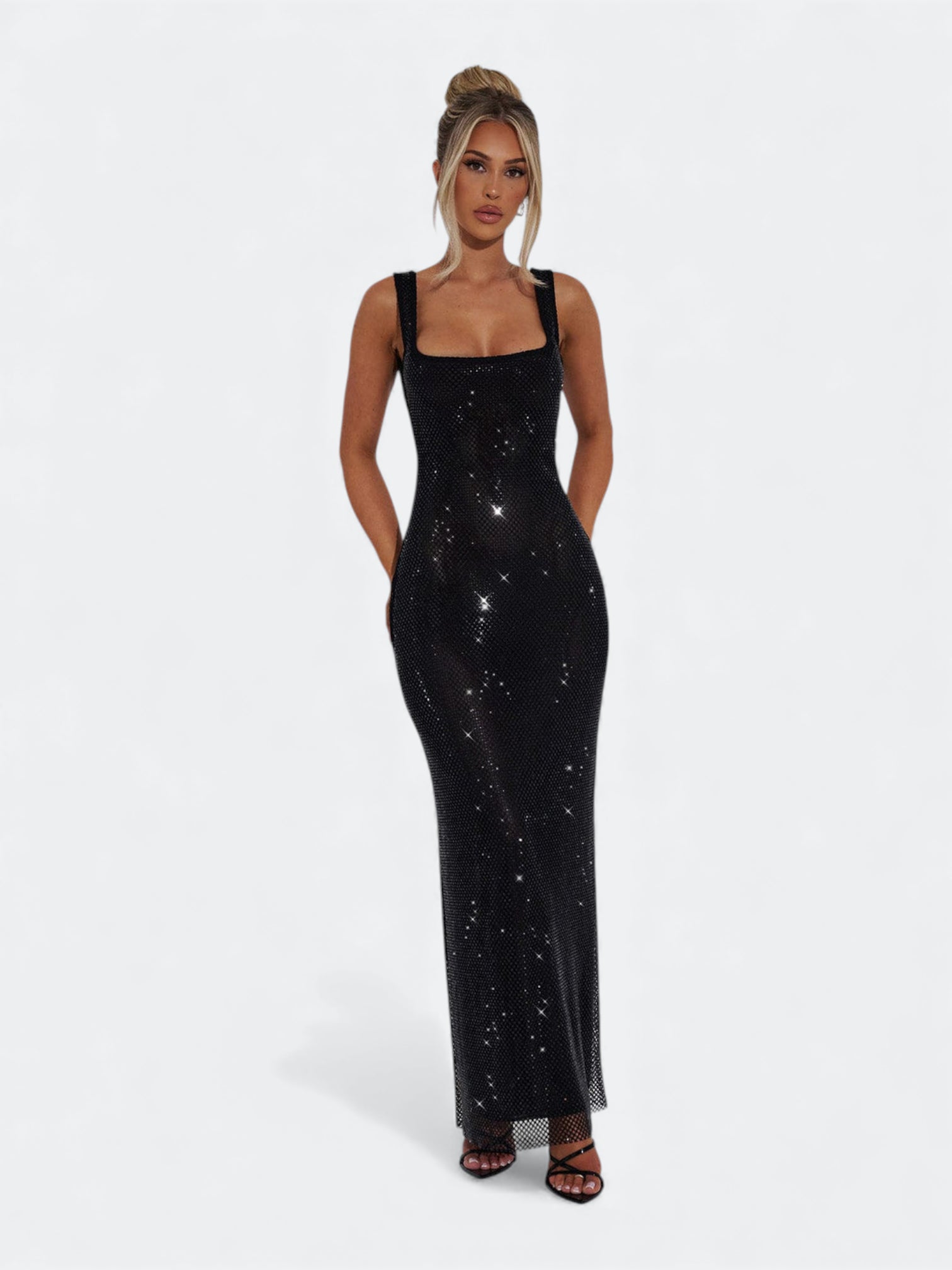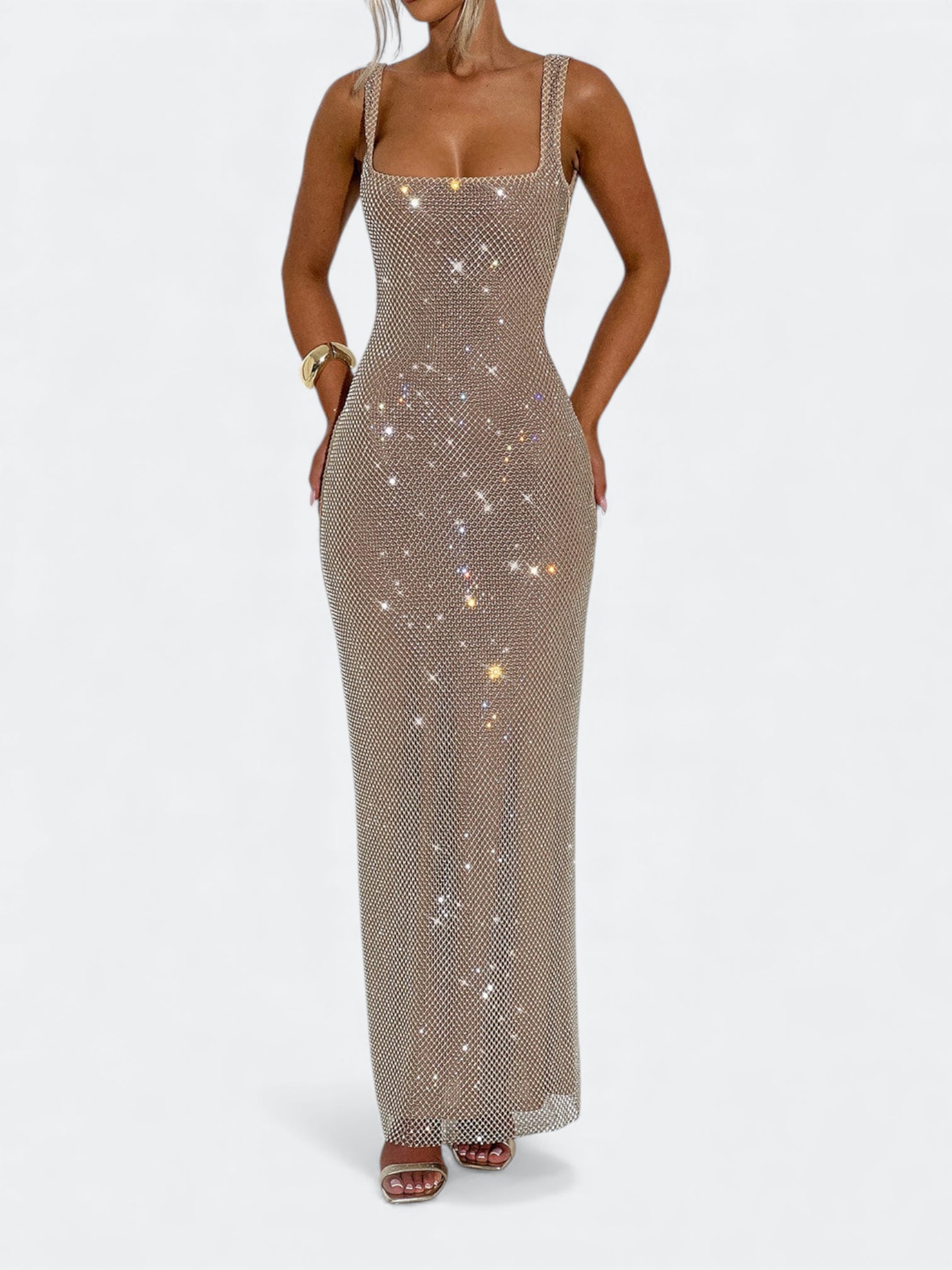 Fason stworzony na wieczory, które mają robić wrażenie od pierwszego kroku. Dopasowana konstrukcja podkreśla linię talii i bioder, a delikatnie transparentna siateczka z drobną aplikacją tworzy efekt subtelnego, świetlistego połysku w ruchu. Dekolt w kształcie kwadratu pięknie otwiera linię ramion, a obniżony tył dodaje lekkości i zmysłowości. To sukienka idealna na gale, wyjątkowe uroczystości i wieczorne wyjścia, gdy liczy się pełna, elegancka prezencja.