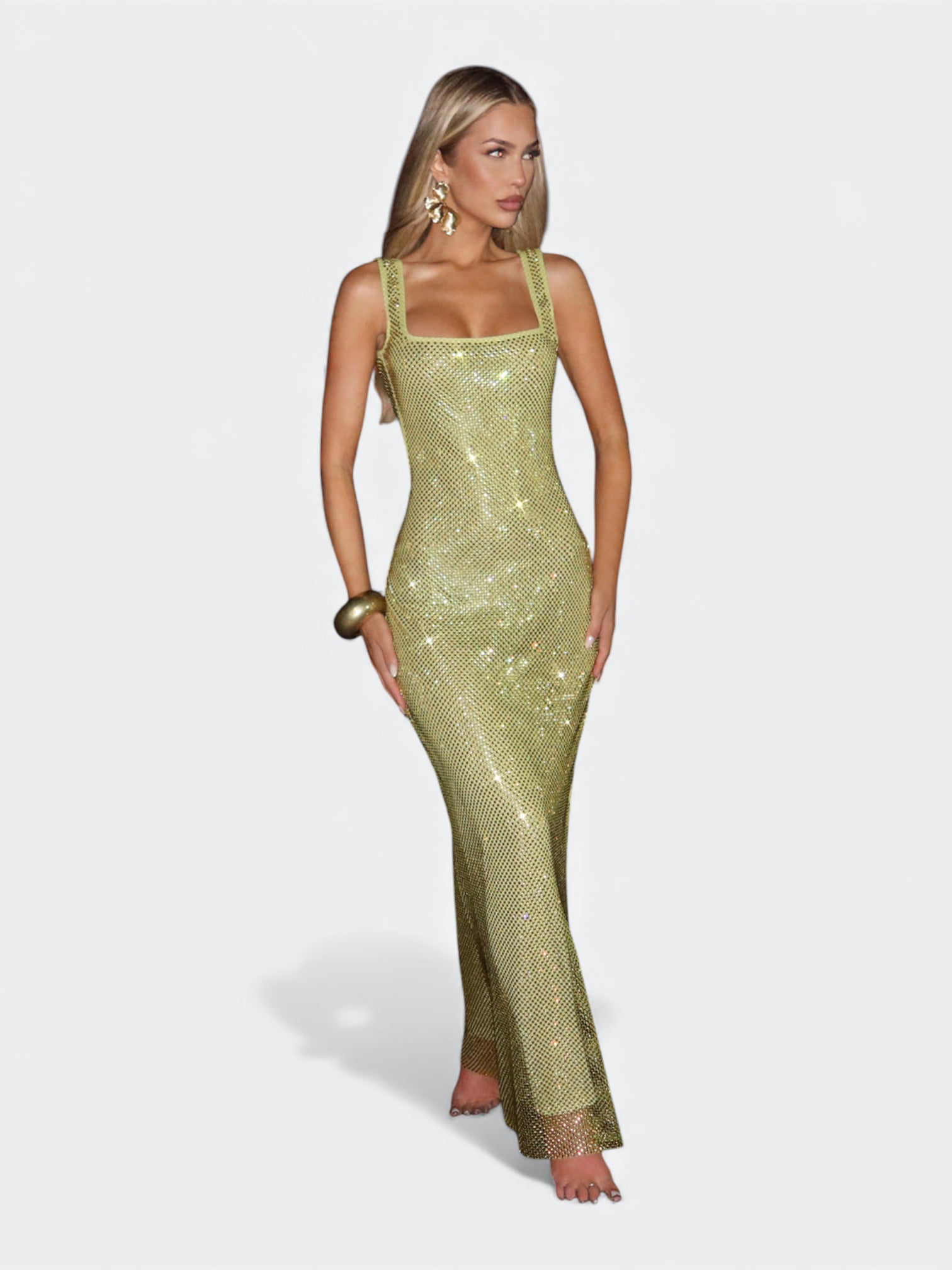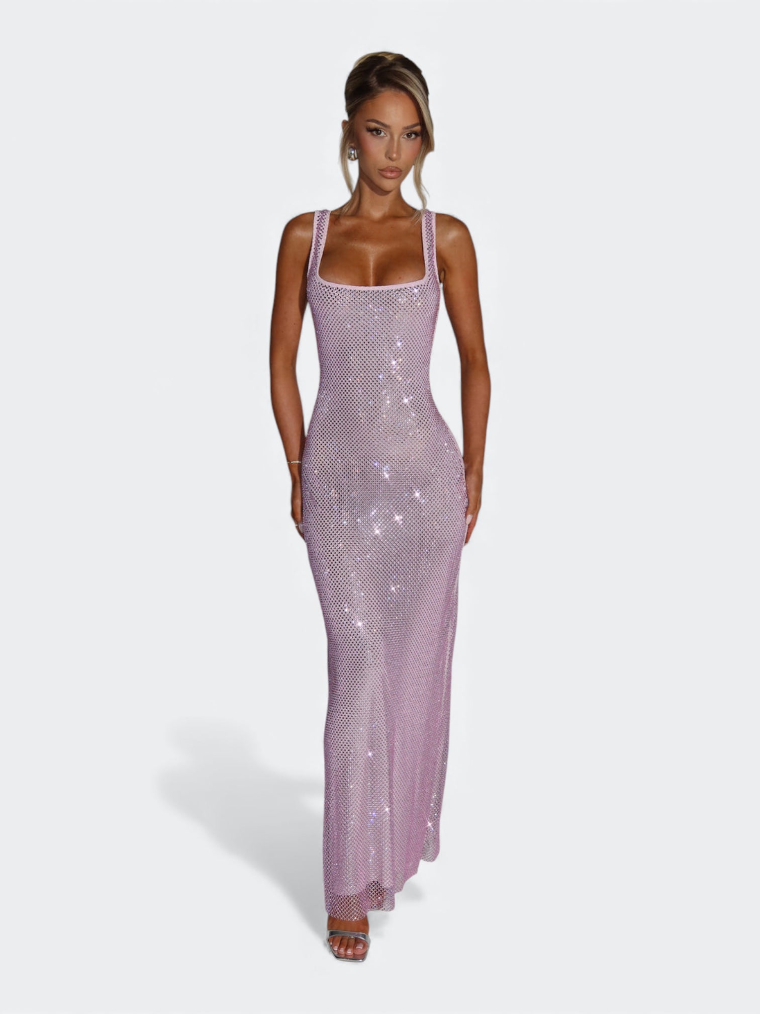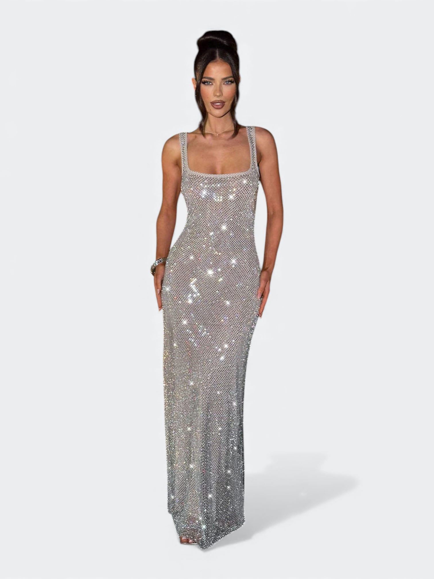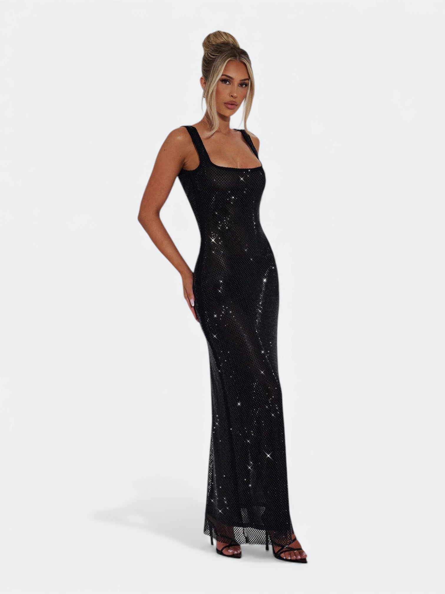 Fason stworzony na wieczory, które mają robić wrażenie od pierwszego kroku. Dopasowana konstrukcja podkreśla linię talii i bioder, a delikatnie transparentna siateczka z drobną aplikacją tworzy efekt subtelnego, świetlistego połysku w ruchu. Dekolt w kształcie kwadratu pięknie otwiera linię ramion, a obniżony tył dodaje lekkości i zmysłowości. To sukienka idealna na gale, wyjątkowe uroczystości i wieczorne wyjścia, gdy liczy się pełna, elegancka prezencja.