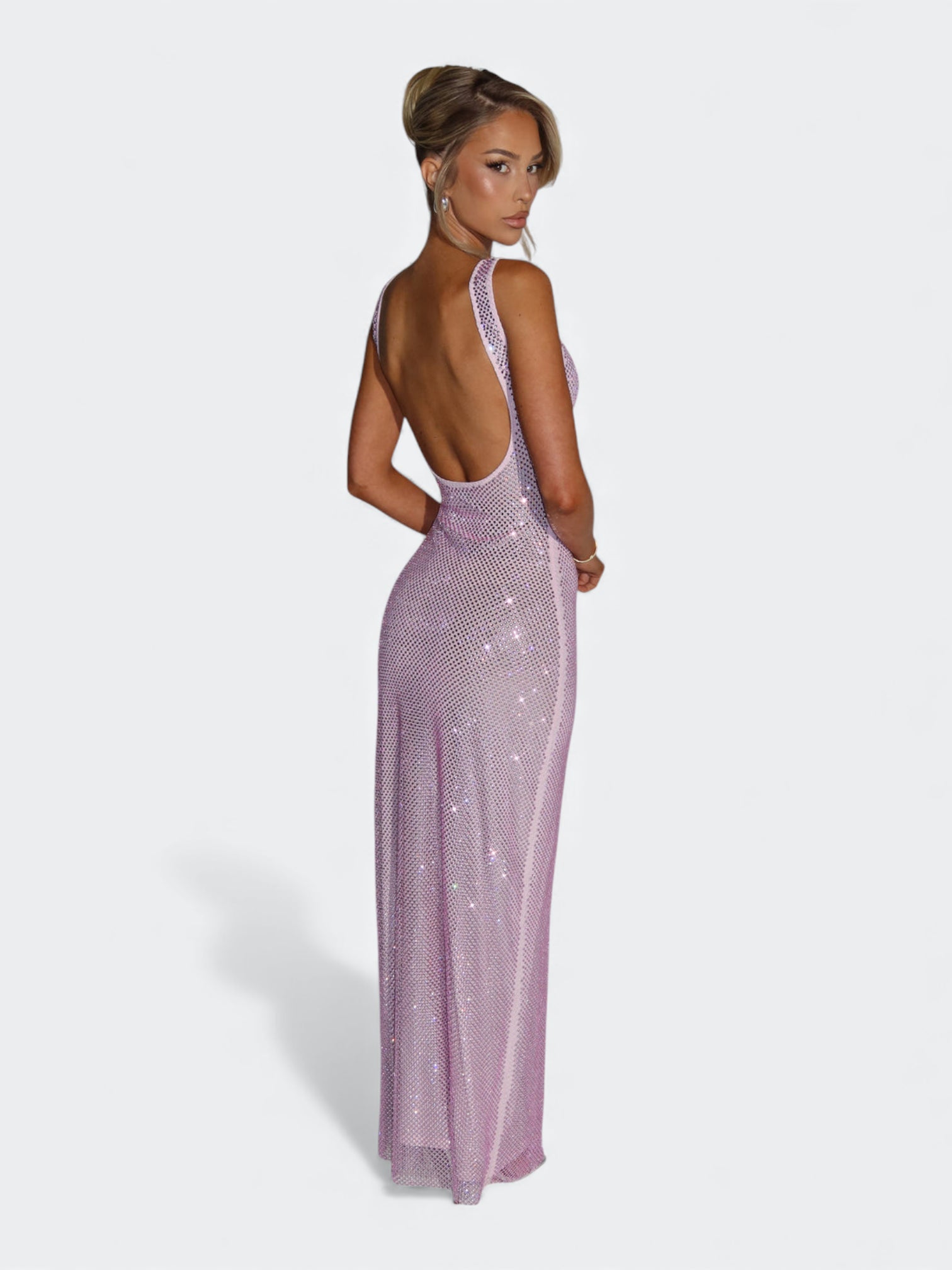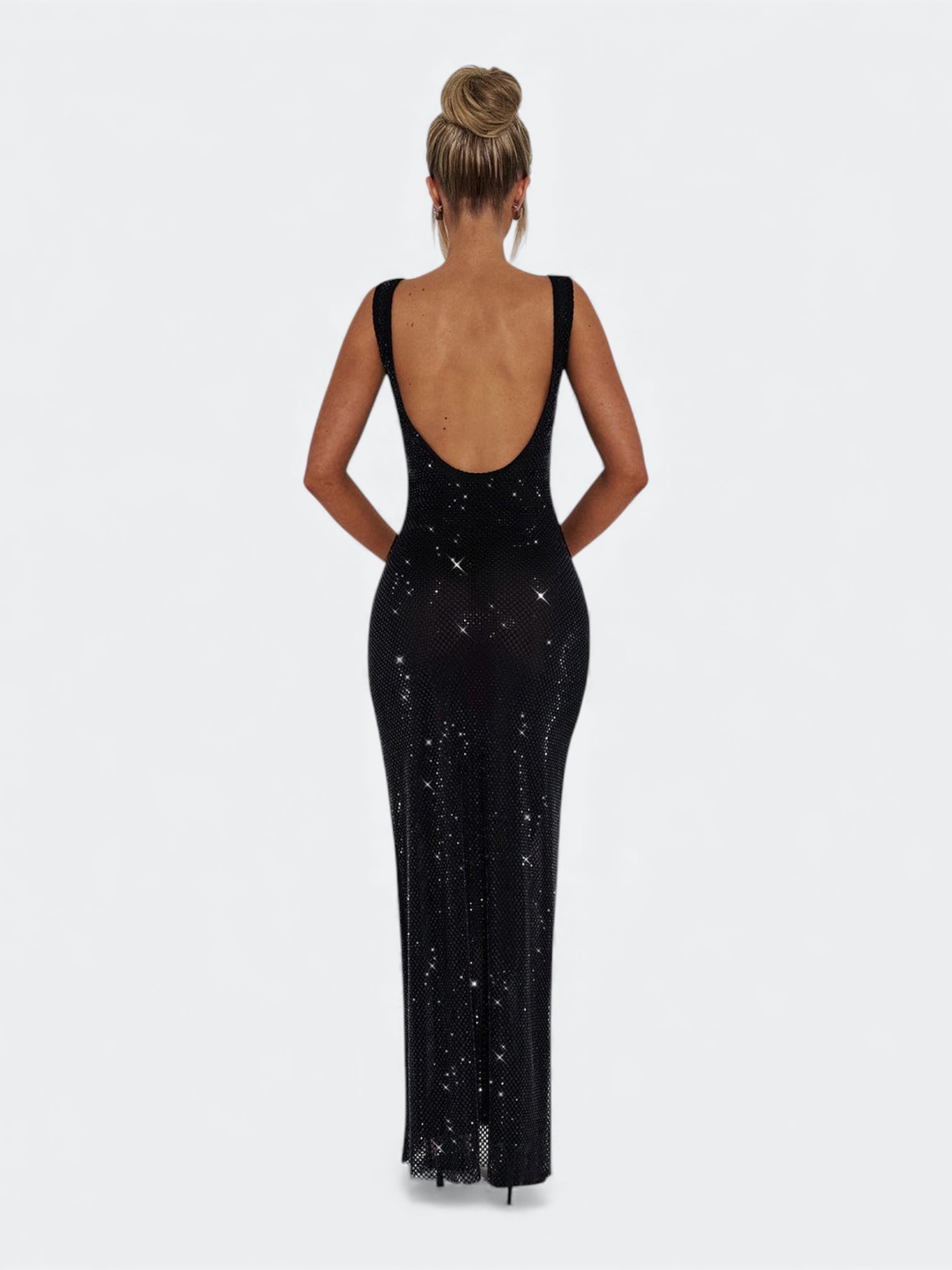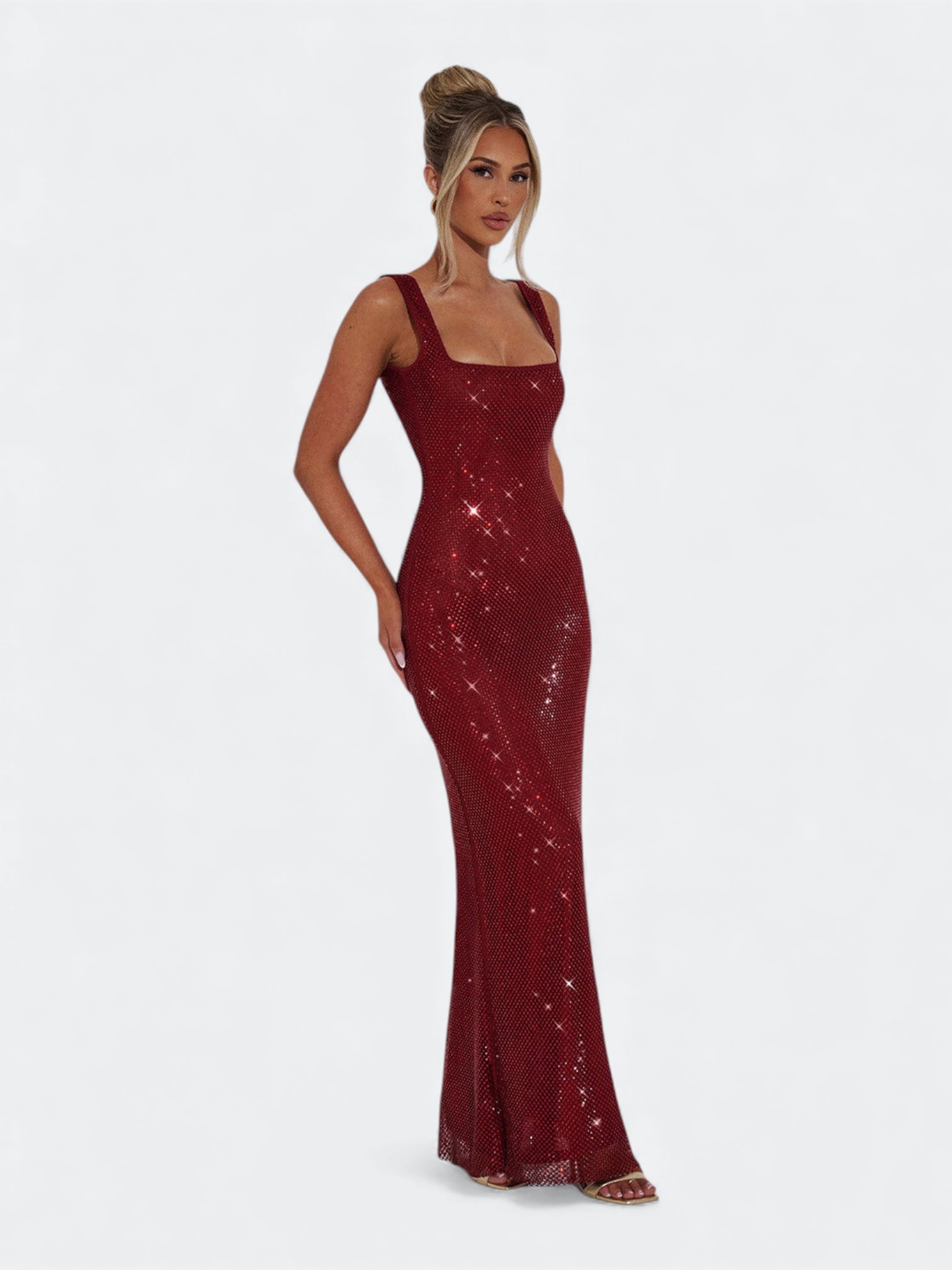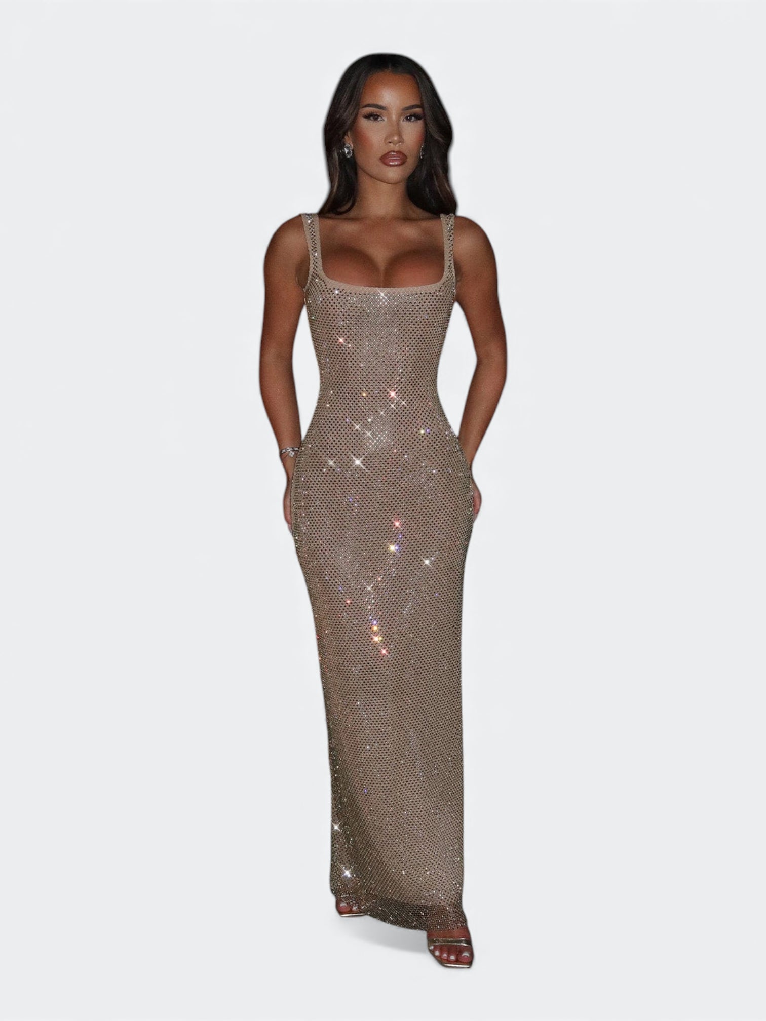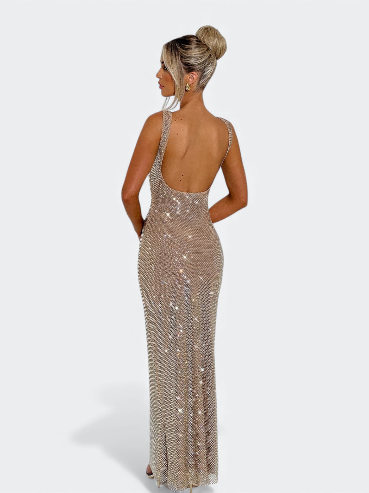 Fason stworzony na wieczory, które mają robić wrażenie od pierwszego kroku. Dopasowana konstrukcja podkreśla linię talii i bioder, a delikatnie transparentna siateczka z drobną aplikacją tworzy efekt subtelnego, świetlistego połysku w ruchu. Dekolt w kształcie kwadratu pięknie otwiera linię ramion, a obniżony tył dodaje lekkości i zmysłowości. To sukienka idealna na gale, wyjątkowe uroczystości i wieczorne wyjścia, gdy liczy się pełna, elegancka prezencja.
