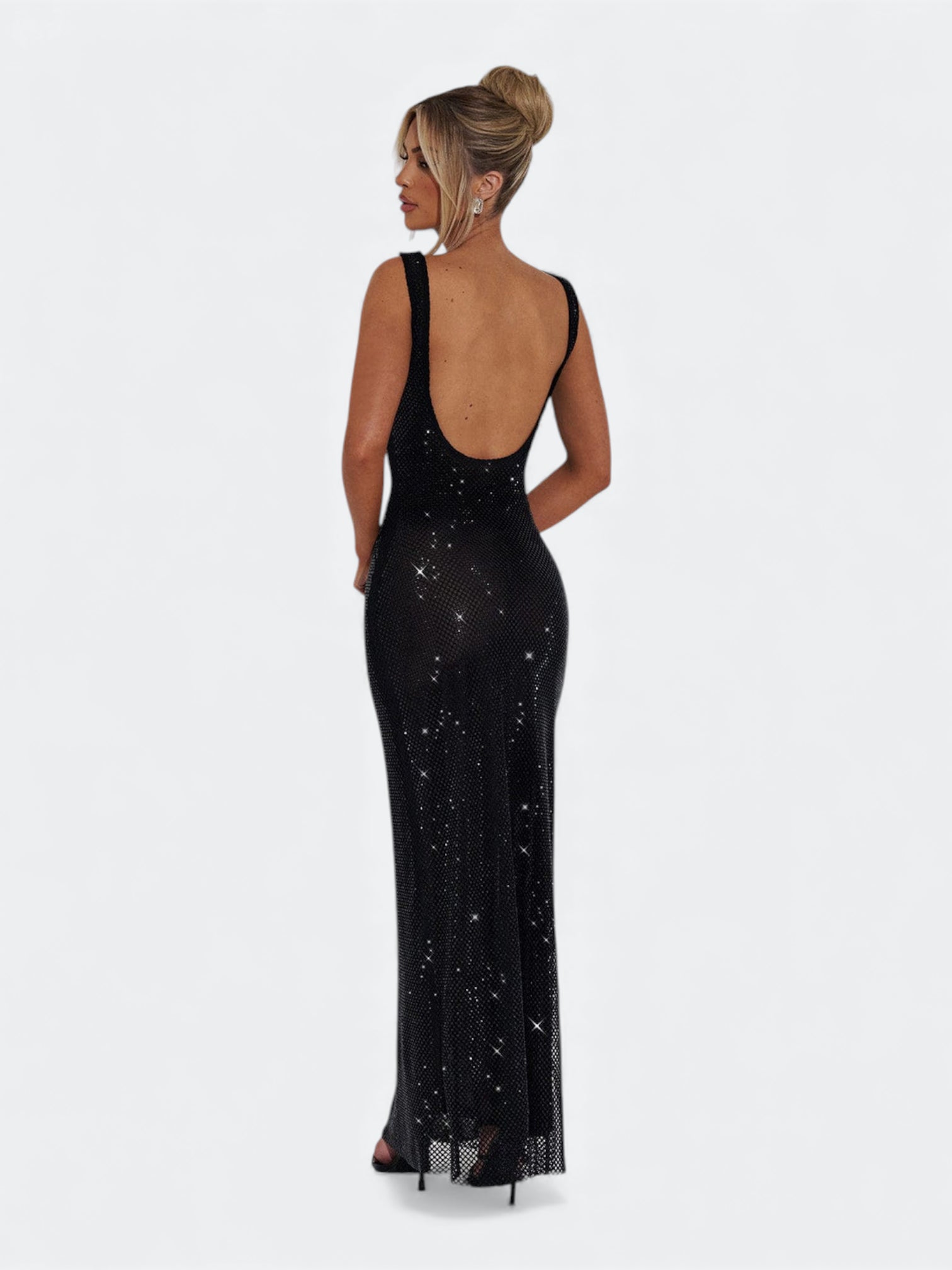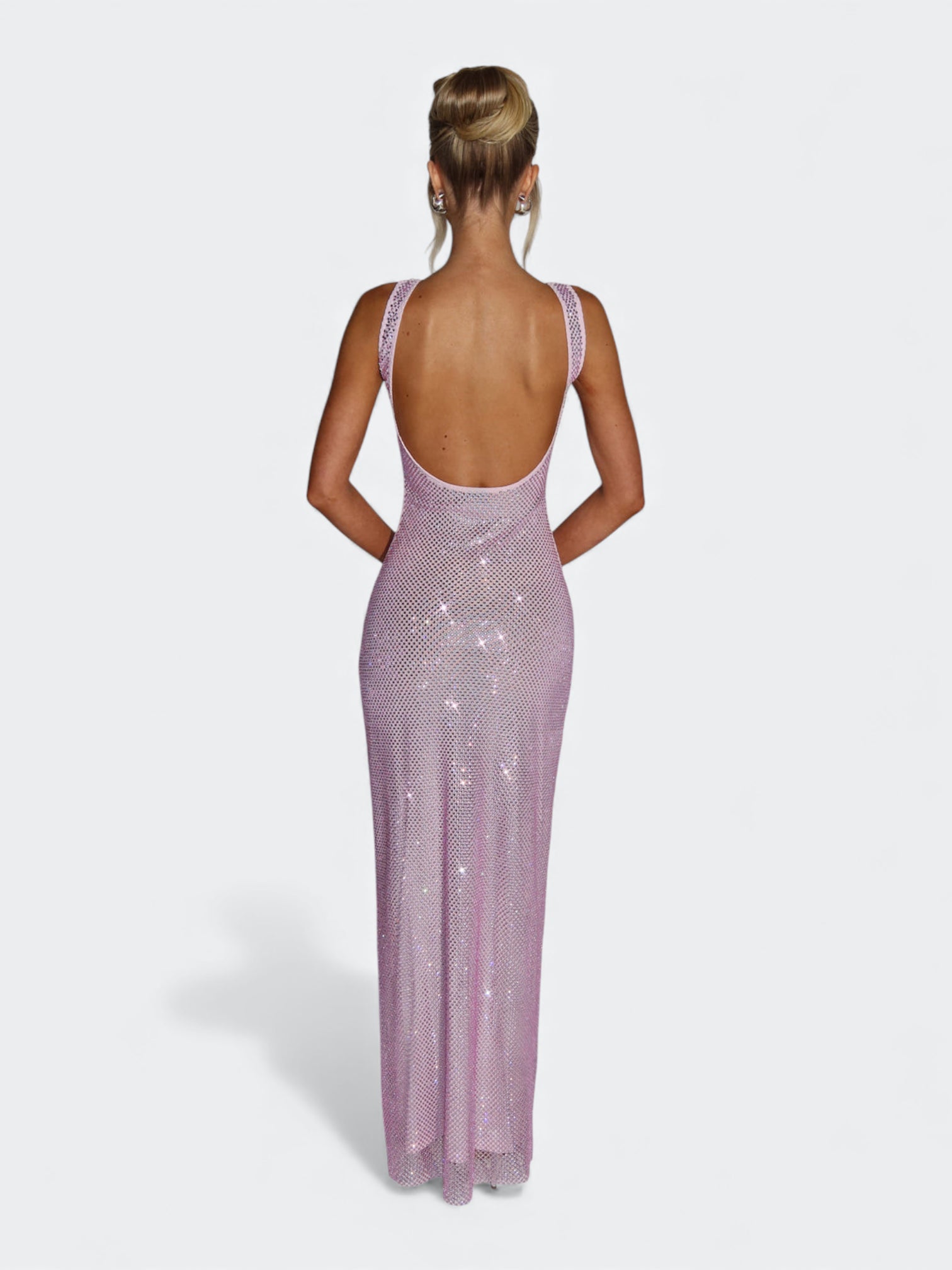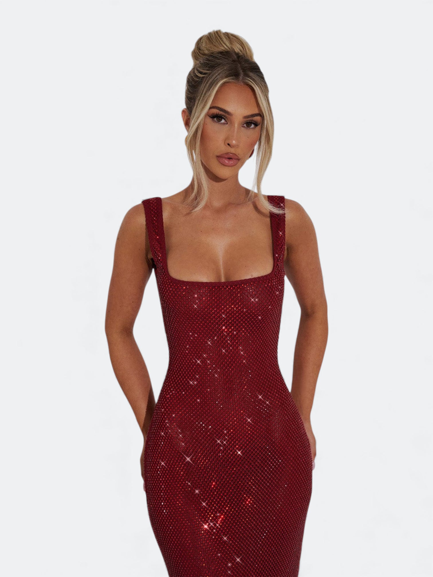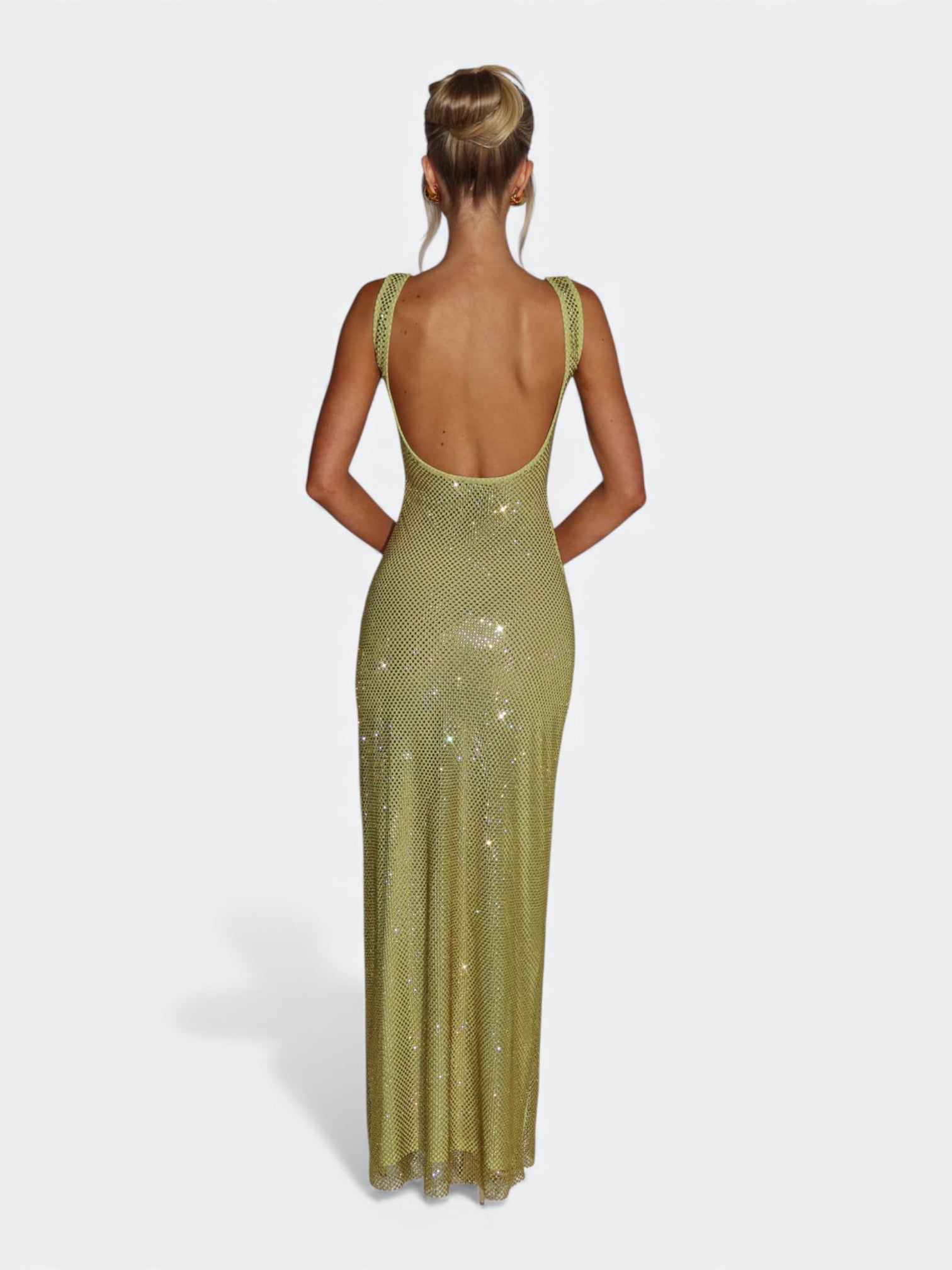 Fason stworzony na wieczory, które mają robić wrażenie od pierwszego kroku. Dopasowana konstrukcja podkreśla linię talii i bioder, a delikatnie transparentna siateczka z drobną aplikacją tworzy efekt subtelnego, świetlistego połysku w ruchu. Dekolt w kształcie kwadratu pięknie otwiera linię ramion, a obniżony tył dodaje lekkości i zmysłowości. To sukienka idealna na gale, wyjątkowe uroczystości i wieczorne wyjścia, gdy liczy się pełna, elegancka prezencja.