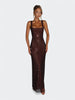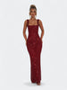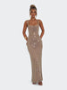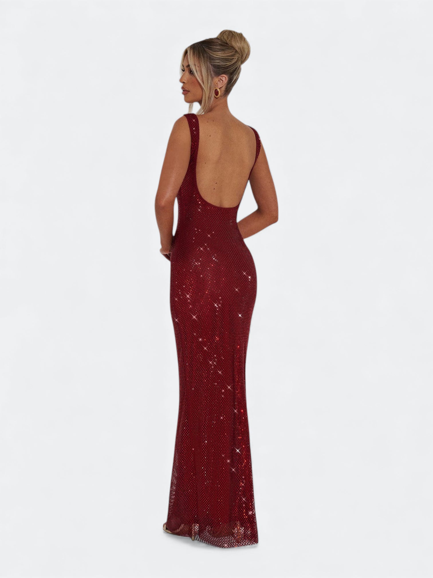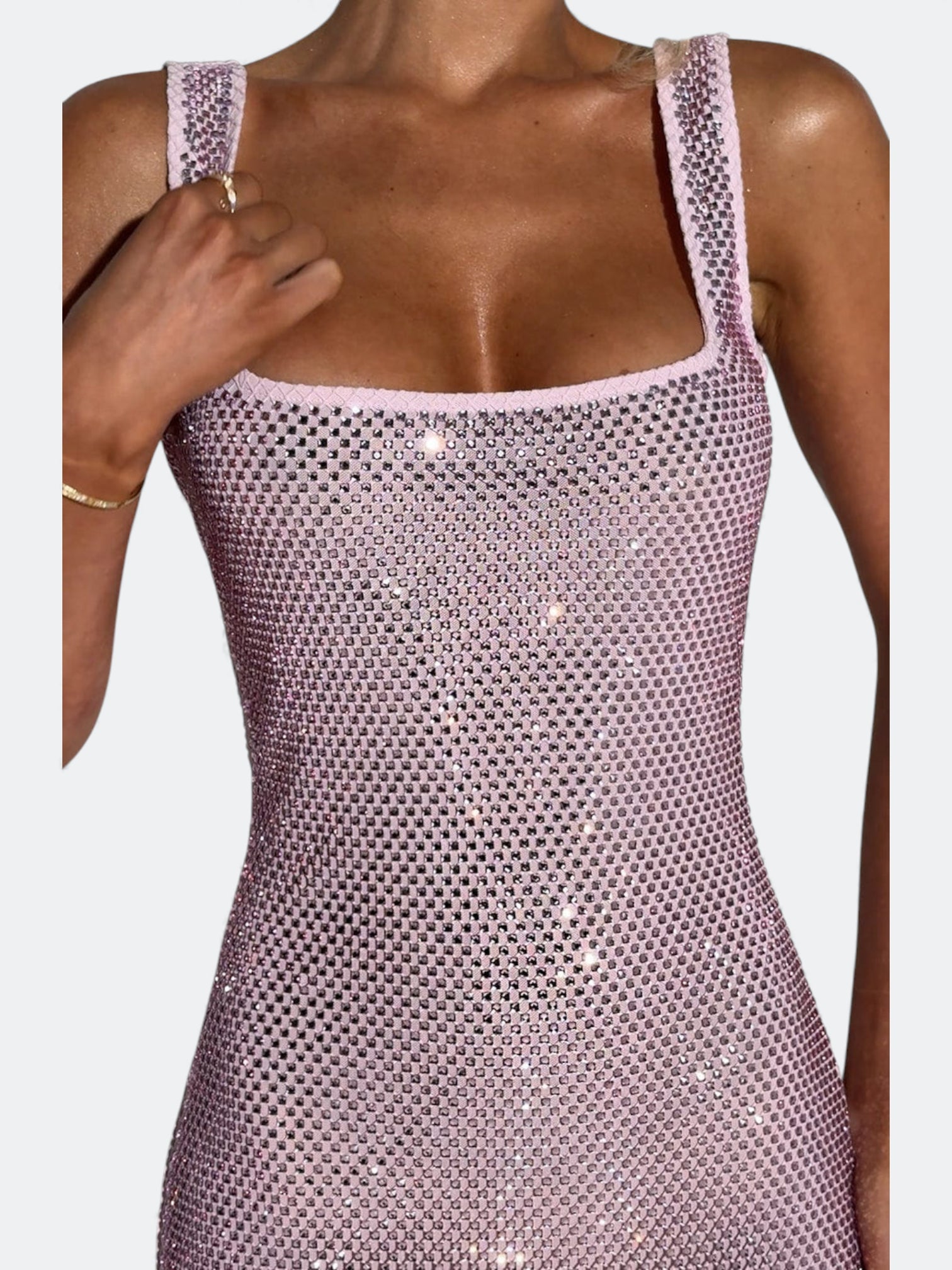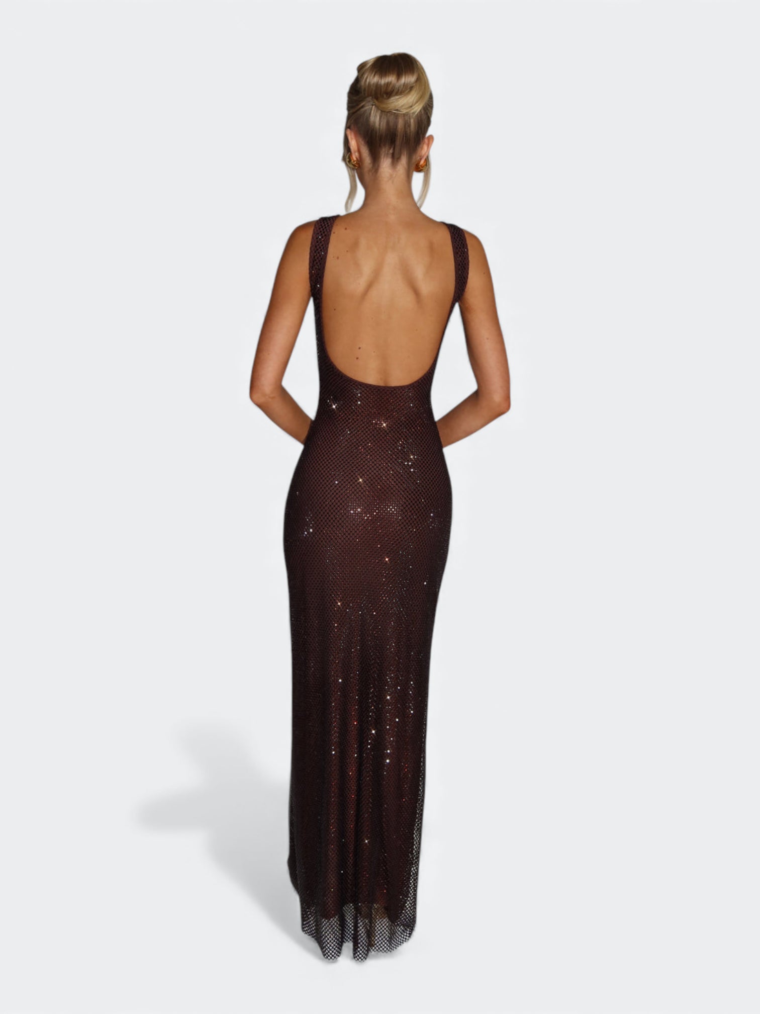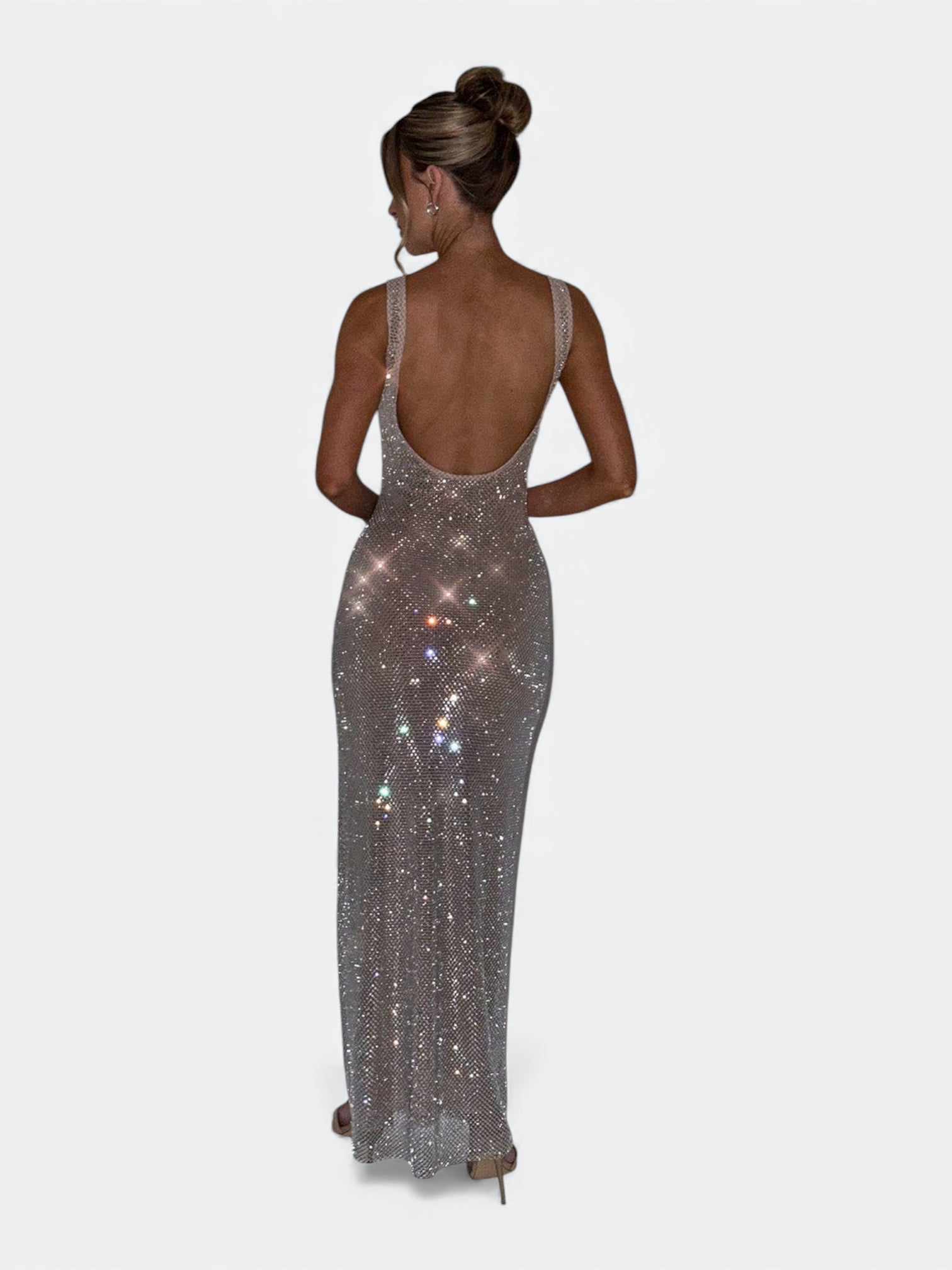 Fason stworzony na wieczory, które mają robić wrażenie od pierwszego kroku. Dopasowana konstrukcja podkreśla linię talii i bioder, a delikatnie transparentna siateczka z drobną aplikacją tworzy efekt subtelnego, świetlistego połysku w ruchu. Dekolt w kształcie kwadratu pięknie otwiera linię ramion, a obniżony tył dodaje lekkości i zmysłowości. To sukienka idealna na gale, wyjątkowe uroczystości i wieczorne wyjścia, gdy liczy się pełna, elegancka prezencja.